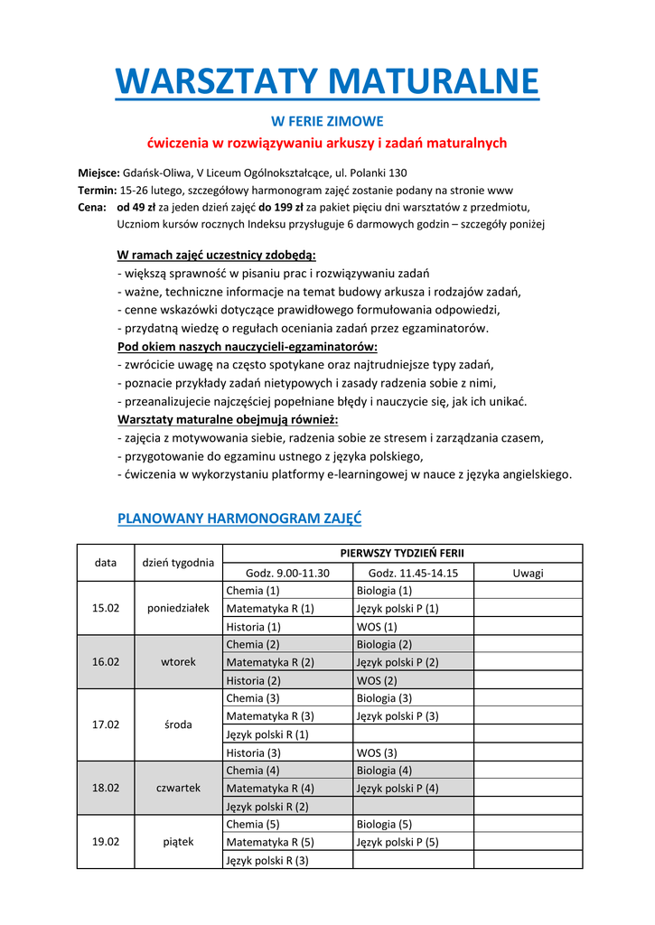 WARSZTATY MATURALNE W FERIE ZIMOWE ćwiczenia w rozwiązywaniu arkuszy i zadań maturalnych Miejsce: Gdańsk-Oliwa, V Liceum Ogólnokształcące, ul. Polanki 130 Termin: 15-26 lutego, szczegółowy harmonogram zajęć zostanie podany na stronie www Cena: od 49 zł za jeden dzień zajęć do 199 zł za pakiet pięciu dni warsztatów z przedmiotu, Uczniom kursów rocznych Indeksu przysługuje 6 darmowych godzin – szczegóły poniżej W ramach zajęć uczestnicy zdobędą: - większą sprawność w pisaniu prac i rozwiązywaniu zadań - ważne, techniczne informacje na temat budowy arkusza i rodzajów zadań, - cenne wskazówki dotyczące prawidłowego formułowania odpowiedzi, - przydatną wiedzę o regułach oceniania zadań przez egzaminatorów. Pod okiem naszych nauczycieli-egzaminatorów: - zwrócicie uwagę na często spotykane oraz najtrudniejsze typy zadań, - poznacie przykłady zadań nietypowych i zasady radzenia sobie z nimi, - przeanalizujecie najczęściej popełniane błędy i nauczycie się, jak ich unikać. Warsztaty maturalne obejmują również: - zajęcia z motywowania siebie, radzenia sobie ze stresem i zarządzania czasem, - przygotowanie do egzaminu ustnego z języka polskiego, - ćwiczenia w wykorzystaniu platformy e-learningowej w nauce z języka angielskiego. PLANOWANY HARMONOGRAM ZAJĘĆ data dzień tygodnia 15.02 poniedziałek 16.02 17.02 18.02 19.02 wtorek środa PIERWSZY TYDZIEŃ FERII Godz. 9.00-11.30 Chemia (1) Matematyka R (1) Godz. 11.45-14.15 Biologia (1) Język polski P (1) Historia (1) Chemia (2) Matematyka R (2) WOS (1) Biologia (2) Język polski P (2) Historia (2) Chemia (3) Matematyka R (3) WOS (2) Biologia (3) Język polski P (3) Język polski R (1) czwartek Historia (3) Chemia (4) Matematyka R (4) WOS (3) Biologia (4) Język polski P (4) piątek Język polski R (2) Chemia (5) Matematyka R (5) Biologia (5) Język polski P (5) Język polski R (3) Uwagi data dzień tygodnia 22.02 poniedziałek DRUGI TYDZIEŃ FERII Godz. 9.00-11.30 Matematyka P (1) wtorek 24.02 środa Matematyka P (3) Język angielski (Gim.) Matematyka P (4) 25.02 czwartek Motywacja, Stres, Zarządzanie czasem (1) Matematyka P (5) 26.02 piątek 28.02 niedziela Uwagi Geografia (1) Język polski P (2) Język angielski (2) Matematyka P (2) 23.02 Godz. 11.45-14.15 Język polski P (1) Język angielski (1) Motywacja, Stres, Zarządzanie czasem (2) Geografia (2) Język polski USTNY (1) Geografia (3) Język polski USTNY (2) Geografia (4) Język polski USTNY (3) Geografia (5) Język polski GRAMATYKA, godz.10.00-14.30 (1) … (5) - numery kolejnych zajęć CENNIK WARSZTATÓW MATURALNYCH CENNIK WARSZTATÓW przedmiot Matematyka podstawowa Matematyka rozszerzona Język polski podstawowy (pisemny) + elem. gramatyki Język polski podstawowy pisemny + ustny planowany termin warsztatów (tydzień ferii) zajęcia 3-godz. (jeden dzień) pakiet zajęć (15 h, pon.-pt.) specjalne pakiety II tydzień 49 zł 199 zł 99 zł* I tydzień 49 zł 199 zł 99 zł* II tydzień - - 99 zł (6 h) I tydzień 49 zł 199 zł 99 zł* Język polski rozszerzony (pisemny) I tydzień (innowacyjna edukacja) 69 zł - 199 zł (9 h) - zniżka 100 zł przy wyborze pakietu j.polski USTNY Język polski USTNY II tydzień (innowacyjna edukacja) 69 zł - 199 zł (9 h) Język angielski ćwiczenia multimedialne II tydzień 50 zł - 99 zł (6 h)** I tydzień Biologia I tydzień Chemia I tydzień Historia (m.in. PRL) I tydzień WOS II tydzień Geografia Psychologia i Matura 1. Sztuka motywowania siebie 2. Radzenie sobie ze stresem 3. Zarządzanie czasem 49 zł 49 zł 49 zł 49 zł 49 zł 199 zł 199 zł 199 zł 199 zł 199 zł 99 zł* 99 zł* 99 zł* 99 zł* 99 zł* Jednodniowe warsztaty czwartek/piątek w II tydzień ferii bezpłatnie dla osób, które wybiorą inne zajęcia w ferie o wartości minimum 199 zł *cena 99 zł za pakiet 15 godz. przysługuje uczestnikom kursu matura 2016, korzystającym z darmowych 6 godzin (ten sam przedmiot kursu i przedmiot warsztatów). ** przy wyborze pakietu język angielski, na wszystkie pozostałe pakiety w cenie 199 zł przysługuje zniżka 50 zł, o ile uczeń nie korzysta już ze zniżki z innego tytułu. WARUNKI UCZESTNICTWA I INFORMACJE ORGANIZACYJNE 1) Warsztaty maturalne przeznaczone są dla wszystkich chętnych, planujących zdawać maturę w roku 2016, niezależnie od uczestnictwa w regularnych kursach Indeksu. 2) Warsztaty maturalne z większości przedmiotów składają się z pięciu bloków zajęciowych, każdy blok obejmuje 3 godziny lekcyjne. Niektóre, specjalne pakiety obejmują trzy bloki zajęciowe. 3) Zainteresowani mogą zadeklarować udział w całym pakiecie warsztatów (15 godz. w cenie promocyjnej 199 zł) lub wybrać poszczególne zajęcia z oferty. 4) Uczniowie kursu do matury 2016 w Indeksie mają prawo do bezpłatnego udziału w 2 blokach zajęć warsztatowych (6 godzin lekcyjnych) z tego przedmiotu, z którego są na kursie, a kolejne zajęcia z tego przedmiotu mogą wykupić według cennika - pakiety specjalne lub pojedyncze zajęcia (patrz tabela powyżej). 5) Zgłoszenia na warsztaty przyjmujemy w Sekretariacie Indeksu (dane kontaktowe poniżej) lub przez formularz zgłoszeniowy dostępny na stronie internetowej. 6) Tematyka poszczególnych zajęć oraz inne informacje podane będą na stronie internetowej w zakładce dotyczącej warsztatów maturalnych. 7) Opłatę za warsztaty należy uiścić gotówką w Sekretariacie Indeksu lub przelewem na konto bankowe do dnia 15 lutego 2016. 8) W przypadku wyczerpania limitu miejsc, o przyjęciu na listę uczestników warsztatów maturalnych decydować będzie kolejność zgłoszeń lub wpłat. 9) W przypadku niezorganizowania warsztatów z wybranego przedmiotu (np. z powodu braku chętnych) będzie możliwe wybranie zajęć warsztatowych z innego przedmiotu i wykorzystanie przysługującego darmowego limitu godzin. 10) Uczestnicy warsztatów (osoby, które zgłosiły się i opłaciły zajęcia) otrzymają z odpowiednim wyprzed