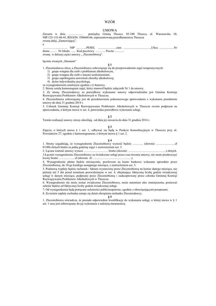 WZÓR UMOWA Zawarta w dniu …………… pomiędzy Gminą Tłuszcz, 05-240 Tłuszcz, ul. Warszawska 10, NIP:125-133-48-45, REGON: 550668166, reprezentowaną przezBurmistrza Tłuszcza zwaną dalej „Zamawiającą”, a ……………………. NIP ………..PESEL ……………….zam. ……………………….,Ulica ……………Nr domu ……. Nr lokalu ….. Kod pocztowy ………. Poczta ………. zwaną w dalszej części umowy ,, Zleceniobiorcą''. łącznie zwanych „Stronami” §1 1. Zleceniodawca zleca, a Zleceniobiorca zobowiązuje się do przeprowadzenia zajęć terapeutycznych: 1) grupa wstępna dla osób z problemem alkoholowym, 2) grupa wstępna dla osób z innymi uzależnieniami, 3) grupa zapobiegania nawrotom choroby alkoholowej, 4) dyżur indywidualny psychologa, za wynagrodzeniem ustalonym zgodnie z § 4umowy. 2. Strony ustalą harmonogram zajęć, który stanowił będzie załącznik Nr 1 do umowy. 3. Ze strony Zleceniodawcy za prawidłowe wykonanie umowy odpowiedzialna jest Gminna Komisja Rozwiązywania Problemów Alkoholowych w Tłuszczu. 4. Zleceniobiorca zobowiązany jest do przedstawienia jednorazowego sprawozdania z wykonania przedmiotu umowy do dnia 31 grudnia 2014 r. 5. Członek Gminnej Komisji Rozwiązywania Problemów Alkoholowych w Tłuszczu swoim podpisem na sprawozdaniu, o którym mowa w ust. 4, potwierdza prawidłowe wykonanie usługi. §2 Termin realizacji umowy strony określają –od dnia jej zawarcia do dnia 31 grudnia 2014 r. §3 Zajęcia, o których mowa § 1 ust. 1, odbywać się będą w Punkcie Konsultacyjnym w Tłuszczu przy ul. Powstańców 27, zgodnie z harmonogramem, o którym mowa § 1 ust. 2. §4 1. Strony uzgadniają, że wynagrodzenie Zleceniobiorcy wynosić będzie ……….. (słownie: ……………….zł 0/100) złotych brutto za jedną godzinę zajęć z zastrzeżeniem ust. 3. 2. Łączna wartość umowy wynosi ……………………. brutto (słownie: ………………………………...) złotych. 3.Łącznie wynagrodzenie Zleceniobiorcy za świadczone usługi przez czas trwania umowy, nie może przekroczyć kwoty brutto ……………. zł (słownie zł: …………………………………). 4. Wynagrodzenie płatne będzie miesięcznie, przelewem na konto bankowe wskazane uprzednio przez Zleceniobiorcę, do 10-go każdego następnego miesiąca, z zastrzeżeniem ust. 5. 5. Podstawą wypłaty będzie rachunek / faktura wystawiony przez Zleceniobiorcę na koniec danego miesiąca, nie później niż 5 dni przed terminem przewidzianym w ust. 4, obejmujący faktyczną liczbę godzin świadczonej usługi w danym miesiącu, podpisany przez Zleceniobiorcę i zaakceptowany przez członka Gminnej Komisji Rozwiązywania Problemów Alkoholowych w Tłuszczu. 6. Wynagrodzenie nie może zostać zwiększone Zleceniobiorcy, może natomiast ulec zmniejszeniu, ponieważ zależeć będzie od faktycznej liczby godzin świadczonej usługi. 7. Od wynagrodzenia będą potrącane należności publicznoprawne, zgodnie z obowiązującymi przepisami. 8. Za termin zapłaty rachunku uznaje się dzień obciążenia rachunku Zleceniodawcy. §5 1. Zleceniobiorca oświadcza, że posiada odpowiednie kwalifikacje do wykonania usługi, o której mowa w § 1 ust. 1 oraz jest zobowiązany do jej wykonania z należytą starannością. 2. Zleceniobiorca wyraża zgodę na przetwarzanie danych osobowych na potrzeby umowy, zgodnie z ustawą z dnia 29 sierpnia 1997 r. o ochronie danych osobowych (Dz. U. z 2002 r. Nr 101, poz. 926 z póź. zm.). §6 1. Zleceniobiorca nie jest podporządkowany Zleceniodawcy oraz przedmiot umowy nie będzie wykonywany pod kierownictwem Zleceniodawcy. 2. Zleceniodawca pouczył i poinformował Zleceniobiorcę o różnicach pomiędzy umową o pracę, a umową zlecenia, co niniejszym Zleceniobiorca przyjmuje do wiadomości i akceptuje. 3. Niniejsza umowa nie wywołuje skutków w zakresie określonym w kodeksie pracy. §7 1. Zleceniobiorca zapłaci Zleceniodawcy karę umowną za każdy dzień nieświadczenia usługi zgodnie z postanowieniami umowy w wysokości 1 % łącznej wartości umowy, o której mowa w § 4 ust. 2. 2. Zleceniobiorca zapłaci Zleceniodawcy karę umowną w przypadku odstąpienia od umowy przez Zleceniodawcę z winy Zleceniobiorcy lub nieuzasadnionego odstąpienia od umowy przez Zleceniobiorcę, w wysokości 10 % łącznej wartości umowy, o której mowa w § 4 ust. 2. 3. Przewidziane w niniejszym paragrafie kary umowne nie wyłączają możliwości dochodzenia przez Zleceniodawcę odszkodowania przewyższającego wysokość kar umownych na zasadach ogólnych zawartych w kodeksie cywilnym. 4. Zleceniobiorca wyraża zgodę na potrącenie przez Zleceniodawcę kar umownych z wynagrodzenia zleceniobiorcy. 5. Zleceniodawca zapłaci Zleceniobiorcy odsetki ustawowe za zwłokę w zapłacie rachunku. §8 1. Zleceniobiorca nie może powierzyć wykonania zobowiązań wynikających z niniejszej umowy innej osobie bezzgody Zleceniodawcy. 2. W przypadku nieświadczenia usługi, dopuszcza się możliwość odpracowania godzin przez Zleceniobiorcę w inny dzień, po uprzednim uzgodnieniu ze Zleceniodawcą. §9 1. Umowa może być rozwiązana przez każdą ze stron z zachowaniem miesięcznego okresu wypowiedzenia. 2. Zleceniodawca może wypowiedzieć niniejszą umowę ze skutkiem natychmiastowym w razie rażącego naruszenia jej postanowień przez Zleceniobiorcę. 3. Zleceniodawca przewiduje możliwość zmniejszenia wymiaru liczby godzin w stosunku do treści otrzymanej oferty. § 10 1. W sprawach nieuregulowanych niniejszą umową, mają zastosowanie przepisy Kodeksu Cywilnego oraz ustawa Prawo zamówień publicznych. 2. Wszelkie zmiany i uzupełnienia treści umowy wymagają formy pisemnej, pod rygorem nieważności. 3. Ewentualne spory wynikające z umowy, rozstrzygane będą przez sądy powszechne właściwe dla siedziby Zleceniodawcy. § 11 Umowę sporządzono w czterech jednobrzmiących egzemplarzach, trzy dla Zle