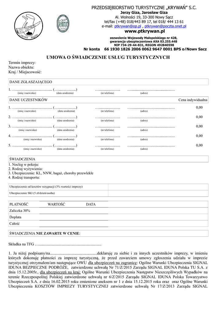 PRZEDSIĘBIORSTWO TURYSTYCZNE „KRYWAŃ” S.C. Jerzy Giza, Jarosław Giza Al. Wolności 19, 33-300 Nowy Sącz tel/fax (+48) 018/443 89 17, tel 018/ 444 13 61 e-mail: [email protected] , [email protected] www.ptkrywan.pl zezwolenie Wojewody Małopolskiego nr 428, gwarancja ubezpieczeniowa AXA 03.255.448 NIP 734-29-44-831, REGON 492840598 Nr konta 66 1930 1826 2006 0062 9647 0001 BPS o/Nowy Sącz UMOWA O ŚWIADCZENIE USŁUG TURYSTYCZNYCH Termin imprezy: Nazwa obiektu: Kraj / Miejscowość: DANE ZGŁASZAJĄCEGO 1. …....................................... (…...................) (imię i nazwisko) …....................... (data urodzenia) (nr telefonu) …............................................... (adres) DANE UCZESTNIKÓW Cena indywidualna 1. …....................................... (…...................) (imię i nazwisko) …....................... (data urodzenia) (nr telefonu) 2. …....................................... (…...................) (imię i nazwisko) …....................... (data urodzenia) (nr telefonu) 3. …....................................... (…...................) (imię i nazwisko) …....................... (data urodzenia) (nr telefonu) 4. …....................................... (…...................) (imię i nazwisko) …....................... (data urodzenia) (nr telefonu) 5. …....................................... (…...................) (imię i nazwisko) …....................... (data urodzenia) (nr telefonu) …............................................... 0,00 (adres) …............................................... 0,00 (adres) …............................................... 0,00 (adres) …............................................... 0,00 (adres) …............................................... 0,00 (adres) ŚWIADCZENIA 1. Nocleg w pokoju: 2. Rodzaj wyżywienia: 3. Ubezpieczenie: KL, NNW, bagaż, choroby przewlekłe 4. Rodzaj transportu: Ubezpieczenie od kosztów rezygnacji (3% wartości imprezy) Ubezpieczenie SKI (5 zł/dzień/osoba) PŁATNOŚĆ WARTOŚĆ DATA Zaliczka 30% Dopłata Całość ŚWIADCZENIA NIE ZAWARTE W CENIE: Składka na TFG …................................................................ 1. Ja niżej podpisany/na..............................................deklaruję za siebie i za innych uczestników imprezy, w imieniu których dokonuję płatności za imprezę turystyczną, że przed zawarciem umowy zgłoszenia udziału w imprezie turystycznej otrzymałem/am następujące OWU dla ubezpieczeń na zagranicę: Ogólne Warunki Ubezpieczenia SIGNAL IDUNA BEZPIECZNE PODRÓŻE, zatwierdzone uchwałą Nr 71/Z/2015 Zarządu SIGNAL IDUNA Polska TU S.A. z dnia 15.12.2005r., dla ubezpieczeń na kraj: Ogólne Warunki Ubezpieczenia Następstw Nieszczęśliwych Wypadków na terenie Rzeczpospolitej Polskiej zatwierdzone uchwałą nr 6/Z/2015 Zarządu SIGNAL IDUNA Polska Towarzystwo Ubezpieczeń S.A. z dnia 16.02.2015 roku zmienione aneksem nr 1 z dnia 15.12.2015 roku oraz oraz Ogólne Warunki Ubezpieczenia KOSZTÓW IMPREZY TURYSTYCZNEJ zatwierdzone uchwałą Nr 17/Z/2013 Zarządu SIGNAL IDUNA Polska TU S.A. z dnia 27.03.2013 roku zmienione aneksem nr 1 z dnia 17.06.2015r. oraz aneksem nr 2 z dnia 15.12.2015r., stanowiące załącznik do niniejszej umowy. 2. Jednocześnie oświadczam w imieniu swoim i pozostałych uczestników imprezy, że każdy Ubezpieczony przystępując do ubezpieczenia wyraża pisemną zgodę na zwolnienie z obowiązku zachowania tajemnicy lekarskiej określonej w art. 40 ust. 1 ustawy z dnia 5 grudnia 1996r. o zawodzie lekarza i lekarza dentysty tj. Ubezpieczony zwalnia leczących go lekarzy w kraju i za granicą z obowiązku zachowania tajemnicy lekarskiej oraz wyraża pisemną zgodę na udostępnienie SIGNAL IDUNA przez podmioty udzielające mu świadczeń zdrowotnych dokumentacji medycznej z jego leczenia, w celu ustalenia prawa do świadczenia z zawartej umowy ubezpieczenia i wysokości świadczenia, a także informacji o przyczynie śmierci Ubezpieczonego, z zastrzeżeniem iż powyższa zgoda ważna jest wyłącznie, pod warunkiem zaistnienia zdarzenia ubezpieczeniowego. Ponadto zgadzam się o występowanie do Narodowego Funduszu Zdrowia o informacje w zakresie świadczeniodawców (nazwa, adres), którzy udzielili mi świadczeń opieki zdrowotnej w związku z wypadkiem lub zdarzeniem losowym. Zostałem/am poinformowany/na oraz przekażę informację pozostałym ubezpieczonym, że dane osób objętych ubezpieczeniem w zakresie obejmującym: imię, nazwisko, datę urodzenia, adres zamieszkania/zameldowania zostaną udostępnione do Ubezpieczyciela, tj. SIGNAL IDUNA Polska TU S.A. z siedzibą przy ul. Przyokopowej 31 w Warszawie. Ubezpieczyciel przetwarza udostępnione dane osobowe zgodnie z ustawą z dnia 29 sierpnia 1997r. o ochronie danych osobowych, w celu realizacji umowy ubezpieczenia oraz marketingu produktów i usług świadczonych przez SIGNAL IDUNA Polska TU S.A. Każda osoba ma prawo dostępu do treści swoich danych oraz ich poprawiania jak również prawo wyrażania sprzeciwu wobec przetwarzania jej danych osobowych w celu marketingowym. Oświadczam, że zostałem poinformowany/a o możliwości wykupienia dodatkowych ubezpieczeń m. in. od rezygnacji z imprezy. Oświadczam, w imieniu własnym oraz uczestników imprezy turystycznej, na rzecz których dokonuję płatności za imprezę turystyczną, że zapoznałem/am się z programem imprezy, świadczeniami, warunkami ubezpieczenia, informacjami szczegółowymi oraz treścią „Warunków Uczestnictwa” w imprezie organizowanej przez PT Krywań, stanowiącymi integralną część umowy i akceptuję je własnoręcznym podpisem. Niniejsza umowa została sporządzona w dwóch jednobrzmiących egzemplarzach, po jednym dla każdej ze stron. Miejscowość i data pieczęć i czytelny podpis agenta/organizatora czytelny podpis klienta Wyrażam zgodę na zbieranie, przetwarzanie i wykorzystywanie moich oraz uczestników im