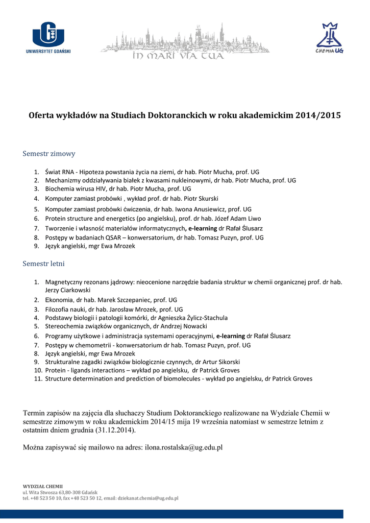 Oferta wykładów na Studiach Doktoranckich w roku akademickim 2014/2015 Semestr zimowy 1. 2. 3. 4. Świat RNA - Hipoteza powstania życia na ziemi, dr hab. Piotr Mucha, prof. UG Mechanizmy oddziaływania białek z kwasami nukleinowymi, dr hab. Piotr Mucha, prof. UG Biochemia wirusa HIV, dr hab. Piotr Mucha, prof. UG Komputer zamiast probówki , wykład prof. dr hab. Piotr Skurski 5. 6. 7. 8. 9. Komputer zamiast probówki ćwiczenia, dr hab. Iwona Anusiewicz, prof. UG Protein structure and energetics (po angielsku), prof. dr hab. Józef Adam Liwo Tworzenie i własność materiałów informatycznych, e-learning dr Rafał Ślusarz Postępy w badaniach QSAR – konwersatorium, dr hab. Tomasz Puzyn, prof. UG Język angielski, mgr Ewa Mrozek Semestr letni 1. Magnetyczny rezonans jądrowy: nieocenione narzędzie badania struktur w chemii organicznej prof. dr hab. Jerzy Ciarkowski 2. Ekonomia, dr hab. Marek Szczepaniec, prof. UG 3. Filozofia nauki, dr hab. Jarosław Mrozek, prof. UG 4. Podstawy biologii i patologii komórki, dr Agnieszka Żylicz-Stachula 5. Stereochemia związków organicznych, dr Andrzej Nowacki 6. Programy użytkowe i administracja systemami operacyjnymi, e-learning dr Rafał Ślusarz 7. Postępy w chemometrii - konwersatorium dr hab. Tomasz Puzyn, prof. UG 8. Język angielski, mgr Ewa Mrozek 9. Strukturalne zagadki związków biologicznie czynnych, dr Artur Sikorski 10. Protein - ligands interactions – wykład po angielsku, dr Patrick Groves 11. Structure determination and prediction of biomolecules - wykład po angielsku, dr Patrick Groves Termin zapisów na zajęcia dla słuchaczy Studium Doktoranckiego realizowane na Wydziale Chemii w semestrze zimowym w roku akademickim 2014/15 mija 19 września natomiast w semestrze letnim z ostatnim dniem grudnia (31.12.2014). Można zapisywać się mailowo na adres: [email protected] WYDZIAŁ CHEMII ul. Wita Stwosza 63,80-308 Gdańsk tel. +48 523 50 10, fax +48 523 50 12, email: [email protected] WYDZIAŁ CHEMII ul. Wita Stwosza 63,80-308 Gdańsk tel. +48 523 50 10, fax +48 523 50 12, email: [email protected]