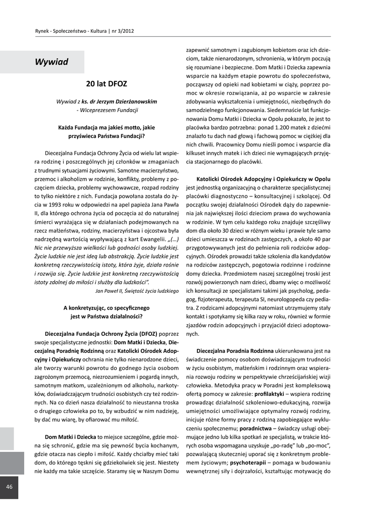 Rynek - Społeczeństwo - Kultura | nr 3/2012 Wywiad 20 lat DFOZ Wywiad z ks. dr Jerzym Dzierżanowskim - Wiceprezesem Fundacji Każda Fundacja ma jakieś motto, jakie przyświeca Państwa Fundacji? Diecezjalna Fundacja Ochrony Życia od wielu lat wspiera rodzinę i poszczególnych jej członków w zmaganiach z trudnymi sytuacjami życiowymi. Samotne macierzyństwo, przemoc i alkoholizm w rodzinie, konflikty, problemy z poczęciem dziecka, problemy wychowawcze, rozpad rodziny to tylko niektóre z nich. Fundacja powołana została do życia w 1993 roku w odpowiedzi na apel papieża Jana Pawła II, dla którego ochrona życia od poczęcia aż do naturalnej śmierci wyrażająca się w działaniach podejmowanych na rzecz małżeństwa, rodziny, macierzyństwa i ojcostwa była nadrzędną wartością wypływającą z kart Ewangelii. „(…) Nic nie przewyższa wielkości lub godności osoby ludzkiej. Życie ludzkie nie jest ideą lub abstrakcją. Życie ludzkie jest konkretną rzeczywistością istoty, która żyje, działa rośnie i rozwija się. Życie ludzkie jest konkretną rzeczywistością istoty zdolnej do miłości i służby dla ludzkości”. Jan Paweł II, Świętość życia ludzkiego A konkretyzując, co specyficznego jest w Państwa działalności? Diecezjalna Fundacja Ochrony Życia (DFOZ) poprzez swoje specjalistyczne jednostki: Dom Matki i Dziecka, Diecezjalną Poradnię Rodzinną oraz Katolicki Ośrodek Adopcyjny i Opiekuńczy ochrania nie tylko nienarodzone dzieci, ale tworzy warunki powrotu do godnego życia osobom zagrożonym przemocą, niezrozumieniem i pogardą innych, samotnym matkom, uzależnionym od alkoholu, narkotyków, doświadczającym trudności osobistych czy też rodzinnych. Na co dzień nasza działalność to nieustanna troska o drugiego człowieka po to, by wzbudzić w nim nadzieję, by dać mu wiarę, by ofiarować mu miłość. Dom Matki i Dziecka to miejsce szczególne, gdzie można się schronić, gdzie ma się pewność bycia kochanym, gdzie otacza nas ciepło i miłość. Każdy chciałby mieć taki dom, do którego tęskni się gdziekolwiek się jest. Niestety nie każdy ma takie szczęście. Staramy się w Naszym Domu 46 zapewnić samotnym i zagubionym kobietom oraz ich dzieciom, także nienarodzonym, schronienia, w którym poczują się rozumiane i bezpieczne. Dom Matki i Dziecka zapewnia wsparcie na każdym etapie powrotu do społeczeństwa, począwszy od opieki nad kobietami w ciąży, poprzez pomoc w okresie rozwiązania, aż po wsparcie w zakresie zdobywania wykształcenia i umiejętności, niezbędnych do samodzielnego funkcjonowania. Siedemnaście lat funkcjonowania Domu Matki i Dziecka w Opolu pokazało, że jest to placówka bardzo potrzebna: ponad 1.200 matek z dziećmi znalazło tu dach nad głową i fachową pomoc w ciężkiej dla nich chwili. Pracownicy Domu nieśli pomoc i wsparcie dla kilkuset innych matek i ich dzieci nie wymagających przyjęcia stacjonarnego do placówki. Katolicki Ośrodek Adopcyjny i Opiekuńczy w Opolu jest jednostką organizacyjną o charakterze specjalistycznej placówki diagnostyczno – konsultacyjnej i szkolącej. Od początku swojej działalności Ośrodek dąży do zapewnienia jak największej ilości dzieciom prawa do wychowania w rodzinie. W tym celu każdego roku znajduje szczęśliwy dom dla około 30 dzieci w różnym wieku i prawie tyle samo dzieci umieszcza w rodzinach zastępczych, a około 40 par przygotowywanych jest do pełnienia roli rodziców adopcyjnych. Ośrodek prowadzi także szkolenia dla kandydatów na rodziców zastępczych, pogotowia rodzinne i rodzinne domy dziecka. Przedmiotem naszej szczególnej troski jest rozwój powierzonych nam dzieci, dbamy więc o możliwość ich konsultacji ze specjalistami takimi jak psycholog, pedagog, fizjoterapeuta, terapeuta SI, neurologopeda czy pediatra. Z rodzicami adopcyjnymi natomiast utrzymujemy stały kontakt i spotykamy się kilka razy w roku, również w formie zjazdów rodzin adopcyjnych i przyjaciół dzieci adoptowanych. Diecezjalna Poradnia Rodzinna ukierunkowana jest na świadczenie pomocy osobom doświadczającym trudności w życiu osobistym, małżeńskim i rodzinnym oraz wspierania rozwoju rodziny w perspektywie chrześcijańskiej wizji człowieka. Metodyka pracy w Poradni jest kompleksową ofertą pomocy w zakresie: profilaktyki – wspiera rodzinę prowadząc działalność szkoleniowo-edukacyjną, rozwija umiejętności umożliwiające optymalny rozwój rodziny, inicjuje różne formy pracy z rodziną zapobiegające wykluczeniu społecznemu; poradnictwa – świadczy usługi obejmujące jedno lub kilka spotkań ze specjalistą, w trakcie których osoba wspomagana uzyskuje „po-radę” lub „po-moc”, pozwalającą skuteczniej uporać się z konkretnym problemem życiowym; psychoterapii – pomaga w budowaniu wewnętrznej siły i dojrzałości, kształtując motywację do Wywiad odnalezienia sensu życia i samodzielnego radzenia sobie z trudnościami w życiu osobistym, małżeńskim i rodzinnym. Tym, co od samego początku wyróżnia Poradnię spośród innych instytucji pomocowych jest oparcie wszystkich prowadzonych działań na poszanowaniu godności każdego człowieka oraz na wartościach chrześcijańskich. Odbiorcą pomocy świadczonej w Poradni mogła być jednak każda osoba – niezależnie od swojego światopoglądu, wyznania czy religii. W jaki sposób pozyskują Państwo fundusze na realizację celów? W bardzo dużym stopniu zakres i jakość naszego wsparcia zależy od wpłat ludzi dobrej woli oraz firm. Ale realizujemy również projekty dzięki UE. Od 2006 roku do dnia dzisiejszego zrealizowaliśmy dzięki programom pomocowym Unii Europejskiej 40 dużych projektów skierowanych do najbardziej potrzebujących. Wiele programów realizujemy cyklicznie, bowiem to powtarzalność przekazu daje szansę jego utrwalenia. Wymieniając tylko kilka z nich: Dom bez przemocy, Akademia Rodziców, Rodzina zastępcza – mó