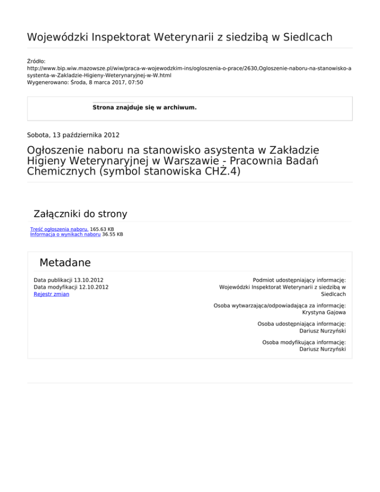 Wojewódzki Inspektorat Weterynarii z siedzibą w Siedlcach Źródło: http://www.bip.wiw.mazowsze.pl/wiw/praca-w-wojewodzkim-ins/ogloszenia-o-prace/2630,Ogloszenie-naboru-na-stanowisko-a systenta-w-Zakladzie-Higieny-Weterynaryjnej-w-W.html Wygenerowano: Środa, 8 marca 2017, 07:50 Strona znajduje się w archiwum. Sobota, 13 października 2012 Ogłoszenie naboru na stanowisko asystenta w Zakładzie Higieny Weterynaryjnej w Warszawie - Pracownia Badań Chemicznych (symbol stanowiska CHŻ.4) Załączniki do strony Treść ogłoszenia naboru. 165.63 KB Informacja o wynikach naboru 36.55 KB Metadane Data publikacji 13.10.2012 Data modyfikacji 12.10.2012 Rejestr zmian Podmiot udostępniający informację: Wojewódzki Inspektorat Weterynarii z siedzibą w Siedlcach Osoba wytwarzająca/odpowiadająca za informację: Krystyna Gajowa Osoba udostępniająca informację: Dariusz Nurzyński Osoba modyfikująca informację: Dariusz Nurzyński