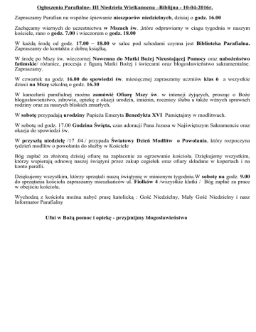 Ogłoszenia Parafialne- III Niedziela Wielkanocna –Biblijna - 10-04-2016r. Zapraszamy Parafian na wspólne śpiewanie nieszporów niedzielnych, dzisiaj o godz. 16.00 Zachęcamy wiernych do uczestnictwa w Mszach św. ,które odprawiamy w ciagu tygodnia w naszym kościele, rano o godz. 7.00 i wieczorem o godz. 18.00 W każdą środę od godz. 17.00 – 18.00 w salce pod schodami czynna jest Biblioteka Parafialna. Zapraszamy do kontaktu z dobrą książką. W środę po Mszy św. wieczornej Nowenna do Matki Bożej Nieustającej Pomocy oraz nabożeństwo fatimskie/ różaniec, procesja z figurą Matki Bożej i świecami oraz błogosławieństwo sakramentalne. Zapraszamy. W czwartek na godz. 16.00 do spowiedzi św. miesięcznej zapraszamy uczniów klas 6 a wszystkie dzieci na Mszę szkolną o godz. 16.30 W kancelarii parafialnej można zamówić Ofiarę Mszy św. w intencji żyjących, prosząc o Boże błogosławieństwo, zdrowie, opiekę z okazji urodzin, imienin, rocznicy ślubu a także wżnych sprawach rodziny oraz za naszych bliskich zmarłych. W sobotę przypadają urodziny Papieża Emeryta Benedykta XVI Pamiętajmy w modlitwach. W sobotę od godz. 17.00 Godzina Święta, czas adoracji Pana Jezusa w Najświętszym Sakramencie oraz okazja do spowiedzi św. W przyszłą niedzielę /17 .04./ przypada Światowy Dzień Modlitw o Powołania, który rozpoczyna tydzień modlitw o powołania do służby w Kościele Bóg zapłać za złożoną dzisiaj ofiarę na zapłacenie za ogrzewanie kościoła. Dziękujemy wszystkim, którzy wspierają odnowę naszej świątyni przez zakup cegiełek oraz ofiary składane w kopertach i na konto parafii. Dziękujemy wszystkim, którzy sprzątali naszą świątynię w minionym tygodniu.W sobotę na godz. 9.00 do sprzątania kościoła zapraszamy mieszkańców ul. Fiołków 4 /wszystkie klatki / Bóg zapłać za prace w obejściu kościoła. Wychodzą z kościoła można nabyć prasę katolicką : Gość Niedzielny, Mały Gość Niedzielny i nasz Informator Parafialny Ufni w Bożą pomoc i opiekę - przyjmijmy błogosławieństwo