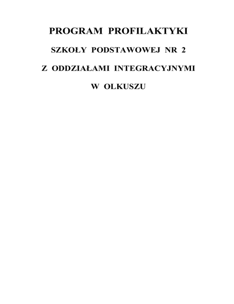 PROGRAM PROFILAKTYKI SZKOŁY PODSTAWOWEJ NR 2 Z ODDZIAŁAMI INTEGRACYJNYMI W OLKUSZU Program Profilaktyki Szkoły Podstawowej nr 2 z Oddziałami Integracyjnymi w Olkuszu zawiera : I. Założenia podstawowe II. Czynniki ryzyka – określone na podstawie wyników ankiety przeprowadzanej w szkole każdego roku III. Czynniki chroniące IV. Cele szczegółowe działań psychoedukacyjnych V. Procedury postępowania w Szkole Podstawowej nr 2 z Oddziałami Integracyjnymi w Olkuszu VI. Procedury postępowania nauczycieli i współpracy z Policją w sytuacjach zagrożenia dzieci i młodzieży przestępczością i demoralizacją, w szczególności narkomanią, alkoholizmem i prostytucją VII. „Zagrożenie terrorem” – poradnik podstawowych zasad postępowania w sytuacjach zagrożenia życia i zdrowia zamachem z użyciem przemocy i narzędzi niebezpiecznych VII. Raport z Wewnętrznego Mierzenia Jakości Pracy Szkoły w zakresie profilaktyki I. ZAŁOŻENIA PODSTAWOWE 1. Głównym celem działań profilaktycznych zawartych w niniejszym Programie jest usunięcie bądź ograniczenie szkód czy problemów, związanych z ryzykownymi zachowaniami dzieci i młodzieży uczęszczających do Szkoły Podstawowej nr 2 z Oddziałami Integracyjnymi w Olkuszu oraz zapobieganie takim zachowaniom 2. Ważnym celem działalności profilaktycznej jest wzmacnianie u uczniów czynników chroniących 3. Przedmiotem działalności profilaktycznej są problemy rozpoznane przy pomocy specjalnie skonstruowanej ankiety, przeprowadzanej w maju każdego roku szkolnego 4. Działania profilaktyczne prowadzone w szkole kieruje się do uczniów i ich rodziców 5. Stosowane formy i metody działania uwzględniają wiek i poziom rozwoju uczniów, do których są kierowane 6. Podstawą wszystkich działaniach profilaktycznych jest podmiotowość szkoły, ucznia i rodziców 7. Profilaktyka jest monitorowana i oceniana na koniec każdego roku szkolnego II. CZYNNIKI RYZYKA I ZACHOWANIA RYZYKOWNE Cechy sytuacje, warunki oraz działania niosące ryzyko negatywnych konsekwencji dla zdrowia fizycznego i psychicznego uczniów diagnozujemy corocznie badaniem ankietowym, przeprowadzanym wśród uczniów wszystkich klas 4 –6. Ankieta z maja 2009 roku wykazała, iż najczęściej wymieniane zachowania ryzykowne występujące wśród uczniów naszej szkoły to : 1. Niszczenie mienia szkolnego – wymieniane przez 52% badanych uczniów 2. Agresywne zachowanie uczniów w stosunku do siebie – wymieniane przez 50,5% badanych uczniów 3. Wyłudzanie pieniędzy przez uczniów – wymieniane przez 31% badanych uczniów 4. Palenie papierosów przez uczniów – wymieniane przez 29% badanych uczniów 5. Picie alkoholu przez uczniów – wymieniane przez 29% badanych uczniów W/w zachowania ryzykowne stanowią podstawę do określenia celów szczegółowych działalności profilaktycznej szkoły : I cel : Przeciwdziałanie dewastacji mienia szkolnego II cel : Zmniejszenie liczby zachowań agresywnych i wymuszeń III cel : Przeciwdziałanie próbom palenia papierosów oraz picia alkoholu W sytuacjach zagrożenia dzieci i młodzieży przestępczością i demoralizacją – w szczególności : narkomanią, alkoholizmem i prostytucją – stosujemy w szkole: „Procedury postępowania nauczycieli i metody współpracy szkół z Policją, w sytuacjach zagrożenia dzieci oraz młodzieży przestępczością i demoralizacją” - opracowane przez Międzyresortowy Zespół ds. Opracowania Programu Zapobiegania Niedostosowaniu Społecznemu i Przestępczości wśród Dzieci i Młodzieży dla Ministerstwa Spraw Wewnętrznych i Administracji. Zawierają one szczegółowe cele, procedury oraz formy działań interwencyjnych . W sytuacjach zagrożenia dzieci i młodzieży terrorem – w szczególności: podłożeniem ładunku wybuchowego lub inną formą rażenia zbiorowego – stosujemy w szkole: „Poradnik podstawowych zasad postępowania w sytuacjach zagrożenia życia i zdrowia zamachem z użyciem przemocy i narzędzi niebezpiecznych” – opracowany przez Śląski Urząd Wojewódzki i Komendę Wojewódzką Policji w Katowicach, w oparciu o materiały informacyjno-edukacyjne przekazane przez Komendę Główną Policji i MSWiA oraz „Informator dotyczący zasad i procedur postępowania w przypadku otrzymania informacji o podłożeniu ładunku wybuchowego”. III. CZYNNIKI CHRONIĄCE Cechy, sytuacje oraz warunki zwiększające odporność uczniów na działanie czynników ryzyka wzmacniamy w szkole w następujący sposób : Czynniki związane z sytuacją szkolną poprzez : - - opiekę wychowawcy klasowego indywidualną opiekę i poradnictwo pedagoga szkolnego systematyczną kontrolę frekwencji uczniów zapobieganie tworzeniu się w klasach „grup nieformalnych” dyżury nauczycieli podczas wszystkich przerw oraz przed lekcjami dyscyplinowanie sprawców przemocy, niszczycieli mienia szkolnego oraz palących papierosy organizowanie zajęć pozalekcyjnych organizowanie zajęć korekcyjno-kompensacyjnych, rewalidacyjnych oraz terapeutycznych celem przeciwdziałania niepowodzeniom szkolnym organizowanie pomocy materialnej dla uczniów organizowanie zajęć profilaktycznych dla uczniów, nauczycieli i rodziców prowadzonych przez pedagoga szkolnego, wychowawców klas, Policjantów oraz innych zapraszanych gości współpracę z Policją współpracę z Sądem współpracę z Miejskim Ośrodkiem Pomocy Społecznej współpracę ze specjalistycznymi poradniami Czynniki chroniące związane z sytuacją rodzinną poprzez : - poradnictwo indywidualne dla rodziców prowadzone przez wychowawców klas i pedagoga szkolnego - organizowanie pogadanek dla rodziców - zapraszanie Rodziców do częstego uczestnictwa w życiu szkoły - organizowanie imprez integrujących rodziców i nauczycieli i środowisko lokalne - ścisłą współpracę z Radą Rodziców - działalność Szkolnej Komisji Społeczno-Wychowawczej - w uzasadnionych przypadkach odwiedzanie domów rodzinnych c
