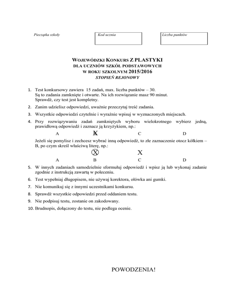 Pieczątka szkoły Liczba punktów Kod ucznia WOJEWÓDZKI KONKURS Z PLASTYKI DLA UCZNIÓW SZKÓŁ PODSTAWOWYCH W ROKU SZKOLNYM 2015/2016 STOPIEŃ REJONOWY 1. Test konkursowy zawiera 15 zadań, max. liczba punktów – 30. Są to zadania zamknięte i otwarte. Na ich rozwiązanie masz 90 minut. Sprawdź, czy test jest kompletny. 2. Zanim udzielisz odpowiedzi, uważnie przeczytaj treść zadania. 3. Wszystkie odpowiedzi czytelnie i wyraźnie wpisuj w wyznaczonych miejscach. 4. Przy rozwiązywaniu zadań zamkniętych wyboru wielokrotnego wybierz jedną, prawidłową odpowiedź i zaznacz ją krzyżykiem, np.: A B X C D Jeżeli się pomylisz i zechcesz wybrać inną odpowiedź, to złe zaznaczenie otocz kółkiem – B, po czym skreśl właściwą literę, np.: A X X B C D 5. W innych zadaniach samodzielnie sformułuj odpowiedź i wpisz ją lub wykonaj zadanie zgodnie z instrukcją zawartą w poleceniu. 6. Test wypełniaj długopisem, nie używaj korektora, ołówka ani gumki. 7. Nie komunikuj się z innymi uczestnikami konkursu. 8. Sprawdź wszystkie odpowiedzi przed oddaniem testu. 9. Nie podpisuj testu, zostanie on zakodowany. 10. Brudnopis, dołączony do testu, nie podlega ocenie. POWODZENIA! Zadanie 1. (2 p.) Jakie epoki z dziejów sztuki reprezentują przedstawione zabytki architektury polskiej? Zadanie 2. (3 p.) Nazwij zaznaczone strzałką - nienazwane budowle na akropolu w Atenach. 2 Zadanie 3. ( 1 p.) Które z podanych miast zostało zaprojektowane i wzniesione w epoce Odrodzenia? Właściwe podkreśl. A/ Gniezno B/ Kraków C/ Zamość D/ Wrocław Zadanie 4. ( 3 p.) Do podanych nazw stylów dobierz zabytki, które powstały w danym okresie: (wpisz odpowiednią literę) ROMANIZM ............ , .............. , ............. GOTYK .................... , ............. , ............ RENESANS ............ , ............. , ............ A/ Ołtarz Mariacki w Krakowie D/ Drzwi Gnieźnieńskie G/ Dama z gronostajem B/ Pieta – Michała Anioła E/ Katedra w Chartres C/ Tempietto F/ Kolegiata w Kruszwicy H/ Pałac Dożów w Wenecji I/ Tkanina z Bayeux Zadanie 5. ( 1 p.) Podaj nazwisko słynnego artysty, malarza tworzącego portrety i kompozycje figuralne w bardzo oryginalny sposób. Składały się na nie elementy martwej natury, ułożone w obraz twarzy lub sceny. Jego dzieła to między innymi: Lato - 1563, Wiosna – 1573, Jesień, Zima, Bibliotekarz, Ogrodnik. ………………………………………………………………………………………… Zadanie 6. ( 2 p.) Podaj nazwę budowli, która uważana jest za pierwsze dzieło architektury wczesnego baroku. Wpisz także miejscowość, w której się znajduje. Nazwa budowli………………………….. Miejscowość……………………………… 3 Zadanie 7. ( 3 p.) Podaj nazwisko słynnego rzeźbiarza, autora prezentowanej rzeźby. Wpisz tytuł rzeźby oraz nazwę epoki artystycznej, w której tworzył. Nazwisko rzeźbiarza……………………….…… Tytuł rzeźby……………………………………. Epoka artystyczna……………………………… Zadanie 8. (1 p.) Podaj tytuł obrazu hiszpańskiego malarza, okresu baroku D. Velázqueza, namalowanego w 1656 roku. Uwagę w nim przyciąga niezauważony w pierwszej chwili odbijający się w lustrze, w głębi obraz pary królewskiej. Tytuł ………………………………………………………………………….. Zadanie 9. (1 p.) Podaj nazwisko autora cyklu grafik pt. Kaprysy, gdzie szczególnie znana jest „Gdy rozum śpi budzą się potwory” Nazwisko artysty…………………………………………………………………. Zadanie 10. (1 p.) W jakim stylu architektonicznym zbudowany jest Parlament w Londynie? ……………………………………………………………………………………….. 4 Zadanie 11. (2 p.) Oto dwa słynne pomniki konne. Jeden powstał w starożytnym Rzymie a drugi zamówiony został w Warszawie, w 1817 u duńskiego rzeźbiarza Bertela Thorvaldsena. Wpisz pod zdjęciami kogo przedstawiają. Zadanie 12. (1 p.) Na czyim dworze malował od 1767 r., portrecista Marcello Bacciarelli? Wpisz imiona i nazwisko właściwego króla. …………………………………………………………….. Zadanie 13. (1 p.) Jaki nurt malarstwa XIX wieku reprezentowali artyści tacy jak: C. Monet, E. Degas, P-A. Renoir? Wpisz nazwę w/w nurtu. ……………………………………………………………… Zadanie 14. ( 4 p.) Który z wymienionych artystów był rzeźbiarzem, który malarzem, a który architektem? Antonio Canova………………………. George Seurat…..…………………... Claeszon Heda…………………………. Francesco Borromini………………… 5 Zadanie 15. ( 4 p.) Dopasuj jedno, odpowiednie dzieło (tytuł pracy) do odpowiedniego autora - malarza. Zauważ!, że tytułów jest więcej niż autorów. Jacek Malczewski Wojciech Kossak Józef Simmler Józef Chełmoński cykl Polonia Śmierć Barbary Radziwiłłówny Olszynka Grochowska Hołd Pruski Rejtan Patrol powstańczy Kuropatwy Melancholia Dziwny Ogród witraż – Bóg Ojciec – Stań się! 6 BRUDNOPIS 7