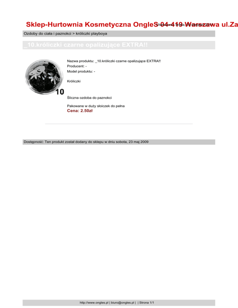 środa,Warszawa 03 sierpień 2011 Sklep-Hurtownia Kosmetyczna OngleSUtworzono: 04-419 ul.Za Ozdoby do ciała i paznokci > króliczki playboya _10.króliczki czarne opalizujące EXTRA!! Nazwa produktu: _10.króliczki czarne opalizujące EXTRA!! Producent: Model produktu: Króliczki Śliczna ozdoba do paznokci Pakowane w duży słoiczek do pełna Cena: 2.50zł Dostępność: Ten produkt został dodany do sklepu w dniu sobota, 23 maj 2009 http://www.ongles.pl | [email protected] | | Strona 1/1