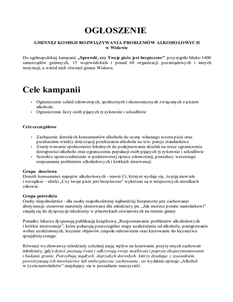 OGŁOSZEIE GMIEJ KOMISJI ROZWIĄZYWAIA PROBLEMÓW ALKOHO LOWYC H w Widawie Do ogólnopolskiej kampanii „Sprawdź, czy Twoje picie jest bezpieczne” przystąpiło blisko 1400 samorządów gminnych, 15 wojewódzkich i ponad 60 organizacji pozarządowych i innych instytucji, a wśród nich również gmina Widawa. Cele kampanii • • Ograniczenie szkód zdrowotnych, społecznych i ekonomicznych związanych z piciem alkoholu Ograniczenie liczy osób pijących ryzykownie i szkodliwie Cele szczegółowe • • • Zachęcenie dorosłych konsumentów alkoholu do oceny własnego wzoru picia oraz przekazanie wiedzy dotyczącej przeliczania alkoholu na tzw. porcje standardowe Zmotywowanie społeczności lokalnych do podejmowania działań na rzecz ograniczenia dostępności alkoholu oraz ograniczenia populacji osób pijących ryzykownie i szkodliwie Szerokie upowszechnienie w podstawowej opiece zdrowotnej, procedury wczesnego rozpoznania problemów alkoholowych i krótkich interwencji Grupa docelowa Dorośli konsumenci napojów alkoholowych - nawet Ci, którym wydaje się, że piją niew iele i rozsądnie – ulotki „Czy twoje picie jest bezpieczne” wyłożone są w miejscowych ośrodkach zdrowia Grupa pośrednia Osoby niepełnoletnie - dla osoby niepełnoletniej najbardziej bezpieczne jest zachowanie abstynencji, stosowne materiały skierowane dla młodzieży pn. „Jak możesz pomóc nastolatkowi” znajdą się do dyspozycji młodzieży w placówkach oświatowych na terenie gminy Ponadto, lekarze dysponują publikacją książkową „Rozpoznawanie problemów alkoholowych i krótkie interwencje”, które pokazują poszczególne etapy uzależnienia od alkoholu, postępowanie wobec uzależnionych, leczenie objawów zespołu odstawienia oraz kierowanie do lecznictwa specjalistycznego. Również wychowawcy młodzieży szkolnej mają wpływ na kreowanie pozytywnych zachowań młodzieży, gdyż dzieci poznają świat i odkrywają swoje możliwości poprzez eksperymentowanie i badanie granic. Potrzebują mądrych, dojrzałych dorosłych, którzy działając z szacunkiem, powstrzymają ich niewłaściwe lub niebezpieczne zachowania , co wydatnie opisuje „Alkohol w życiu nastolatków” znajdujący się w posiadaniu nauczycieli. Czas trwania Kampania rozpoczęła się 7 kwietnia 2009 r. uroczystą inauguracją w Sejmie RP. Działania zaplanowane są do końca roku 2009. Sygnały ostrzegawcze Uzależnienie od alkoholu rozwija się stopniowo i nikt nie może powiedzieć, że uzależnił się np. 17 stycznia o 22-giej. Z powodu systemu mechanizmów obronnych pomniejszających i zniekształcający ch rozmiary problemu, sama osoba zainteresowana orientuje się dość późno, iż coś niepokojącego dzieje się w jej życiu. Kiedy pojawią się wyraźne objawy uzależnienia, na ogół choroba jest już rozwinięta. Jednak warto wiedzieć, iż są pewne sygnały rozwoju uzależnienia, które powinny zwrócić naszą uwagę. Pozwolą one w porę podjąć działania zaradcze. Poniżej lista takich sygnałów - zawiera szereg najczęściej powtarzających się sygnałów wskazujących na pojawienie się początków uzależnienia: • • • • • • • • • • • Gdy człowiek zauważa, że działanie alkoholu odpręża i daje ulgę, redukuje napięcie i niepokój, osłabia poczucie winy, ośmiela, ułatwia zaśnięcie czy pobudza do działania... Gdy osoba zagrożona uzależnieniem zaczyna poszukiwać, inicjować i organizować okazje do wypicia, pije łapczywie, jakby gasząc pragnienie, wyprzedza kolejki... Gdy postępuje przywiązanie do sytuacji picia (narasta koncentracja na sytuacjach związanych z piciem, oczekiwanie na moment picia, celebrowanie picia, niepokój gdy nie można się napić)... Gdy powtarzają się przypadki upicia, osoba zagrożona pije alkohol pomimo zaleceń lekarskich, sugerujących konieczność powstrzymywania się od picia... Gdy pojawia się duma z tego, że może wypić większą niż uprzednio ilość alkoholu (tzw. mocna głowa świadcząca o wzroście tolerancji na alkohol)... Gdy pojawiają się incydenty zapominania wydarzeń, które miały miejsce poprzedniego dnia podczas picia (tzw. palimpsesty alkoholowe, "urwane filmy", "przerwy w życiorysie")."Jak ja doszedłem do łóżka?", „O czym rozmawiałem z moim szefem godzinę wieczorem przez komórkę?"... Gdy ktoś, kto uprzednio pił w sytuacjach towarzyskich, zaczyna pić w samotności i do tego w ukryciu... Gdy powtarzają się przypadki prowadzenie samochodu po niewielkiej nawet ilości alkoholu... Gdy na uwagi o konieczności ograniczenia picia lub sytuacje utrudniające dostęp do alkoholu osoba zagrożona uzależnieniem reaguje agres ją lub rozdrażnieniem i stara się unikać rozmów na temat swojego picia... Gdy zaczynają się powtarzać wewnętrzne, nieudane próby ograniczenia picia lub przysięgi abstynencji po to, aby udowodnić sobie posiadanie kontroli nad piciem alkoholu... Gdy powtarza się regularne wypijanie dużych dawek alkoholu zwiększa się ilość • • • i częstotliwość spożywania alkoholu, np. jednorazowo powyżej 100 gramów etanolu lub regularne codziennie spożywanie powyżej 20 gramów etanolu... Gdy dzień zaczyna się od picia alkoholu (np. poranne piwo)... Gdy używanie alkoholu staje się sposobem usuwania przykrych skutków poprzedniego picia (klinowanie)... Gdy rosną negatywne konsekwencje nadużywania alkoholu, a mimo to picie jest nadal kontynuowane...MOŻE TO OZACZAĆ ŻE JES TEŚ UZALEŻ IOY - IE CZEKAJ, IDŹ DO S PECJALIS TY, PAMIĘTAJ UZALEŻ IEIE TO IE KATAR S AMO IE PRZEJD ZIE !!!