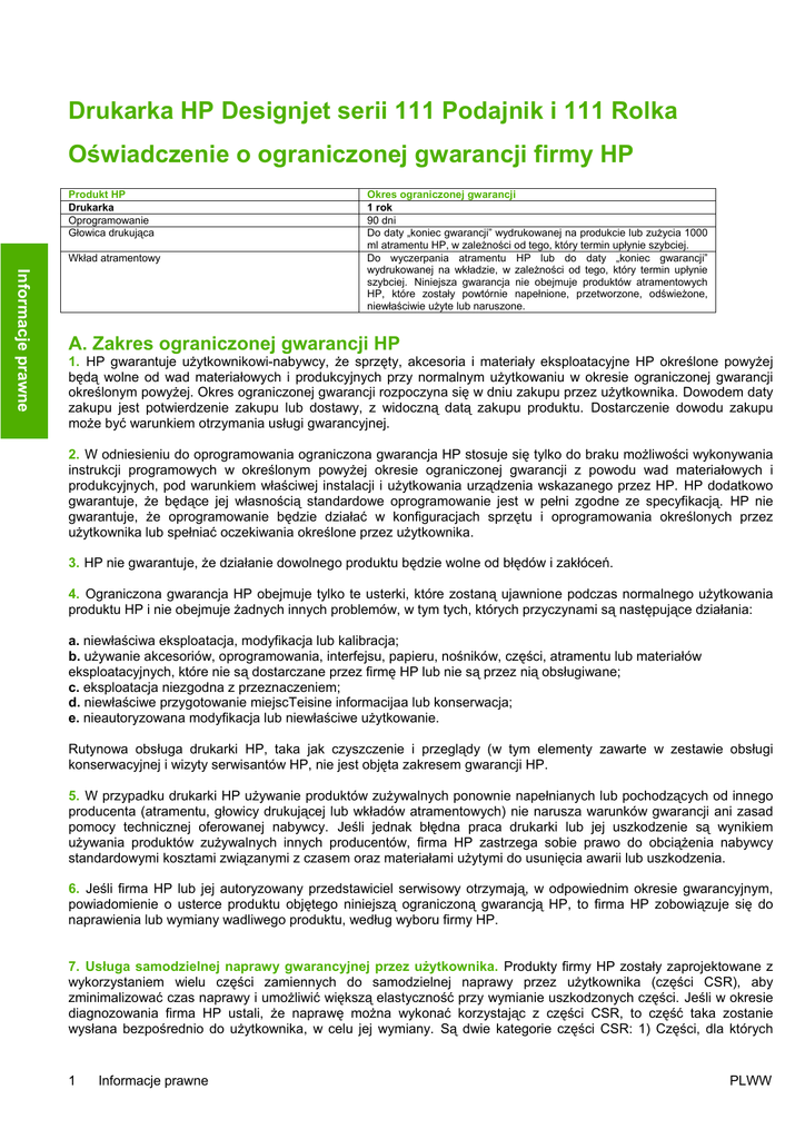 Drukarka HP Designjet serii 111 Podajnik i 111 Rolka Oświadczenie o ograniczonej gwarancji firmy HP Produkt HP Drukarka Oprogramowanie Głowica drukująca Wkład atramentowy Informacje prawne Okres ograniczonej gwarancji 1 rok 90 dni Do daty „koniec gwarancji” wydrukowanej na produkcie lub zużycia 1000 ml atramentu HP, w zależności od tego, który termin upłynie szybciej. Do wyczerpania atramentu HP lub do daty „koniec gwarancji” wydrukowanej na wkładzie, w zależności od tego, który termin upłynie szybciej. Niniejsza gwarancja nie obejmuje produktów atramentowych HP, które zostały powtórnie napełnione, przetworzone, odświeżone, niewłaściwie użyte lub naruszone. A. Zakres ograniczonej gwarancji HP 1. HP gwarantuje użytkownikowi-nabywcy, że sprzęty, akcesoria i materiały eksploatacyjne HP określone powyżej będą wolne od wad materiałowych i produkcyjnych przy normalnym użytkowaniu w okresie ograniczonej gwarancji określonym powyżej. Okres ograniczonej gwarancji rozpoczyna się w dniu zakupu przez użytkownika. Dowodem daty zakupu jest potwierdzenie zakupu lub dostawy, z widoczną datą zakupu produktu. Dostarczenie dowodu zakupu może być warunkiem otrzymania usługi gwarancyjnej. 2. W odniesieniu do oprogramowania ograniczona gwarancja HP stosuje się tylko do braku możliwości wykonywania instrukcji programowych w określonym powyżej okresie ograniczonej gwarancji z powodu wad materiałowych i produkcyjnych, pod warunkiem właściwej instalacji i użytkowania urządzenia wskazanego przez HP. HP dodatkowo gwarantuje, że będące jej własnością standardowe oprogramowanie jest w pełni zgodne ze specyfikacją. HP nie gwarantuje, że oprogramowanie będzie działać w konfiguracjach sprzętu i oprogramowania określonych przez użytkownika lub spełniać oczekiwania określone przez użytkownika. 3. HP nie gwarantuje, że działanie dowolnego produktu będzie wolne od błędów i zakłóceń. 4. Ograniczona gwarancja HP obejmuje tylko te usterki, które zostaną ujawnione podczas normalnego użytkowania produktu HP i nie obejmuje żadnych innych problemów, w tym tych, których przyczynami są następujące działania: a. niewłaściwa eksploatacja, modyfikacja lub kalibracja; b. używanie akcesoriów, oprogramowania, interfejsu, papieru, nośników, części, atramentu lub materiałów eksploatacyjnych, które nie są dostarczane przez firmę HP lub nie są przez nią obsługiwane; c. eksploatacja niezgodna z przeznaczeniem; d. niewłaściwe przygotowanie miejscTeisine informacijaa lub konserwacja; e. nieautoryzowana modyfikacja lub niewłaściwe użytkowanie. Rutynowa obsługa drukarki HP, taka jak czyszczenie i przeglądy (w tym elementy zawarte w zestawie obsługi konserwacyjnej i wizyty serwisantów HP, nie jest objęta zakresem gwarancji HP. 5. W przypadku drukarki HP używanie produktów zużywalnych ponownie napełnianych lub pochodzących od innego producenta (atramentu, głowicy drukującej lub wkładów atramentowych) nie narusza warunków gwarancji ani zasad pomocy technicznej oferowanej nabywcy. Jeśli jednak błędna praca drukarki lub jej uszkodzenie są wynikiem używania produktów zużywalnych innych producentów, firma HP zastrzega sobie prawo do obciążenia nabywcy standardowymi kosztami związanymi z czasem oraz materiałami użytymi do usunięcia awarii lub uszkodzenia. 6. Jeśli firma HP lub jej autoryzowany przedstawiciel serwisowy otrzymają, w odpowiednim okresie gwarancyjnym, powiadomienie o usterce produktu objętego niniejszą ograniczoną gwarancją HP, to firma HP zobowiązuje się do naprawienia lub wymiany wadliwego produktu, według wyboru firmy HP. 7. Usługa samodzielnej naprawy gwarancyjnej przez użytkownika. Produkty firmy HP zostały zaprojektowane z wykorzystaniem wielu części zamiennych do samodzielnej naprawy przez użytkownika (części CSR), aby zminimalizować czas naprawy i umożliwić większą elastyczność przy wymianie uszkodzonych części. Jeśli w okresie diagnozowania firma HP ustali, że naprawę można wykonać korzystając z części CSR, to część taka zostanie wysłana bezpośrednio do użytkownika, w celu jej wymiany. Są dwie kategorie części CSR: 1) Części, dla których 1 Informacje prawne PLWW W zależności od dostępności i możliwości geograficznych części CSR są wysyłane z dostawą w następnym dniu roboczym. Dostawa tego samego dnia lub w ciągu czterech godzin może być oferowana za dodatkową opłatą, gdzie warunki geograficzne na to pozwalają. Jeśli wymagana jest pomoc, można zadzwonić do działu pomocy technicznej firmy HP i uzyskać techniczną pomoc telefoniczną. Firma HP podaje w materiałach dostarczonych z częścią zamienną CSR, czy uszkodzona część musi być zwrócona. W przypadkach, gdy zwrot uszkodzonej części do firmy HP jest wymagany, część tę należy odesłać w określonym czasie, zazwyczaj w ciągu pięciu (5) dni roboczych. Uszkodzona część musi zostać zwrócona z dołączoną dokumentacją, dostarczoną z przesyłką. Zaniechanie zwrotu uszkodzonej części może skutkować wystawieniem przez firmę HP rachunku za wymianę. W ramach samodzielnej naprawy przez klienta, firma HP opłaca koszty wysyłki i zwrotu oraz określa wymaganego spedytora/kuriera. 8. W wypadku wymiany przez firmę HP wadliwego produktu lub części u klienta, produkty będą serwisowane w pomieszczeniach użytkownika końcowego bez dodatkowej opłaty tylko w określonych obszarach obsługiwanych przez lokalne punkty serwisowe. Poza określonymi obszarami obsługiwanymi przez lokalne punkty serwisowe, usługi gwarancyjne będą świadczone u klienta tylko po uprzednim uzgodnieniu; użytkownik może być zobowiązany do pokrycia kosztów podróży lub innych wydatków związanych z takimi naprawami. Skontaktuj się z lokalnym autoryzowanym przedstawicielem serwisowym HP, aby uzyskać informacje o lokalnych obszarach obsługi. 9. Użytkownik podejmie ws