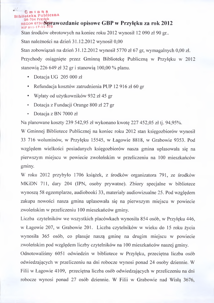r ~ Omiont B ib liotek a P u b l i c i n a 26-704 Prryłęk 67302Sprawozdanie opisow e GBP w Przyłęku za rok 2012 regon NIP W' 1 - 1 7 - 1 1 - 3 7 5 r J r Stan środków obrotowych na koniec roku 2012 wynosił 12 090 zł 90 gr.. Stan należności na dzień 31.12.2012 wynosił 0,00 Stan zobowiązań na dzień 31.12.2012 wynosił 5770 zł 67 gr, wymagalnych 0,00 zł. Przychody osiągnięte przez Gminną Bibliotekę Publiczną w Przyłęku w 2012 stanowią 226 649 zł 32 gr i stanowią 100,00 % planu. • Dotacja UG 205 000 zł • Refundacja kosztów zatrudnienia PUP 12 916 zł 60 gr • Wpłaty od użytkowników 932 zł 45 gr • Dotacja z Fundacji Orange 800 zł 27 gr • Dotacja z BN 7000 zł Na planowane koszty 239 542,95 zł wykonano kwotę 227 452,05 zł tj. 94,95%. W Gminnej Bibliotece Publicznej na koniec roku 2012 stan księgozbiorów wynosił 33 716 woluminów, w Przyłęku 15545, w Łagowie 8818, w Grabowie 9353. Pod względem wielkości posiadanych księgozbiorów nasza gmina uplasowała się na pierwszym miejscu w powiecie zwoleńskim w przeliczeniu na 100 mieszkańców gminy. W roku 2012 przybyło 1706 książek, z środków organizatora 791, ze środków MKiDN 711, dary 204 (IPN, osoby prywatne). Zbiory specjalne w bibliotece wynoszą 58 egzemplarze, audiobooki 33, materiały audiowizualne 25. Pod względem zakupu nowości nasza gmina uplasowała się na pierwszym miejscu w powiecie zwoleńskim w przeliczeniu 100 m ieszkańców gminy. Liczba czytelników we wszystkich placówkach wynosiła 854 osób, w Przyłęku 446, w Łagowie 207, w Grabowie 201. Liczba czytelników w wieku do 15 roku życia wynosiła 365 osób, co plasuje naszą gminę na drugim miejscu w powiecie zwoleńskim pod w zględem liczby czytelników na 100 m ieszkańców naszej gminy. Odnotowaliśmy 6051 odwiedzin w bibliotece w Przyłęku, przeciętna liczba osób odwiedzających w przeliczeniu na dni robocze wynosi ponad 24 osoby dziennie. W Filii w Łagowie 4109, przeciętna liczba osób odwiedzających w przeliczeniu na dni robocze wynosi ponad 27 osób dziennie. W Filii w Grabowie nad Wisłą 3676, przeciętna liczba osób odwiedzających w przeliczeniu na dni robocze wynosi również 24 osoby dziennie. Wypożyczenia w roku 2012 wyniosły 20 256 woluminów, w Przyłęku 11407 , w Łagowie 4811, w Grabowie 4038, co plasuje naszą gminę na drugim miejscu pod względem wypożyczeń w przeliczeniu na 100 mieszkańców w powiecie zwoleńskim. Biblioteka w Przyłęku stara się poszerzać swoje zbiory o audiobooki i książki z dużą czcionka z myślą o specjalnych grupach użytkowników, w szczególności seniorów. Zakupiono 5 audiobooków. Każda placówka udostępnia nieodpłatnie komputery z dostępem do Internetu. W Przyłęku można było korzystać z 6 komputerów, w Grabowie i Łagowie z 2. Pod koniec 2011 roku zakończono prace związane z wprowadzaniem zbiorów biblioteki w Przyłęku do katalogu elektronicznego w związku z czym od początku roku 2012 ewidencjonowanie użytkowników biblioteki oraz wypożyczanie zbiorów biblioteki prowadzone jest elektronicznie jest elektronicznie we wszystkich placówkach. Filia w Łagowie do końca roku 2012 przeniosła do katalogu elektronicznego 97% swoich zbiorów, natomiast filia w Grabowie 54%. Przede wszystkim wprowadza się na bieżąco nabywane nowości oraz w miarę posiadanego czasu pozostały księgozbiór. W ramach pozabudżetowych środków Gminna Biblioteka Publiczna w Przyłęku skorzystała z oferty Fundacji Orange z zakresie dotacji na finansowanie opłat za internet oraz zakupu sprzętu. Dotacji M inisterstwa Kultury i Dziedzictwa Narodowego na zakup nowości wydawniczych. Złożyła wniosek i zakwalifikowała się do projektu fundacji FRSI „Rozpracuj to z biblioteką” w ramach, którego w roku 2013 otrzymała sprzęt komputerowy i przejdzie cykl szkoleń dla pracowników 3 placówek. Złożyliśmy wniosek i otrzymaliśmy w darowiźnie oprogramowanie z firmy M icrosoft na kwotę ponad 100 tys. złotych. Złożony został wniosek w ramach małych projektów z PRO W 2007-2013 na wyposażenie biblioteki w Rudkach oraz przeprowadzenia warsztatów . W roku 2012 na w bibliotece w Przyłęku odbywały staż na podstawie umowy z PUP 2 osoby. Biblioteka w Przyłęku w roku 2012 zorganizowała 4 spotkania autorskie - 3 spotkania dla młodszych czytelników z poetką piszącą dla dzieci Agnieszką Frączek, które odbyły się w PSP w Babinie, Mszadli Starej i Grabowie nad Wisłą. 1 spotkanie dla młodzieży z młodą pisarką Gają Kołodziej w PG w Przyłęku. Założyliśmy i prowadzimy stronę intranetową biblioteki adres www.gbp.przylek.pl, na której udostępniamy katalogi wszystkich placówek biblioteki on-line, każdy czytelnik ma też możliwość sprawdzenia swojego konta na podstawie otrzymanej karty z numerem i pinem oraz przedłużyć czas zwrotu oraz zarezerwować dla siebie książkę. W okresie zim owo-wiosennym prowadziliśmy warsztaty komputerowe dla osób w wieku 45+ dla sześciosobowej grupy. W chwili obecnej również prowadzimy warsztaty w tematyce obsługi komputera i korzystania z Internetu. W Przyłęku w poniedziałki o 16.30, a w Rudkach w niedzielę również o 16.30. (Wszystkich zainteresowanych serdecznie zapraszamy) W okresie ferii zimowych odbyły się po 4 spotkania w każdej placówce: Ferie z książką w BIBLIOTECE. W spotkaniach zimowych uczestniczyło 40 (Łagów), 20 (Grabów) młodych użytkowników biblioteki. N a zabawie, wspólnym czytaniu książek i w arsztatach plastycznych dzieci przyjemnie i pożytecznie spędziły ferie zimowe. W okresie wakacji we wszystkich placówkach biblioteki dwa razy w tygodniu prowadzone były warsztaty pod tytułem „Spotkajmy się w bibliotece”. Zajęcia wakacyjne prowadzone były dwa razy w tygodniu po 4 godziny przez cały okres wakacji. Harmonogram zajęć był urozmaicony. Przede wszystkim ukierunkowany był głównie na prawidłowe i bezpieczne posługiwaniem si