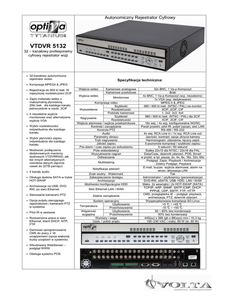 Autonomiczny Rejestrator Cyfrowy VTDVR 5132 32 – kanałowy profesjonalny cyfrowy rejestrator wizji • 32-kanałowy autonomiczny rejestrator wideo Specyfikacja techniczna: • Kompresja MPEG4 & JPEG • Rejestracja do 800 kl./sek. W najwyŜszej rozdzielczości 2CIF • Zapis materiału wideo z maksymalną płynnością 25kl./sek. dla kaŜdego kanału jednocześnie w rozdz. 2CIF • 4 niezaleŜne wyjścia monitorowe oraz alternatywne wyjście VGA • Wybór rozdzielczości indywidualnie dla kaŜdego kanału • Wybór płynności zapisu indywidualnie dla kaŜdego kanału • MoŜliwość podłączenia dedykowanych macierzy dyskowych VTDVRRAID, jak teŜ innych alternatywnych nośników danych (łącznie nawet do 32TB pamięci) • 4 kanały audio • Obsługa dysków SATA w trybie HOT-SWAP • Archiwizacja na USB, DVDRW, po sieci Ethernet • Sterowanie kamerami PTZ • Opcja pulpitu sterującego rejestratorem i kamerami PTZ w systemie • Pilot IR w zestawie • Rozszerzona praca w sieci Ethernet, klient DHCP, NTP, FTP • Darmowe oprogramowanie CMS do pracy z 16 urządzeniami (opcja większej liczby urządzeń w systemie) • Wbudowany WebSerwer – podgląd WWW • Obsługa systemu POS Wejścia wideo Wyjścia wideo Kamerowe analogowe Kamerowe przelotowe Monitorowe Kompresja video Szybkość Wyświetlanie Rozdzielczość Podziały kamerowe Szybkość Nagrywanie Rozdzielczość Wejścia alarmowe / wyjścia przekaźnikowe Kontrola i zarządzanie Kontrola PTZ Audio Parametry obrazu Tryb nagrywania Jakość zapisu Pre-alarm / czas zapisu po wzbudzeniu Pola wideodetekcji Wyszukiwanie nagrań Odtwarzanie Multitasking Notyfikacja zdarzeń Znak wodny - Watermark Zabezpieczenie dostępu Archiwizacja MoŜliwości konfiguracyjne HDD Sieć Ethernet LAN / WAN Zdalne zarządzanie System operacyjny UŜytkowania Temperatura Przechowywania UŜytkowania Wilgotność względna Przechowywania Wymiary i waga Uzas. / pobór prądu 32x BNC, 1 Vp-p Kompozyt Brak 4x BNC, 1 Vp-p Kompozyt (wyj. niezaleŜne) 1x VGA (wyj. dedykowane) MPEG-4 & JPEG 480 / 400 kl./sek. (NTSC / PAL) na monitor 4CIF, 2CIF, CIF 1, 2x2, 3x3, 4x4 960 / 800 kl./sek. (NTSC / PAL) dla 2CIF 4CIF, 2CIF, CIF 16x wej. / 4x wyj. konfigurowalne NO/NC Panel przedni, pilot IR, pulpit (opcja), sieć LAN RS-485 / RS-232 4x wej. RCA Line in / 1x wyj. RCA Line out Jasność, kontrast, opcja ukrycia kamery Harmonogram, zdarzenia, ręczny zapis 5-poziomów kompresji / szybkość zapisu 5 sekund / 60 sekund Siatka 22x15 dla NTSC / 22x18 dla PAL Data/Czas, dziennik zdarzeń, POS, Smart w przód, w tył, pauza, 2x, 4x, 8x, 16x, 32x, 64x - Podgląd, Zapis, Playback / Archiwizacja - Zdalny Podgląd, Playback E-mail, buzzer, wyjścia alarmowe, alarm na ekran, aktywacja LAN Tak Administrator / uŜytkownicy (personalizacja) DVD-RW, eSATA, USB, HDD, LAN / WAN Maks. 2x wewnątrz i 2x HOT-SWAP (SATA) TCP/IP, ARP, SNMP, SNTP ICMP, DHCP, PPPoE, UDP, SMTP, FTP, HTTP CMS, przeglądarka IE – podgląd, playback, archiwizacja, PTZ, dziennik zdarzeń Wyspecjalizowana kompilacja SO Linux +5 °C ~ +45 °C -10 °C ~ +55 °C 30 ~ 80% bez kondensacji 93% bez kondensacji 445(sz) x 388 (gł) x 88(wys) mm / 10.3 kg 100~230 VAC / maks. 85 W (śr. 60 W)