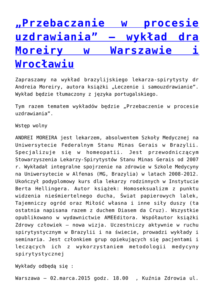 „Przebaczanie w procesie uzdrawiania” – wykład dra Moreiry w Warszawie i Wrocławiu Zapraszamy na wykład brazylijskiego lekarza-spirytysty dr Andreia Moreiry, autora książki „Leczenie i samouzdrawianie”. Wykład będzie tłumaczony z języka portugalskiego. Tym razem tematem wykładów będzie „Przebaczenie w procesie uzdrawiania”. Wstęp wolny ANDREI MOREIRA jest lekarzem, absolwentem Szkoły Medycznej na Uniwersytecie Federalnym Stanu Minas Gerais w Brazylii. Specjalizuje się w homeopatii. Jest przewodniczącym Stowarzyszenia Lekarzy-Spirytystów Stanu Minas Gerais od 2007 r. Wykładał integralne spojrzenie na zdrowie w Szkole Medycyny na Uniwersytecie w Alfenas (MG, Brazylia) w latach 2008-2012. Ukończył podyplomowy kurs dla lekarzy rodzinnych w Instytucie Berta Hellingera. Autor książek: Homoseksualizm z punktu widzenia nieśmiertelnego ducha, Świat papierowych lalek, Tajemniczy ogród oraz Miłość własna i inne siły duszy (ta ostatnia napisana razem z duchem Diasem da Cruz). Wszystkie opublikowano w wydawnictwie AMEEditora. Współautor książki Zdrowy człowiek – nowa wizja. Uczestniczy aktywnie w ruchu spirytystycznym w Brazylii i na świecie, prowadzi wykłady i seminaria. Jest członkiem grup opiekujących się pacjentami i leczących ich z wykorzystaniem metodologii medycyny spirytystycznej Wykłady odbędą się : Warszawa – 02.marca.2015 godz. 18.00 , Kuźnia Zdrowia ul. Rzymska 21 Wrocław – 03.marca.2015 godz 18.00, Europrofes, sala beżowa Rynek 35