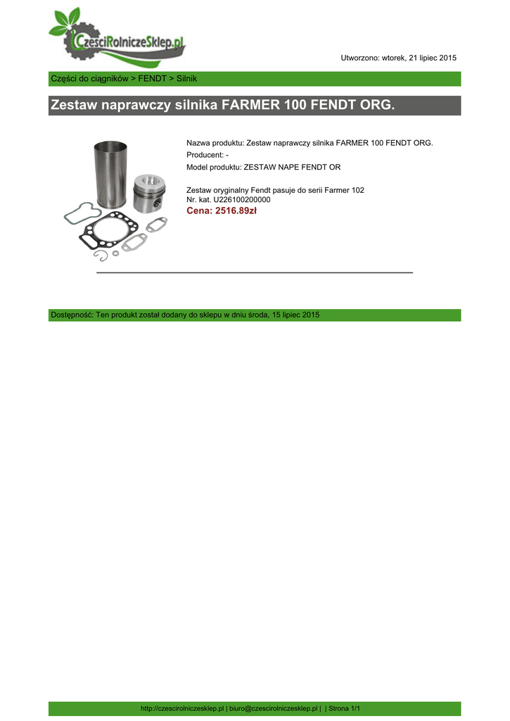 Utworzono: wtorek, 21 lipiec 2015 Części do ciągników > FENDT > Silnik Zestaw naprawczy silnika FARMER 100 FENDT ORG. Nazwa produktu: Zestaw naprawczy silnika FARMER 100 FENDT ORG. Producent: Model produktu: ZESTAW NAPE FENDT OR Zestaw oryginalny Fendt pasuje do serii Farmer 102 Nr. kat. U226100200000 Cena: 2516.89zł Dostępność: Ten produkt został dodany do sklepu w dniu środa, 15 lipiec 2015 http://czescirolniczesklep.pl | [email protected] | | Strona 1/1