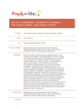 NIE DO WYJAŚNIENIA. ROZMOWY W PARACH. THE UNEXPLAINED. DISCUSSION TOPICS POZIOM CZAS CEL PRZYGOTOWANIE PRZEBIEG ZAŁĄCZNIKI NOTATKI upper-intermediate, advanced ( starsza młodzież, dorośli) Ok, 15-20 min. Poprawa ogólnej płynności mowy. Wydukuj załącznik w odpowiedniej liczbie. Będziesz potrzebować jednej kopii na parę. Chyba że zamierzasz podzielić uczniów na większe grupy dyskusyjne. Jeśli nie stosujesz ćwiczenia jako uzupełnienia lekcji z serii "zjawiska niesamowite", krótko wprowadź ten temat. Możesz np. napisać na tablicy cytat "The supernatural is the natural not yet understood" (Elbert Hubbart) i poprosić grupę o zinterpretowanie go. Zapytaj uczniów, czy zgadzają się z opinią autora cytatu, czy też dopuszczają istnienie rzeczywistości nadprzyrodzonej. Już samo to może być początkiem ciekawej dyskusji, zwłaszcza jeśli masz do czynienia z rozgarniętą grupą. Następnie podziel uczniów na pary lub podgrupy. Zapowiedz, że za chwilę porozmawiają na tematy związane ze zjawiskami niewytłumaczalnymi. Rozdaj im skopiowane załączniki i ustal limit czasowy (np. 10 min.). Monitoruj pracę grup/par i pomagaj w razie potrzeby. Niektórzy będą pewnie czuli nieodpartą pokusę przejścia na polski w trakcie rozmowy. Nie pozwól na to. Po zakończnonej dyskusji, zbierz najciekawsze opinie uczniów. Ja zazwyczaj zadaję wyrywkowo pytanie: What was the most interesting thing you've heard from your partner? Jeśli masz nieco więcej czasu, możesz kontynuować dyskusję na forum całej grupy. Jeśli jakieś pytanie wygenerowało sporo emocji podczas pracy w parach, posłuż się nim, chcąc podnieść nieco temperaturę dyskusji na forum całej grupy. Wydukuj załącznik w odpowiedniej liczbie. Będziesz potrzebować jednej kopii na parę. Chyba że zamierzasz podzielić uczniów na większe grupy dyskusyjne.