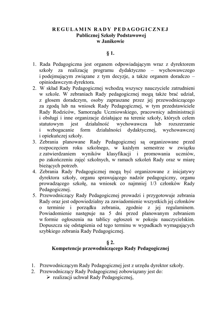 REGULAMIN RADY PEDAGOGICZNEJ Publicznej Szkoły Podstawowej w Janikowie § 1. 1. Rada Pedagogiczna jest organem odpowiadającym wraz z dyrektorem szkoły za realizację programu dydaktyczno – wychowawczego i podejmującym związane z tym decyzje, a także organem doradczo – opiniodawczym dyrektora. 2. W skład Rady Pedagogicznej wchodzą wszyscy nauczyciele zatrudnieni w szkole. W zebraniach Rady pedagogicznej mogą także brać udział, z głosem doradczym, osoby zapraszane przez jej przewodniczącego za zgodą lub na wniosek Rady Pedagogicznej, w tym przedstawiciele Rady Rodziców, Samorządu Uczniowskiego, pracownicy administracji i obsługi i inne organizacje działające na terenie szkoły, których celem statutowym jest działalność wychowawcza lub rozszerzanie i wzbogacanie form działalności dydaktycznej, wychowawczej i opiekuńczej szkoły. 3. Zebrania planowane Rady Pedagogicznej są organizowane przed rozpoczęciem roku szkolnego, w każdym semestrze w związku z zatwierdzaniem wyników klasyfikacji i promowania uczniów, po zakończeniu zajęć szkolnych, w ramach szkoleń Rady oraz w miarę bieżących potrzeb. 4. Zebrania Rady Pedagogicznej mogą być organizowane z inicjatywy dyrektora szkoły, organu sprawującego nadzór pedagogiczny, organu prowadzącego szkołę, na wniosek co najmniej 1/3 członków Rady Pedagogicznej. 5. Przewodniczący Rady Pedagogicznej prowadzi i przygotowuje zebrania Rady oraz jest odpowiedzialny za zawiadomienie wszystkich jej członków o terminie i porządku zebrania, zgodnie z jej regulaminem. Powiadomienie następuje na 5 dni przed planowanym zebraniem w formie ogłoszenia na tablicy ogłoszeń w pokoju nauczycielskim. Dopuszcza się odstąpienia od tego terminu w wypadkach wymagających szybkiego zebrania Rady Pedagogicznej. § 2. Kompetencje przewodniczącego Rady Pedagogicznej 1. Przewodniczącym Rady Pedagogicznej jest z urzędu dyrektor szkoły. 2. Przewodniczący Rady Pedagogicznej zobowiązany jest do: realizacji uchwał Rady Pedagogicznej, tworzenia życzliwej atmosfery sprzyjającej współdziałaniu wszystkich członków Rady Pedagogicznej w zakresie realizacji statutowych zadań szkoły oraz podnoszenia poziomu kształcenia, wychowania i opieki, oddziaływania na postawę nauczyciela, pobudzania go do twórczej pracy i podnoszenia kwalifikacji zawodowych, dbania o autorytet Rady Pedagogicznej, ochrony praw i godności nauczycieli, przekazywania przynajmniej dwukrotnie w ciągu roku szkolnego uogólnionych wniosków ze sprawowanego nadzoru pedagogicznego i informowania o pracy szkoły. zapoznawania Rady Pedagogicznej z obowiązującymi przepisami prawa oświatowego oraz omawiania trybu i form ich realizacji, analizowania stopnia realizacji uchwał Rady Pedagogicznej. czuwania nad sprawnym przebiegiem pracy Rady Pedagogicznej zgodnie z porządkiem obrad. § 3. Kompetencje Rady Pedagogicznej 1. W ramach swych kompetencji stanowiących rada: Uchwala Statut Szkoły. Podejmuje uchwały w sprawie innowacji i eksperymentów pedagogicznych. Ustala organizację doskonalenia zawodowego swoich członków a także wewnętrzne kształcenie. Uchwala Program Wychowawczy w porozumieniu z Radą Rodziców. Uchwala Program Profilaktyki Szkoły w porozumieniu z Radą Rodziców. Podejmuje uchwały w sprawie wyników klasyfikacji i promowania uczniów. Zatwierdza szkolne regulaminy o charakterze wewnętrznym. Zatwierdza plany pracy Szkoły. Zatwierdza wnioski wychowawców klas w sprawie przyznania uczniom nagród i wyróżnień oraz kar. 2. Rada Pedagogiczna opiniuje: Szkolny Zestaw Programów Nauczania. Tygodniowy rozkład zajęć lekcyjnych i pozalekcyjnych. Przydział czynności nauczycieli. Wprowadzenie dodatkowych zajęć edukacyjnych do szkolnego planu nauczania. Przedstawione przez dyrektora propozycje realizacji dwóch godzin obowiązkowych zajęć wychowania fizycznego w klasach IV-VI. Wnioski dyrektora w sprawie o przyznanie nauczycielom nagród, odznaczeń i wyróżnień. Projekty planów finansowych. Programy wychowania przedszkolnego i programy nauczania. Program z zakresu kształcenia ogólnego przed dopuszczeniem do użytku w szkole. 3. Rada Pedagogiczna ma prawo do: Wprowadzania zmian w tygodniowym rozkładzie zajęć dydaktycznych, realizacji treści kształcenia danego przedmiotu, przez odpowiednie zwiększanie lub zmniejszanie tygodniowego rozkładu godzin z tego przedmiotu, gdy jest to podyktowane np. okresową nieobecnością nauczyciela, przy czym ogólny tygodniowy wymiar godzin nauczania w danej klasie musi być zgodny z obowiązującym planem nauczania w cyklu okresowym. 4. Rada Pedagogiczna postanawia w sprawie: W wyjątkowych przypadkach postanowić o powtarzaniu klasy przez ucznia klasy I-III szkoły podstawowej na podstawie opinii wydanej przez lekarza lub publiczną poradnię psychologiczno-pedagogiczną, w tym publiczną poradnię specjalistyczną, oraz po zasięgnięciu opinii rodziców (prawnych opiekunów) ucznia. Wyrazić zgodę na egzamin klasyfikacyjny ucznia ( na prośbę ucznia lub rodziców ) nieklasyfikowanego z przyczyn nieusprawiedliwionych, W wyjątkowych przypadkach wyraża zgodę na egzamin poprawkowy ucznia z dwóch przedmiotów. 5. Do zadań Rady Pedagogicznej należy również: Czynny udział w planowaniu i organizowaniu pracy dydaktycznej, wychowawczej i opiekuńczej szkoły. Okresowe i roczne analizowanie i ocenianie stanu nauczania, wychowania i opieki oraz organizacyjnych i materialnych warunków pracy szkoły. Współpraca z rodzicami(opiekunami prawnymi) uczniów szkoły. Wydawanie opinii o pracy dyrektora szkoły w ramach procedury związanej z dokonywaniem oceny jego pracy przez organ 6. 7. 8. 9. prowadzący. w porozumieniu z organem sprawującym nadzór pedagogiczny szkoły Wydawanie opinii w sprawach związanych ze zmianą wychowawcy klasy. Rada Pedagogiczna przygotowuje projekt Statutu Szkoły lub jego zmian. Rada Pedagogiczna ustala regulamin swojej działalności, który musi być zgod