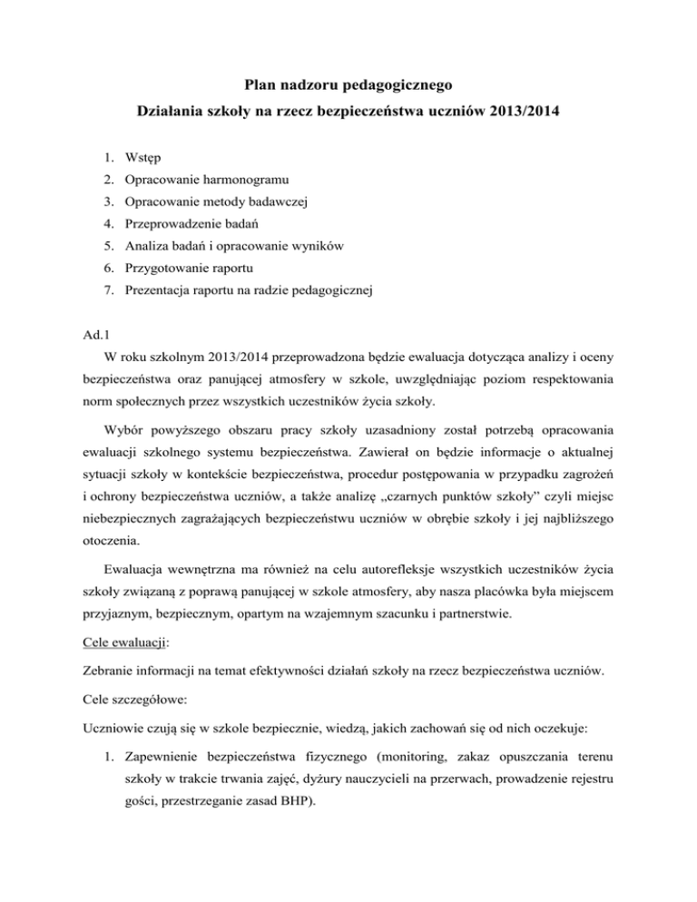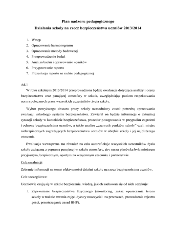 Plan nadzoru pedagogicznego Działania szkoły na rzecz bezpieczeństwa uczniów 2013/2014 1. Wstęp 2. Opracowanie harmonogramu 3. Opracowanie metody badawczej 4. Przeprowadzenie badań 5. Analiza badań i opracowanie wyników 6. Przygotowanie raportu 7. Prezentacja raportu na radzie pedagogicznej Ad.1 W roku szkolnym 2013/2014 przeprowadzona będzie ewaluacja dotycząca analizy i oceny bezpieczeństwa oraz panującej atmosfery w szkole, uwzględniając poziom respektowania norm społecznych przez wszystkich uczestników życia szkoły. Wybór powyższego obszaru pracy szkoły uzasadniony został potrzebą opracowania ewaluacji szkolnego systemu bezpieczeństwa. Zawierał on będzie informacje o aktualnej sytuacji szkoły w kontekście bezpieczeństwa, procedur postępowania w przypadku zagrożeń i ochrony bezpieczeństwa uczniów, a także analizę „czarnych punktów szkoły” czyli miejsc niebezpiecznych zagrażających bezpieczeństwu uczniów w obrębie szkoły i jej najbliższego otoczenia. Ewaluacja wewnętrzna ma również na celu autorefleksje wszystkich uczestników życia szkoły związaną z poprawą panującej w szkole atmosfery, aby nasza placówka była miejscem przyjaznym, bezpiecznym, opartym na wzajemnym szacunku i partnerstwie. Cele ewaluacji: Zebranie informacji na temat efektywności działań szkoły na rzecz bezpieczeństwa uczniów. Cele szczegółowe: Uczniowie czują się w szkole bezpiecznie, wiedzą, jakich zachowań się od nich oczekuje: 1. Zapewnienie bezpieczeństwa fizycznego (monitoring, zakaz opuszczania terenu szkoły w trakcie trwania zajęć, dyżury nauczycieli na przerwach, prowadzenie rejestru gości, przestrzeganie zasad BHP). 2. Zwracanie uwagi na przejawy przemocy psychicznej, mobbing rówieśniczy – szybka interwencja. 3. Przestrzeganie zasad i norm zachowania panujących w szkole. 4. Informowanie uczniów o zachowaniach akceptowanych i oczekiwaniach (zapoznawanie z regulaminami, procedurami – planami, programami). 5. Udostępnienie w/w programów i procedur na stronie internetowej i bibliotece szkolnej. Sformułowane pytania kluczowe i szczegółowe: 1. Jaki jest stopień poczucia bezpieczeństwa wśród uczniów? 2. Czy rzeczywistość szkolna potwierdza poczucia bezpieczeństwa? 3. Jakie działania służą zapewnieniu bezpieczeństwa w szkole? 4. Jakie są propozycje zmian i modyfikacji działań już funkcjonujących mających na celu poprawienie bezpieczeństwa w szkole? Ad. 2 Harmonogram ewaluacji L.p 1. 2. 3. Etap ewaluacji Dyskurs - wybór obszarów ewaluacyjnych i określenie założeń ewaluacji: powołanie zespołu ewaluacyjnego Opracowanie planu ewaluacji wewnętrznej wstępna faza planowania, zespół ewaluacyjny, przyjęcie planu wraz z ogólnym harmonogramem, Rada Pedagogiczna Przygotowanie projektu ewaluacji: przygotowanie założeń projektowych, opracowanie szczegółowego harmonogramu działań ewaluacyjnych, zgodnie Termin 31.08.2013r. Odpowiedzialni dyrektor, zespół kierowniczy 31.08.2013r. dyrektor zespół ewaluacyjny 15.09.2013 31.09.2013r. zespół ewaluacyjny, dyrektor 10.10.2013r. 15.10.2013r. zespół ewaluacyjny zespół ewaluacyjny, dyrektor 20.10.2013r. dyrektor 4. 5. 6. 7. 8. z założeniami projektowymi, przyjęcie projektu przez Radę Pedagogiczną Realizacja działań ewaluacyjnych: zbieranie danych, prowadzenie badań, gromadzenie i porządkowanie danych Analiza gromadzonych danych: pogrupowanie zabranych danych, analiza jakościowa i ilościowa, wypracowanie wniosków wynikających z przeprowadzonej analizy, wyprowadzenie rekomendacji Raport: przygotowanie wstępne raportu, zespół ewaluacyjny przyjęcie założeń raportu przez dyrektora, ostateczne opracowanie raportu z przeprowadzonej ewaluacji 29.10.2013r. zgodnie z harmonogramem projektowym około 5 zakończeniu danych około 10 zakończeniu danych realizatorzy poszczególnych badań ewaluacyjnych, przewodniczący zespołu ewaluacyjnego jako koordynator zespoły zadaniowe dni po nauczycieli (np. zbierania zespoły przedmiotowe), dni po zespół ewaluacyjny zbierania zespół ewaluacyjny około 10 zakończeniu danych dni po zbierania około 15 dni po zakończeniu zbierania danych około 2 dni po przygotowaniu wstępnej wersji raportu około 5 dni po przygotowaniu wstępnej wersji raportu zespół ewaluacyjny zespół ewaluacyjny, dyrektor zespół ewaluacyjny zespół ewaluacyjny, dyrektor Popularyzacja: prezentacja raportu Radzie Pedagogicznej, prezentacja raportu adresatowi, jeżeli nie jest w nim Rada Pedagogiczna, prezentacja wybranej części raportu respondentom w ciągu tygodnia od opracowania raportu 2 do 4 dni po prezentacji raportu Radzie Pedagogicznej po prezentacji raportu adresatowi Wdrożenie działań wynikających z rekomendacji: przygotowanie konkretnych działań wynikających z rekomendacji zgodnie z dyrektor, zespoły harmonogramem przedmiotowe realizacji działań nauczycieli. korygujących lub wyznaczeni naprawczych nauczyciele, dyrektor wyznaczeni nauczyciele ewaluacyjnych, wdrożenie przyjętych działań, monitoring efektów wdrażanych działań 2014/2015 przewodniczący zespołu ewaluacyjnego 2014/2015 Ad. 3 Narzędzia badawcze wykorzystane do diagnozy środowiska szkolnego. Do zdiagnozowania problematyki bezpieczeństwa w szkole wykorzystane zostaną następujące narzędzia badawcze: -ankieta skierowana do uczniów, rodziców, nauczycieli i pracowników szkoły, -wywiad, -obserwacja. Próba badawcza obejmuje: 1. Uczniów klas 2-5. 2. Wszystkich wychowawców i wybranych nauczycieli. 3. Pracowników obsługi, a w szczególności woźnego, woźną, panie sprzątaczki, konserwatora. 4. Pedagoga szkolnego. Zespół ds. ewaluacji 1. Małgorzata Makowska 2. Ewelina Basińska 3. Anna Sieńko-Niedźwiadek 4. Radosław Rudnicki