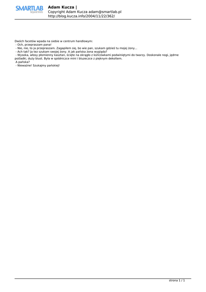 Adam Kucza | Copyright Adam Kucza [email protected] http://blog.kucza.info/2004/11/22/362/ Dwóch facetów wpada na siebie w centrum handlowym: - Och, przepraszam pana! - Nie, nie, to ja przepraszam. Zagapiłem się, bo wie pan, szukam gdzieś tu mojej żony... - Ach tak? Ja tez szukam swojej żony. A jak pańska żona wygląda? - Wysoka, włosy płomienny kasztan, ścięte na okrągło z końcówkami podwiniętymi do twarzy. Doskonale nogi, jędrne pośladki, duży biust. Była w spódniczce mini i bluzeczce z pięknym dekoltem. A pańska? - Nieważne! Szukajmy pańskiej! strona 1 / 1
