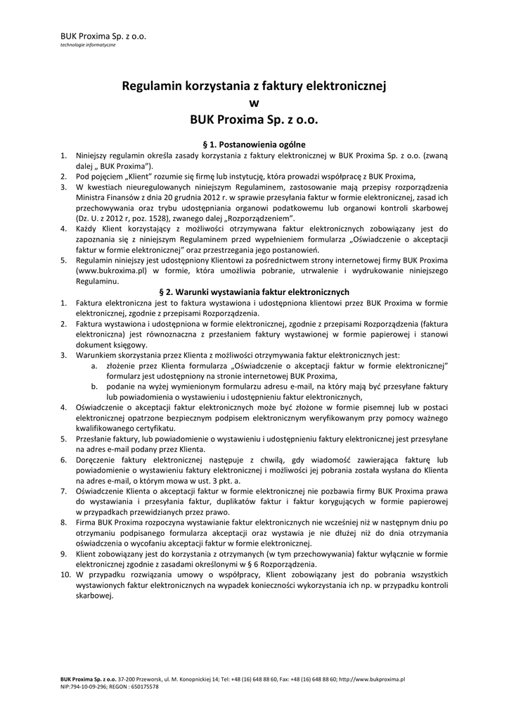 BUK Proxima Sp. z o.o. technologie informatyczne Regulamin korzystania z faktury elektronicznej w BUK Proxima Sp. z o.o. 1. 2. 3. 4. 5. 1. § 1. Postanowienia ogólne Niniejszy regulamin określa zasady korzystania z faktury elektronicznej w BUK Proxima Sp. z o.o. (zwaną dalej „ BUK Proxima”). Pod pojęciem „Klient” rozumie się firmę lub instytucję, która prowadzi współpracę z BUK Proxima, W kwestiach nieuregulowanych niniejszym Regulaminem, zastosowanie mają przepisy rozporządzenia Ministra Finansów z dnia 20 grudnia 2012 r. w sprawie przesyłania faktur w formie elektronicznej, zasad ich przechowywania oraz trybu udostępniania organowi podatkowemu lub organowi kontroli skarbowej (Dz. U. z 2012 r, poz. 1528), zwanego dalej „Rozporządzeniem”. Każdy Klient korzystający z możliwości otrzymywana faktur elektronicznych zobowiązany jest do zapoznania się z niniejszym Regulaminem przed wypełnieniem formularza „Oświadczenie o akceptacji faktur w formie elektronicznej” oraz przestrzegania jego postanowień. Regulamin niniejszy jest udostępniony Klientowi za pośrednictwem strony internetowej firmy BUK Proxima (www.bukroxima.pl) w formie, która umożliwia pobranie, utrwalenie i wydrukowanie niniejszego Regulaminu. § 2. Warunki wystawiania faktur elektronicznych Faktura elektroniczna jest to faktura wystawiona i udostępniona klientowi przez BUK Proxima w formie elektronicznej, zgodnie z przepisami Rozporządzenia. 2. Faktura wystawiona i udostępniona w formie elektronicznej, zgodnie z przepisami Rozporządzenia (faktura elektroniczna) jest równoznaczna z przesłaniem faktury wystawionej w formie papierowej i stanowi dokument księgowy. 3. Warunkiem skorzystania przez Klienta z możliwości otrzymywania faktur elektronicznych jest: a. złożenie przez Klienta formularza „Oświadczenie o akceptacji faktur w formie elektronicznej” formularz jest udostępniony na stronie internetowej BUK Proxima, b. podanie na wyżej wymienionym formularzu adresu e-mail, na który mają być przesyłane faktury lub powiadomienia o wystawieniu i udostępnieniu faktur elektronicznych, 4. Oświadczenie o akceptacji faktur elektronicznych może być złożone w formie pisemnej lub w postaci elektronicznej opatrzone bezpiecznym podpisem elektronicznym weryfikowanym przy pomocy ważnego kwalifikowanego certyfikatu. 5. Przesłanie faktury, lub powiadomienie o wystawieniu i udostępnieniu faktury elektronicznej jest przesyłane na adres e-mail podany przez Klienta. 6. Doręczenie faktury elektronicznej następuje z chwilą, gdy wiadomość zawierająca fakturę lub powiadomienie o wystawieniu faktury elektronicznej i możliwości jej pobrania została wysłana do Klienta na adres e-mail, o którym mowa w ust. 3 pkt. a. 7. Oświadczenie Klienta o akceptacji faktur w formie elektronicznej nie pozbawia firmy BUK Proxima prawa do wystawiania i przesyłania faktur, duplikatów faktur i faktur korygujących w formie papierowej w przypadkach przewidzianych przez prawo. 8. Firma BUK Proxima rozpoczyna wystawianie faktur elektronicznych nie wcześniej niż w następnym dniu po otrzymaniu podpisanego formularza akceptacji oraz wystawia je nie dłużej niż do dnia otrzymania oświadczenia o wycofaniu akceptacji faktur w formie elektronicznej. 9. Klient zobowiązany jest do korzystania z otrzymanych (w tym przechowywania) faktur wyłącznie w formie elektronicznej zgodnie z zasadami określonymi w § 6 Rozporządzenia. 10. W przypadku rozwiązania umowy o współpracy, Klient zobowiązany jest do pobrania wszystkich wystawionych faktur elektronicznych na wypadek konieczności wykorzystania ich np. w przypadku kontroli skarbowej. BUK Proxima Sp. z o.o. 37-200 Przeworsk, ul. M. Konopnickiej 14; Tel: +48 (16) 648 88 60, Fax: +48 (16) 648 88 60; http://www.bukproxima.pl NIP:794-10-09-296; REGON : 650175578 BUK Proxima Sp. z o.o. technologie informatyczne 1. 2. 3. 4. 1. 2. § 3. Zmiany adresu e-mail i rezygnacja Zmiany adresu e-mail, na który mają być przesyłanie powiadomienia o wystawieniu i udostępnieniu faktury elektronicznej można dokonać pisemnie przy wykorzystaniu formularza „Zmiana adresu e-mail do przesyłania faktury elektronicznej” udostępnionego na stronie internetowej firmy BUK Proxima. W przypadku braku powiadomienia firmy BUK Proxima o zmianie adresu e-mail, faktury elektroniczne uważa się za skutecznie doręczone po ich wysłaniu lub udostępnieniu i przesłaniu powiadomienia o ich wystawieniu na ostatni podany przez Klienta adres e-mail. Rezygnacji z możliwości wystawiania i otrzymywania faktur elektronicznych można dokonać w formie pisemnej przy wykorzystaniu formularza „Oświadczenie o wycofaniu akceptacji faktur w formie elektronicznej” udostępnionego na stronie internetowej firmy BUK Proxima. Ponowna aktywacja możliwości otrzymywania faktur elektronicznych wymaga ponownego złożenia oświadczenia, o którym mowa w §2 ust.3 pkt. a. niniejszego Regulaminu. § 4. Postanowienia końcowe Firma BUK Proxima zastrzega sobie prawo zmiany niniejszego Regulaminu. Wszelkie zmiany będą publikowane na stronie internetowej BUK Proxima (www.bukproxima.pl) Regulamin i wszelkie jego zmiany wchodzą w życie z dniem opublikowania na stronie internetowej firmy BUK Proxima. BUK Proxima Sp. z o.o. 37-200 Przeworsk, ul. M. Konopnickiej 14; Tel: +48 (16) 648 88 60, Fax: +48 (16) 648 88 60; http://www.bukproxima.pl NIP:794-10-09-296; REGON : 650175578