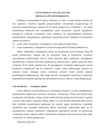 I ETAP EDUKACYJNY: KLASY I-III EDUKACJA WCZESNOSZKOLNA Edukacja wczesnoszkolna to proces rozłożony na 3 lata, w czasie którego dziecko ma być stopniowo i możliwie łagodnie przeprowadzone z kształcenia zintegrowanego do nauczania przedmiotowego w klasach IV-VI szkoły podstawowej. W klasach I – III szkoły podstawowej konieczne jest uwzględnienie przez nauczycieli i innych specjalistów pracujących z dziećmi w młodszym wieku szkolnym ich indywidualnych możliwości intelektualnych, emocjonalnych, społecznych i psychofizycznych. Edukacja wczesnoszkolna opisana jest poprzez: 1) zestaw celów kształcenia i wynikających z nich ogólnych zadań szkoły; 2) wykaz wiadomości i umiejętności ucznia kończącego klasę III szkoły podstawowej. Zakres wiadomości i umiejętności, jakimi ma dysponować uczeń kończący klasę III szkoły podstawowej, ustalono tak, by nauczyciel mógł je zrealizować z uczniami o przeciętnych możliwościach. Jest to ważne założenie, gdyż wiadomości i umiejętności ukształtowane w klasach I-III szkoły podstawowej stanowią bazę i punkt wyjścia do nauki w klasach IV-VI szkoły podstawowej. W sprzyjających warunkach edukacyjnych można kształcenie zorganizować tak, by uczniowie w ciągu I etapu edukacyjnego nauczyli się znacznie więcej. Z drugiej strony, niektórym uczniom trzeba udzielić pomocy psychologiczno-pedagogicznej, żeby mogli sprostać wymaganiom określonym w podstawie programowej kształcenia ogólnego dla szkół podstawowych w zakresie I etapu edukacyjnego. Cele kształcenia – wymagania ogólne Celem edukacji wczesnoszkolnej jest wspomaganie dziecka w rozwoju intelektualnym, emocjonalnym, społecznym, etycznym, fizycznym i estetycznym. Ważne jest również takie wychowanie, aby dziecko w miarę swoich możliwości było przygotowane do życia w zgodzie z samym sobą, ludźmi i przyrodą. Należy zadbać o to, aby dziecko odróżniało dobro od zła, było świadome przynależności społecznej (do rodziny, grupy rówieśniczej i wspólnoty narodowej) oraz rozumiało konieczność dbania o przyrodę. Jednocześnie dąży się do ukształtowania systemu wiadomości i umiejętności potrzebnych dziecku do poznawania i rozumienia świata, radzenia sobie w codziennych sytuacjach oraz do kontynuowania nauki w klasach IV-VI szkoły podstawowej. Zadaniem szkoły jest: 1) realizowanie programu nauczania skoncentrowanego na dziecku, na jego indywidualnym tempie rozwoju i możliwościach uczenia się; 2) respektowanie trójpodmiotowości oddziaływań wychowawczych i kształcących: uczeń-szkoła-dom rodzinny; 3) rozwijanie predyspozycji i zdolności poznawczych dziecka; 4) kształtowanie u dziecka pozytywnego stosunku do nauki oraz rozwijanie ciekawości w poznawaniu otaczającego świata i w dążeniu do prawdy; 5) poszanowanie godności dziecka; zapewnienie dziecku przyjaznych, bezpiecznych i zdrowych warunków do nauki i zabawy, działania indywidualnego i zespołowego, rozwijania samodzielności oraz odpowiedzialności za siebie i najbliższe otoczenie, ekspresji plastycznej, muzycznej i ruchowej, aktywności badawczej, a także działalności twórczej; 6) wyposażenie dziecka w umiejętność czytania i pisania, w wiadomości i sprawności matematyczne potrzebne w sytuacjach życiowych i szkolnych oraz przy rozwiązywaniu problemów; 7) dbałość o to, aby dziecko mogło nabywać wiedzę i umiejętności potrzebne do rozumienia świata, w tym zagwarantowanie mu dostępu do różnych źródeł informacji i możliwości korzystania z nich; 8) sprzyjanie rozwojowi cech osobowości dziecka koniecznych do aktywnego i etycznego uczestnictwa w życiu społecznym. Treści nauczania – wymagania szczegółowe na koniec klasy III szkoły podstawowej 1. Edukacja polonistyczna. Uczeń kończący klasę III: 1) korzysta z informacji: a) uważnie słucha wypowiedzi i korzysta z przekazywanych informacji, b) rozumie sens kodowania oraz dekodowania informacji; odczytuje uproszczone rysunki, piktogramy, znaki informacyjne, zna wszystkie litery alfabetu; czyta i rozumie teksty przeznaczone dla dzieci i wyciąga z nich wnioski, c) wyszukuje w tekście potrzebne informacje i w miarę możliwości korzysta ze słowników i encyklopedii przeznaczonych dla dzieci, d) zna formy użytkowe: życzenia, zaproszenie, zawiadomienie, list, notatka do kroniki; potrafi z nich korzystać; 2) analizuje i interpretuje teksty kultury: a) przejawia wrażliwość estetyczną, rozszerza zasób słownictwa poprzez kontakt z dziełami literackimi, b) w tekście literackim zaznacza wybrane fragmenty, określa czas i miejsce akcji, wskazuje głównych bohaterów, c) czyta teksty i recytuje wiersze, z uwzględnieniem interpunkcji i intonacji, d) ma potrzebę kontaktu z literaturą i sztuką dla dzieci, czyta wybrane przez siebie i wskazane przez nauczyciela książki, wypowiada się na ich temat; 3) tworzy wypowiedzi: a) w formie ustnej i pisemnej: kilkuzdaniową wypowiedź, krótkie opowiadanie i opis, list prywatny, życzenia, zaproszenie, b) dobiera właściwe formy komunikowania się w różnych sytuacjach społecznych, c) uczestniczy w rozmowach, także inspirowanych literaturą: zadaje pytania, udziela odpowiedzi, prezentuje własne zdanie i formułuje wnioski; poszerza zakres słownictwa i struktur składniowych, d) dba o kulturę wypowiadania się; poprawnie artykułuje głoski, akcentuje wyrazy, stosuje pauzy i właściwą intonację w zdaniu oznajmującym, pytającym i rozkazującym; stosuje formuły grzecznościowe, e) rozumie pojęcia: wyraz, głoska, litera, sylaba, zdanie; dostrzega różnicę pomiędzy literą i głoską; dzieli wyrazy na sylaby; oddziela wyrazy w zdaniu, zdania w tekście, f) pisze czytelnie i estetycznie (przestrzega zasad kaligrafii), dba o poprawność gramatyczną, ortograficzną oraz interpunkcyjną, g) 4) przepisuje teksty, pisze z pamięci i ze słuchu; wypowiada się w małych formach teatralnych: a) uczestniczy w zaba
