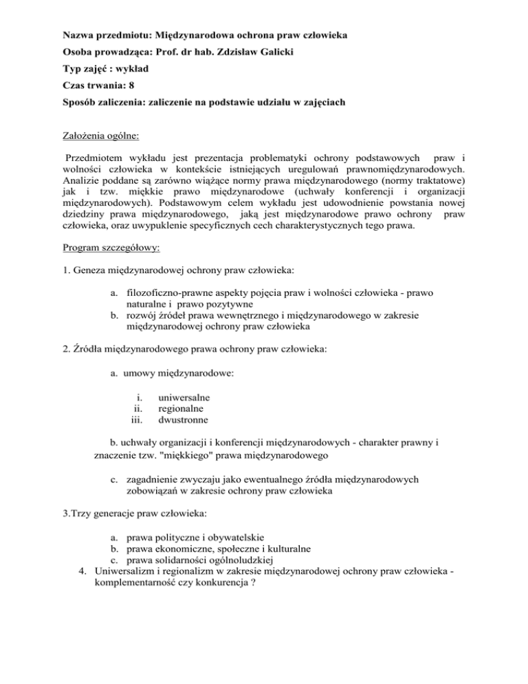 Nazwa przedmiotu: Międzynarodowa ochrona praw człowieka Osoba prowadząca: Prof. dr hab. Zdzisław Galicki Typ zajęć : wykład Czas trwania: 8 Sposób zaliczenia: zaliczenie na podstawie udziału w zajęciach Założenia ogólne: Przedmiotem wykładu jest prezentacja problematyki ochrony podstawowych praw i wolności człowieka w kontekście istniejących uregulowań prawnomiędzynarodowych. Analizie poddane są zarówno wiążące normy prawa międzynarodowego (normy traktatowe) jak i tzw. miękkie prawo międzynarodowe (uchwały konferencji i organizacji międzynarodowych). Podstawowym celem wykładu jest udowodnienie powstania nowej dziedziny prawa międzynarodowego, jaką jest międzynarodowe prawo ochrony praw człowieka, oraz uwypuklenie specyficznych cech charakterystycznych tego prawa. Program szczegółowy: 1. Geneza międzynarodowej ochrony praw człowieka: a. filozoficzno-prawne aspekty pojęcia praw i wolności człowieka - prawo naturalne i prawo pozytywne b. rozwój źródeł prawa wewnętrznego i międzynarodowego w zakresie międzynarodowej ochrony praw człowieka 2. Źródła międzynarodowego prawa ochrony praw człowieka: a. umowy międzynarodowe: i. ii. iii. uniwersalne regionalne dwustronne b. uchwały organizacji i konferencji międzynarodowych - charakter prawny i znaczenie tzw. "miękkiego" prawa międzynarodowego c. zagadnienie zwyczaju jako ewentualnego źródła międzynarodowych zobowiązań w zakresie ochrony praw człowieka 3.Trzy generacje praw człowieka: a. prawa polityczne i obywatelskie b. prawa ekonomiczne, społeczne i kulturalne c. prawa solidarności ogólnoludzkiej 4. Uniwersalizm i regionalizm w zakresie międzynarodowej ochrony praw człowieka komplementarność czy konkurencja ? 5. Instytucjonalizm jako cecha charakterystyczna międzynarodowej ochrony praw człowieka: a. organy o uprawnieniach opiniodawczych, b. organy sądowe i quasisądowe 6. Powszechna Deklaracja Praw Człowieka i Międzynarodowe Pakty Praw Człowieka – analiza porównawcza . Bibliografia: J. Hołda, Z. Hołda, D. Ostrowska, J. Rybczyńska: Prawa człowieka zarys wykładu, wyd. 3, Warszawa 2011 A. Przyborowska-Klimczak: Prawo międzynarodowe publiczne – Wybór dokumentów, Lublin 2008 (Wyd. „Verba”) B.Banaszak, A.Bisztyga, K.Complak, M.Jabłoński, R.Wieruszewski, K.Wójtowicz : System ochrony praw człowieka, wyd.Zakamycze, (wyd.2) Kraków 2005. Prawa człowieka i systemy ich ochrony. Teksty źródłowe (praca zbiorowa), wyd. Uniwersytetu Wrocławskiego, Wrocław 2002. Prawa człowieka i systemy ich ochrony. Zarys wykładu (praca zbiorowa), wyd. Uniwersytetu Wrocławskiego, Wrocław 2004. R.Kuźniar : Prawa człowieka - prawo, instytucje, stosunki międzynarodowe, wyd. Scholar, Warszawa 2000,