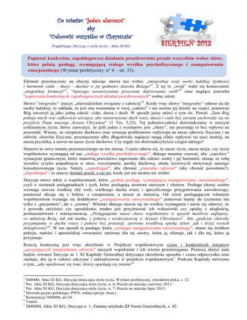 Co miesiac “jeden element” aby “Odnowić wszystko w Chrystusie” Pogłębiając Decyzję o stylu życia - Akta XI KG SIERPIEÑ 2013 Popierać konkretne, zapobiegawcze działania prozdrowotne przede wszystkim wobec sióstr, które pełnią posługę, wymagającą stałego wysiłku psychofizycznego i zaangażowania emocjonalnego (Wymiar profetyczny: n° 8 – str. 33). Element przeznaczony na obecny miesiąc stawia nas wobec „integralnej wizji osoby ludzkiej (jedności i harmonii ciała - duszy - ducha) w jej godności dziecka Bożego”1. Z tej to „wizji” rodzi się konieczność „inegralnej formacji”2, “lepszego towarzyszenia procesom dojrzewania osób”3 oraz nagląca potrzeba “popierania konkretnych, zapobiegawczych działań prozdrowotnych” wobec sióstr. Słowo “integralny” znaczy „nierozdzielnie związany z całością”4. Kiedy więc słowo “integralny” odnosi się do osoby ludzkiej, to zakłada, że jest ona rozumiana w swej „całości” i nie można jej dzielić na części, ponieważ Bóg stworzył ją jako jedną całość: ciało, dusza i duch. W sposób jasny mówi o tym św. Paweł: „Sam Bóg pokoju niech was całkowicie uświęca, aby nienaruszony duch wasz, dusza i ciało bez zarzutu zachowały się na przyjście Pana naszego Jezusa Chrystusa” (1 Tes. 5,23). Tej jedności-całości doświadczamy w naszym codziennym życiu; łatwo zauważyć, że jeśli jeden z wymiarów jest „chory”, nie pozostaje to bez wpływu na pozostałe. Wiemy, że cierpienie duchowe oraz sytuacje problemowe wpływają na nasze zdrowie fizyczne i na odwrót, choroba fizyczna, przemęczenie albo długotrwałe napięcie mogą silnie wpływać na nasz nastrój, na naszą psychikę, a nawet na nasze życie duchowe. Czy nigdy nie doświadczyłyście czegoś takiego? Stanowi to serce tematu przeznaczonego na ten misiąc. Często zdarza się, że nasze życie, nasza misja, czy życie wspólnotowe wymagają od nas „stałego wysiłku psychofizycznego”, dlatego musimy czuwać, aby „zapobiec” sytuacjom granicznym, które stanowią prawdziwe zagrożenie dla całości osoby i jej harmonii, niosąc ze sobą wysokie ryzyko popadnięcia w stres, wyczerpanie, pustkę duchową, utratę życiowych motywacji naszego konsekrowanego życia. Należy „zapobiegać”, aby chronić „interalne zdrowie” (aby chronić powołanie!). „Zapobiegać”, to znaczy działać przed, a nie po, kiedy już nie można nic zrobić. Decyzja mówi także o współsiostrach, które „pełnią posługę, wymagającą zaangażowania emocjonalnego”, czyli o siostrach pielęgniarkach i tych, które posługują siostrom starszym i chorym. Posługa chorej osobie wymaga zawsze wielkiej siły woli, wielkiego ducha wiary i specyficznego przygotowania zawodowego, ponieważ obcuje się z bólem, z cierpieniem, a nawet ze śmiercią. Od sióstr posługującym własnym współsiostrom wymaga się dodatkowo „zaangażowania emocjonalnego” ponieważ mamy do czynienia nie tylko z „pacjentem”, ale z „siostrą”. Właśnie dlatego stawia się im wielkie wymagania i może się zdarzyć, że z powodu zażyłości czy spoufalenia, trudno jest przyjmować ich wskazówki czy opiekę z uległością, posłuszeństwem i wdzięcznością. „Pielęgnujemy nasze chore współsiostry w sposób możliwie najlepszy, «z miłością Bożą, tak jak matka, z pokorą i serdecznością w Jezusie Chrystusie»5. Ale „podczas choroby przyjmujemy w duchu wiary i pokory bez pretensji, zarówno troskliwą opiekę sióstr, jak i krzyż swoich dolegliwości”6. W ten sposób ta posługa, która „wymaga zaangażowania emocjonalnego”, stanie się źródłem pokoju, radości i apostolskiej owocności zarówno dla tej siostry, która ją ofiaruje, jak i dla tej, która ją przyjmuje. Rzeczą konieczną jest więc określenie w Projekcie wspólnotowym czasu i konkretnych inicjatyw „sprzyjających integralnemu zdrowiu” naszych współsióstr i ich wierne przestrzeganie. Pomocą służyć nam będzie również Decyzja nr 1 XI Kapituły Generalnej dotycząca określenia sposobu i czasu odpoczynku oraz zachęta, aby ją w całości odczytać i zaktualizować w projekcie wspólnotowym7. Podczas Kapituły mówiono o tym, „aby opiekować się tymi, którzy opiekują się innymi!” 1 SMMM, Akta XI KG, Decyzja dotycząca stylu życia, Wymiar profetyczny, charakterystyka, s. 32. Por. Akta XI KG, Decyzja dotycząca stylu życia, n. 6; Puzzle na miesiąc czerwiec 2013. 3 Por. Akta XI KG, Decyzja dotycząca stylu życia, n. 7; Puzzle na miesiąc lipec 2013. 4 Słownik języka polskiego, PWN, online (przyp. tłum.). 5 Konstytucje SMMM, art 54. 6 Tamże. 2 7 SMMM, Akta XI KG, Decyzja n. 1, Zmiany artykułu 23 Norm Generalnych, s. 42. Jeśli nawet może wydawać się, że refleksja na ten miesiąc jest przeznaczona tylko dla wspólnot, w których znajdują się otaczane opieką współsiostry starsze lub chore, to w rzeczywistości skierowana jest ona do nas wszystkich i przełożona lokalna jest w pierwszym rzędzie zobowiązana do zapewnienia tego powierzonym jej siostrom. Jeśli „miłość” powoduje chorobę, to nie jest prawdziwą „miłością”. Słuszne i zrównoważone dbanie o integralne zdrowie jest obowiązkiem wobec Boga i pomoże nam pogodniej przeżywać nasze powołanie i misję, uczyni z nas osoby konsekrowane pogodne, szczęśliwe, piękne pięknem tego, kto kocha i służy Chrystusowi w bliźnim. Życzę owocnej refleksji!