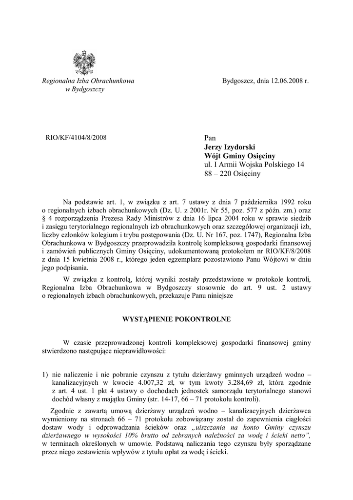 Regionalna Izba Obrachunkowa w Bydgoszczy RIO/KF/4104/8/2008 Bydgoszcz, dnia 12.06.2008 r. Pan Jerzy Izydorski Wójt Gminy Osięciny ul. I Armii Wojska Polskiego 14 88 – 220 Osięciny Na podstawie art. 1, w związku z art. 7 ustawy z dnia 7 października 1992 roku o regionalnych izbach obrachunkowych (Dz. U. z 2001r. Nr 55, poz. 577 z późn. zm.) oraz § 4 rozporządzenia Prezesa Rady Ministrów z dnia 16 lipca 2004 roku w sprawie siedzib i zasięgu terytorialnego regionalnych izb obrachunkowych oraz szczegółowej organizacji izb, liczby członków kolegium i trybu postępowania (Dz. U. Nr 167, poz. 1747), Regionalna Izba Obrachunkowa w Bydgoszczy przeprowadziła kontrolę kompleksową gospodarki finansowej i zamówień publicznych Gminy Osięciny, udokumentowaną protokołem nr RIO/KF/8/2008 z dnia 15 kwietnia 2008 r., którego jeden egzemplarz pozostawiono Panu Wójtowi w dniu jego podpisania. W związku z kontrolą, której wyniki zostały przedstawione w protokole kontroli, Regionalna Izba Obrachunkowa w Bydgoszczy stosownie do art. 9 ust. 2 ustawy o regionalnych izbach obrachunkowych, przekazuje Panu niniejsze WYSTĄPIENIE POKONTROLNE W czasie przeprowadzonej kontroli kompleksowej gospodarki finansowej gminy stwierdzono następujące nieprawidłowości: 1) nie naliczenie i nie pobranie czynszu z tytułu dzierżawy gminnych urządzeń wodno – kanalizacyjnych w kwocie 4.007,32 zł, w tym kwoty 3.284,69 zł, która zgodnie z art. 4 ust. 1 pkt 4 ustawy o dochodach jednostek samorządu terytorialnego stanowi dochód własny z majątku Gminy (str. 14-17, 66 – 71 protokołu kontroli). Zgodnie z zawartą umową dzierżawy urządzeń wodno – kanalizacyjnych dzierżawca wymieniony na stronach 66 – 71 protokołu zobowiązany został do zapewnienia ciągłości dostaw wody i odprowadzania ścieków oraz „uiszczania na konto Gminy czynszu dzierżawnego w wysokości 10% brutto od zebranych należności za wodę i ścieki netto”, w terminach określonych w umowie. Podstawą naliczania tego czynszu były sporządzane przez niego zestawienia wpływów z tytułu opłat za wodę i ścieki. Wykazane z tych tytułów wpływy za I półrocze 2006 roku wynosiły ogółem 225.752,60 zł, w tym za dostarczanie wody 185.679,38 zł oraz za odprowadzenie ścieków 40.073,22 zł. Dzierżawca wyliczył, iż kwota należnego czynszu dzierżawnego wynosiła 18.567,93 zł. Na powyższą kwotę Urząd Gminy w Osięcinach wystawił fakturę VAT Nr 13/W-K/06, którą dzierżawca zapłacił w dniu 31 sierpnia 2006 roku. Kontrola wykazała, że do naliczenia wysokości należnego czynszu przyjęto jedynie wartość sprzedanej wody, nie uwzględniono natomiast wartości sprzedanych usług związanych z odprowadzeniem ścieków w kwocie 40.073,22 zł. Należna wpłata na rzecz Gminy Osięciny z tego tytułu winna wynieść 4.007,32 zł, w tym czynsz – stanowiący dochód gminy - 3.284,69 zł oraz podatek VAT na kwotę 722,63 zł. Nie naliczenie i nie pobranie ww. kwoty przez Urząd Gminy narusza treść przepisu art. 4 ust. 1 pkt 4 ustawy o dochodach samorządu terytorialnego, zgodnie z którym źródłem dochodów gminy są m.in. dochody z majątku gminy (Dz.U. z 2003 r. Nr 203, poz. 1966 ze zm.), oraz zasad gospodarki finansowej określonych w art. 138 pkt 1 w zw. z art. 189 ust. 1 ustawy z dnia 30 czerwca 2005 r. o finansach publicznych. Ustalenie i pobranie należności budżetowych z tytułu dzierżawy gminnych urządzeń wodno-kanalizacyjnych, wynikających z zawartej z dzierżawcą umowy w wysokości niższej niż wynikająca z prawidłowego obliczenia wypełnia znamiona czynu naruszenia dyscypliny finansów publicznych, określonego w art. 5 ust. 1 pkt 1 i pkt 2 ustawy z dnia 17 grudnia 2004r. o odpowiedzialności za naruszenie dyscypliny finansów publicznych (Dz.U. z 2005r. Nr 14, poz. 114 z późn. zm.). Odpowiedzialność z tego tytułu ponosi Pan Jerzy Izydorski – Wójt Gminy Osięciny, do obowiązków, którego stosownie do przepisu art. 25, w związku z art. 23 ust. 1 ustawy z dnia 21 sierpnia 1997 roku o gospodarce nieruchomościami należy gospodarowanie gminnym zasobem nieruchomości, w tym m.in. wykonywanie czynności związanych z naliczaniem należności za nieruchomości udostępniane z zasobu oraz prowadzenie windykacji tych należności. W złożonym na tą okoliczność wyjaśnieniu Wójt oświadczył, iż nie jest w stanie wyjaśnić przyczyn ustalenia opłaty w nieprawidłowej wysokości. Kontrola wykazała, że Wójt Gminy nie określił w Urzędzie Gminy procedur związanych z procesem gromadzenia środków publicznych uzyskiwanych m.in. z umów dzierżawy. Ustalono również, że żadnemu z pracowników jednostki nie powierzono odpowiedzialności za kontrolę rzetelności składanych przez dzierżawcę rozliczeń. Jak ustalono brak tych procedur stanowił istotną przyczynę prowadzącą do powstania powyższej nieprawidłowości skutkującej uszczupleniem należnych Gminie dochodów z tytułu opłat za dzierżawę sieci wodociągowej oraz sieci kanalizacyjnej. Odpowiedzialność Wójta Gminy Osięciny za powyższe nieprawidłowości wynika także z treści przepisu art. 44 ust. 1 wyżej cytowanej ustawy o finansach publicznych, który stanowi, że kierownik jednostki sektora finansów publicznych jest odpowiedzialny za całość gospodarki finansowej. Przeprowadzona kontrola ujawniła również brak nadzoru i kontroli ze strony Urzędu Gminy w zakresie prawidłowości rozliczeń przedkładanych przez dzierżawcę sieci wodno – kanalizacyjnej i przyjmowanie od dzierżawcy tych urządzeń nierzetelnie sporządzonych zestawień uzyskanych wpływów z tytułu opłat za wodę i ścieki, od wysokości których uzależniony był dochód gminy. O nierzetelności ww. zestawień świadczą następujące ustalenia kontroli: • faktura VAT (bez numeru) z dnia 2 września 2006 roku wystawiona na małżonka Pani Skarbnik za zakupioną wodę i odprowadzane ścieki na kwotę 30,56 zł