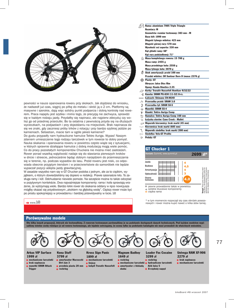 GT Chucker 1 Kontakt: Summit, www.summit.pl Jazda 2699 zł* Opłacalność 4 4,5 4 3 Ocena końcowa 4,0 Budowa Amortyzacja pewne prowadzenie także w powietrzu solidne kluczowe komponenty ciężka rama Uwaga! Tekst jest integralną częścią testu. Wnioskowanie tylko na podstawie punktacji może prowadzić do błędów w interpretacji pewności w nauce opanowania roweru przy skokach. Jak dojdziesz do wniosku, że nadszedł już czas, sięgnij po piłkę do metalu i skróć ją o 2 cm. Platformy są masywne i szerokie, dają więc solidny punkt podparcia i dobrą kontrolę nad rowerem. Praca napędu jest szybka i mimo tego, że precyzją nie zachwyca, sprawdzi się w każdym rodzaju jazdy. Przydałby się napinacz, ale najpierw zdecyduj czy wolisz go od przedniej przerzutki. Bo ta ostatnia z pewnością przyda się na dłuższych wycieczkach, na podjazdach i przy dojeżdżaniu na miejscówki. Brak napinacza da się we znaki, gdy zaczniesz próby trików z rotacją i przy bardzo szybkiej jeździe po kamieniach. Sebastian, macie tam w ogóle jakieś kamienie? Do gustu przypadły nam hydrauliczne hamulce Tektro Auriga. Wypas! Naszym zdaniem umieszczenie tego rodzaju tarczówek w tym rowerze to dobry pomysł. Nauka skakania i opanowania roweru w powietrzu często wiąże się z sytuacjami, w których sprawnie działające hamulce z dobrą modulacją mogą wiele pomóc. Co do pracy pozostałych komponentów Chuckera nie można mieć zastrzeżeń. Rower ponad wszelką wątpliwość nadaje się do stawiania pierwszych kroków w dircie i streecie, jednocześnie będąc dobrym narzędziem do przemieszczania się w terenie, np. podczas wypadów do lasu. Przód roweru jest niski, co odpowiada obecnie przyjętym trendom i w przeciwieństwie do samoróbek nie będzie wypaczał pozycji adepta jazdy grawitacyjnej. W zasadzie wszystko nam się w GT Chucker podoba z jednym, ale za to ciężkim, wyjątkiem, o którym dowiedzieliśmy się dopiero w redakcji. Prawie szesnaście kilo. To zasługa ramy i kół. Odchudzanie niewiele pomoże. Na szczęście można to także odczytać w pozytywnym kontekście. Dwa najważniejsze komponenty: rama i koła sprawiają wrażenie, że wytrzymają wiele. Bardzo lekki rower do skakania oddany w ręce nowicjusza mógłby okazać się przysłowiowym „skokiem na głęboką wodę”. Cięższy rower może być po prostu spokojniejszy w prowadzeniu i bardziej przewidywalny w locie. Rama: aluminium 7005 Triple Triangle Rozmiary: M Geometria: rozmiar testowany: 383 mm - M Baza kół: 1090 mm Długość tylnego widelca: 423 mm Długość górnej rury: 570 mm Wysokość osi suportu: 330 mm Kąt główki ramy: 68° Kąt rury podsiodłowej: 71° Masa kompletnego roweru: 15 700 g Masa ramy: 2455 g Masa przedniego koła: 2550 g Masa tylnego koła: 3070 g Skok amortyzacji: przód 100 mm Przedni widelec: SR Suntour Duro D (masa: 2376 g) Piasty: GT Obręcze: Jalco Disc Rim Opony: Kenda Kinetics 2.35 Korby: Truvativ Hussefelt Howitzer R/32/22 Kaseta: SRAM PG-830 (11-32) 8-rz. Łańcuch: Shimano CN-HG40 Przerzutka przód: SRAM 3.0 Przerzutka tył: SRAM SX-5 Manetki: SRAM SX-4 Klamki: Tektro Auriga Comp Hamulce: Tektro Auriga Comp 160 mm Łożyska sterów: Cane Creek - Mallet Wspornik kierownicy: brak marki (45 mm) Kierownica: brak marki (685 mm) Wspornik siodełka: brak marki (300 mm) Siodełko: Velo-GT Prolite Pedały: GT * w tym momencie rozpoczął się czas obniżek posezonowych i rower można kupić nawet o kilka stów taniej. Porównywalne modele Oto kilka innych propozycji, których nie testowaliśmy. Z rowerem testowanym porównaliśmy je na podstawie dostępnych danych technicznych. Pod każdym modelem wypisaliśmy istotne cechy różniące je od roweru testowanego, ale lojalnie ostrzegamy, że ocena tylko na podstawie katalogów nie musi prowadzić do właściwych wniosków. 77 Arkus VIP Surface 1999 zł Kona Stuff 3799 zł Kross Sign Panic 1899 zł Magnum Badboy 1649 zł Leader Fox Cocaine 3299 zł - mechaniczne tarczówki - brak napinacza - manetki SRAM Attack Trigger - amortyzator Marzocchi Dirt Jam 3 - przednia piasta 20 mm - rockring - mechaniczne tarczówki - lżejszy - kokpit Truvativ Hussefelt - rockring - rockring - mechaniczne tarczówki - hydrauliczne tarczówki - amortyzator z blokadą Avid Juicy 5 skoku - 8-rzędowy napęd Univega RAM XF-906 2279 zł - brak napinacza - mechaniczne tarczówki bi k e Boa r d # 8 w r z e sie ń 2 0 0 7