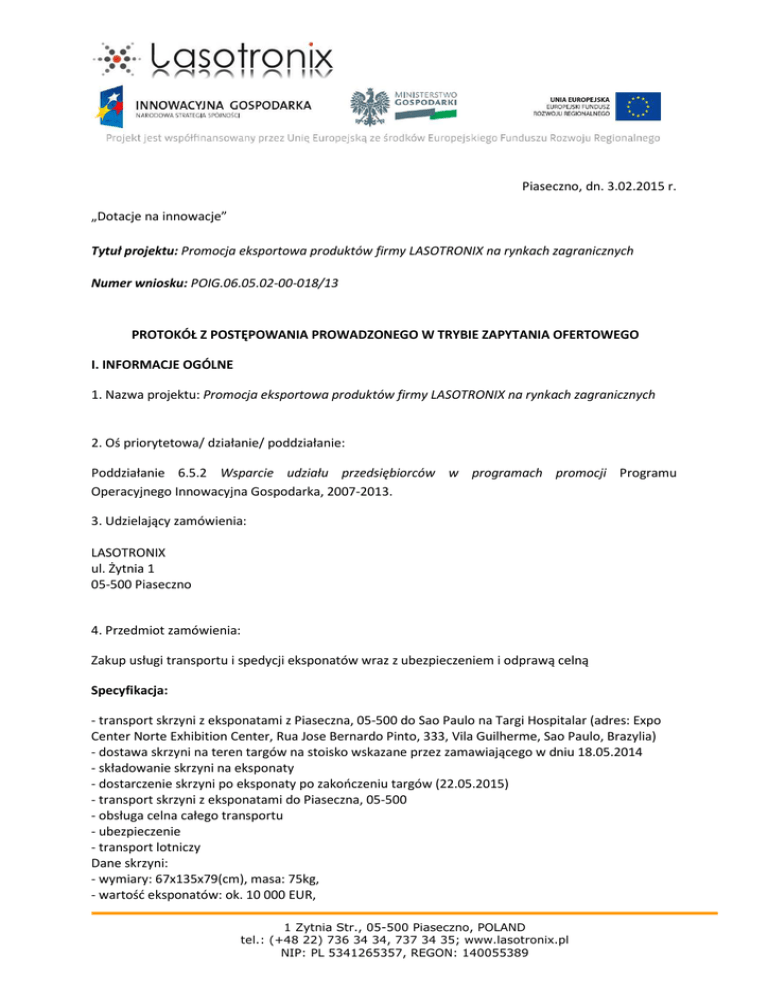 Piaseczno, dn. 3.02.2015 r. „Dotacje na innowacje” Tytuł projektu: Promocja eksportowa produktów firmy LASOTRONIX na rynkach zagranicznych Numer wniosku: POIG.06.05.02-00-018/13 PROTOKÓŁ Z POSTĘPOWANIA PROWADZONEGO W TRYBIE ZAPYTANIA OFERTOWEGO I. INFORMACJE OGÓLNE 1. Nazwa projektu: Promocja eksportowa produktów firmy LASOTRONIX na rynkach zagranicznych 2. Oś priorytetowa/ działanie/ poddziałanie: Poddziałanie 6.5.2 Wsparcie udziału przedsiębiorców w programach promocji Programu Operacyjnego Innowacyjna Gospodarka, 2007-2013. 3. Udzielający zamówienia: LASOTRONIX ul. Żytnia 1 05-500 Piaseczno 4. Przedmiot zamówienia: Zakup usługi transportu i spedycji eksponatów wraz z ubezpieczeniem i odprawą celną Specyfikacja: - transport skrzyni z eksponatami z Piaseczna, 05-500 do Sao Paulo na Targi Hospitalar (adres: Expo Center Norte Exhibition Center, Rua Jose Bernardo Pinto, 333, Vila Guilherme, Sao Paulo, Brazylia) - dostawa skrzyni na teren targów na stoisko wskazane przez zamawiającego w dniu 18.05.2014 - składowanie skrzyni na eksponaty - dostarczenie skrzyni po eksponaty po zakończeniu targów (22.05.2015) - transport skrzyni z eksponatami do Piaseczna, 05-500 - obsługa celna całego transportu - ubezpieczenie - transport lotniczy Dane skrzyni: - wymiary: 67x135x79(cm), masa: 75kg, - wartość eksponatów: ok. 10 000 EUR, 1 Zytnia Str., 05-500 Piaseczno, POLAND tel.: (+48 22) 736 34 34, 737 34 35; www.lasotronix.pl NIP: PL 5341265357, REGON: 140055389 Opis eksponatów: a) dwa lasery diodowe z akcesoriami, CN 85 4140 1000, wartość każdej sztuki to 4 500 EUR, b) jeden wózek do zawieszenia lasera, CN 83 0250 0000, wartość 1 000 EUR. II. ZAPYTANIE OFERTOWE 1. Termin składania ofert upływał dnia 23.02.2015 r., godz. 12.00 2. Zapytanie ofertowe zostało przesłane do wybranych oferentów, ponadto zostało zamieszczone na stronie internetowej www.lasotronix.pl oraz w siedzibie firmy : LASOTRONIX ul. Żytnia 1 05-500 Piaseczno 3. Odebrane odpowiedzi: Hansa Messe Speed Sp. z o.o. Ul. Marcelińska 92/94, lok 324 60-324 Poznań C.Hartwig Gdynia S.A. Ul. Derdowskiego 7 81-369 Gdynia Netlog Polska Sp. z o.o. Ul. Prądzyńskiego 12/14 01-222 Warszawa Przedsiębiorstwo Międzynarodowej Spedycji Targowej Transmeble International Ul. M. Konopnickiej 19/2 60-771 Poznań 4. Streszczenie metody oceny oferty: Wybrano ofertę Przedsiębiorstwo Międzynarodowej Spedycji Targowej Transmeble International. Spełnia ona wszystkie formalne oraz merytoryczne wymagania zamawiającego i uzyskała maksymalną liczbę punktów według kryteriów wyboru. 5. Postępowanie przeprowadził: Paula Koszutska Sp. ds. administracyjnych podpis osoby/ osób upoważnionych pieczątka firmowa 1 Zytnia Str., 05-500 Piaseczno, POLAND tel.: (+48 22) 736 34 34, 737 34 35; www.lasotronix.pl NIP: PL 5341265357, REGON: 140055389