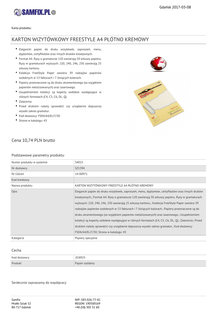 Gdańsk 2017-03-08 Karta produktu: KARTON WIZYTÓWKOWY FREESTYLE A4 PŁÓTNO KREMOWY Elegancki papier do druku wizytówek, zaproszeń, menu, dyplomów, certyfikatów oraz innych druków kreatywnych. Format A4. Ryzy o gramaturze 120 zawierają 50 arkuszy papieru. Ryzy w gramaturach wyższych: 220, 240, 246, 250 zawierają 25 arkuszy kartonu. Kolekcja FreeStyle Paper zawiera 39 rodzajów papierów ozdobnych w 13 fakturach i 7 lśniących kolorach. Papiery przeznaczone są do druku atramentowego (za wyjątkiem papierów metalizowanych) oraz laserowego. Uzupełnieniem kolekcji są koperty ozdobne występujące w różnych formatach (C4, C5, C6, DL, Q). Zalecenia: Przed drukiem należy sprawdzić czy urządzenie dopuszcza wysoki zakres gramatur. Kod dostawcy: FS04/A4/ELI7/30 Strona w katalogu: 43 Cena 10,74 PLN brutto Podstawowe parametry produktu Numer produktu w systemie 34015 Nr dostawcy SZ1394 Nr Celcen 14-00971 Kod kreskowy Nazwa produktu KARTON WIZYTÓWKOWY FREESTYLE A4 PŁÓTNO KREMOWY Opis Elegancki papier do druku wizytówek, zaproszeń, menu, dyplomów, certyfikatów oraz innych druków kreatywnych.; Format A4. Ryzy o gramaturze 120 zawierają 50 arkuszy papieru. Ryzy w gramaturach wyższych: 220, 240, 246, 250 zawierają 25 arkuszy kartonu.; Kolekcja FreeStyle Paper zawiera 39 rodzajów papierów ozdobnych w 13 fakturach i 7 lśniących kolorach.; Papiery przeznaczone są do druku atramentowego (za wyjątkiem papierów metalizowanych) oraz laserowego.; Uzupełnieniem kolekcji są koperty ozdobne występujące w różnych formatach (C4, C5, C6, DL, Q).; Zalecenia:; Przed drukiem należy sprawdzić czy urządzenie dopuszcza wysoki zakres gramatur.; Kod dostawcy: FS04/A4/ELI7/30; Strona w katalogu: 43 Kategoria Papiery specjalne Cecha Kod dostawcy .018925 Produkt Papier ozdobny Serdecznie zapraszamy do współpracy Samfix Miałki Szlak 52 80-717 Gdańsk NIP: 583-026-77-81 REGON: 190500169 +48 (58) 305 31 60 Gdańsk 2017-03-08 Zespół Samfix. Samfix Miałki Szlak 52 80-717 Gdańsk NIP: 583-026-77-81 REGON: 190500169 +48 (58) 305 31 60