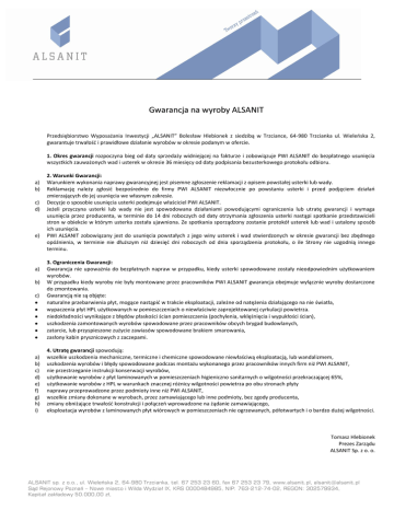 Przedsiębiorstwo Wyposażania Inwestycji „ALSANIT” Bolesław Hlebionek z siedzibą w Trzciance, 64-980 Trzcianka ul. Wieleńska 2, gwarantuje trwałość i prawidłowe działanie wyrobów w okresie podanym w ofercie. 1. Okres gwarancji rozpoczyna bieg od daty sprzedaży widniejącej na fakturze i zobowiązuje PWI ALSANIT do bezpłatnego usunięcia wszystkich zauważonych wad i usterek w okresie 36 miesięcy od daty podpisania bezusterkowego protokołu odbioru. a) b) c) d) e) a) b) c) a) b) c) d) e) f) g) h) i) 2. Warunki Gwarancji: Warunkiem wykonania naprawy gwarancyjnej jest pisemne zgłoszenie reklamacji z opisem powstałej usterki lub wady. Reklamację należy zgłosić bezpośrednio do firmy PWI ALSANIT niezwłocznie po powstaniu usterki i przed podjęciem działań zmierzających do jej usunięcia we własnym zakresie. Decyzje o sposobie usunięcia usterki podejmuje właściciel PWI ALSANIT. Jeżeli przyczyna usterki lub wady nie jest spowodowana działaniami powodującymi ograniczenia lub utratę gwarancji i wymaga usunięcia przez producenta, w terminie do 14 dni roboczych od daty otrzymania zgłoszenia usterki nastąpi spotkanie przedstawicieli stron w obiekcie w którym usterka została ujawniona. Ze spotkania sporządzony zostanie protokół usterek lub wad i ustalony sposób ich usunięcia. PWI ALSANIT zobowiązany jest do usunięcia powstałych z jego winy usterek i wad stwierdzonych w okresie gwarancji bez zbędnego opóźnienia, w terminie nie dłuższym niż dziesięć dni roboczych od dnia sporządzenia protokołu, o ile Strony nie uzgodnią innego terminu. 3. Ograniczenia Gwarancji: Gwarancja nie upoważnia do bezpłatnych napraw w przypadku, kiedy usterki spowodowane zostały nieodpowiednim użytkowaniem wyrobów. W przypadku kiedy wyroby nie były montowane przez pracowników PWI ALSANIT gwarancja obejmuje wyłącznie wyroby dostarczone do zmontowania. Gwarancją nie są objęte: naturalne przebarwienia płyt, mogące nastąpić w trakcie eksploatacji, zależne od natężenia działającego na nie światła, wypaczenia płyt HPL użytkowanych w pomieszczeniach o niewłaściwie zaprojektowanej cyrkulacji powietrza. niedokładności wynikające z błędów płaskości ścian pomieszczenia (pochylenia, wklęśnięcia i wypukłości ścian), uszkodzenia zamontowanych wyrobów spowodowane przez pracowników obcych brygad budowlanych, zatarcie, lub przyspieszone zużycie zawiasów spowodowane brakiem smarowania, zasłony kabin prysznicowych z zaczepami. 4. Utratę gwarancji spowodują: wszelkie uszkodzenia mechaniczne, termiczne i chemiczne spowodowane niewłaściwą eksploatacją, lub wandalizmem, uszkodzenia wyrobów i błędy spowodowane podczas montażu wykonanego przez pracowników innych firm niż PWI ALSANIT, nie przestrzeganie instrukcji konserwacji wyrobów, użytkowanie wyrobów z płyt laminowanych w pomieszczeniach higieniczno sanitarnych o wilgotności przekraczającej 65%, użytkowanie wyrobów z HPL w warunkach znacznej różnicy wilgotności powietrza po obu stronach płyty naprawy przeprowadzone przez podmioty inne niż PWI ALSANIT, wszelkie zmiany dokonane w wyrobach, przez zamawiającego lub inne podmioty, bez zgody producenta, zmiany obniżające trwałość konstrukcji i połączeń wprowadzone na żądanie zamawiającego, eksploatacja wyrobów z laminowanych płyt wiórowych w pomieszczeniach nie ogrzewanych, półotwartych i o bardzo dużej wilgotności. Tomasz Hlebionek Prezes Zarządu ALSANIT Sp. z o. o. ALSANIT sp. z o.o., ul. Wieleńska 2, 64-980 Trzcianka, tel. 67 253 23 60, fax 67 253 23 79, www.alsanit.pl, [email protected] Sąd Rejonowy Poznań – Nowe miasto i Wilda Wydział IX, KRS 0000484985, NIP: 763-212-74-02, REGON: 302579934, Kapitał zakładowy 50.000,00 zł,