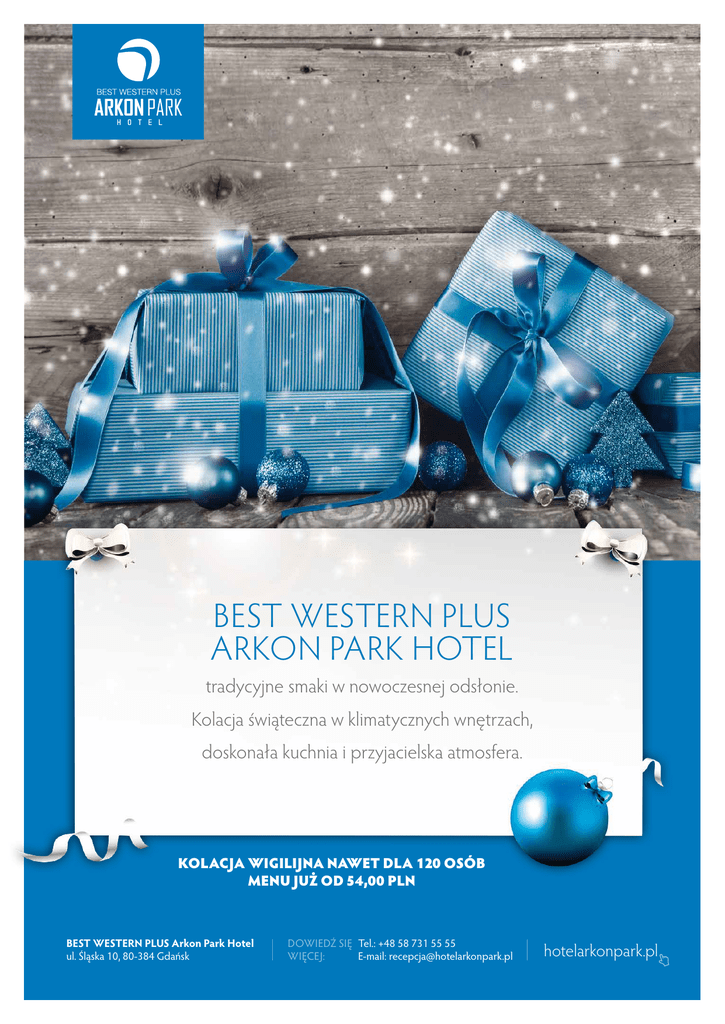 BEST WESTERN PLUS ARKON PARK HOTEL tradycyjne smaki w nowoczesnej odsłonie. Kolacja świąteczna w klimatycznych wnętrzach, doskonała kuchnia i przyjacielska atmosfera. KOLACJA WIGILIJNA NAWET DLA 120 OSÓB MENU JUŻ OD 54,00 PLN BEST WESTERN PLUS Arkon Park Hotel ul. Śląska 10, 80-384 Gdańsk DOWIEDŹ SIĘ Tel.: +48 58 731 55 55 WIĘCEJ: E-mail: [email protected] hotelarkonpark.pl PROPOZYCJE MENU SERWOWANEGO PROPOZYCJA I - 54 PLN/os Przystawka: Pierożki z kapustą i grzybami oprószone cebulą Zupa: Krem z grzybów z łazankami Danie główne: Dorsz w migdałach na risotto szpinakowym z sosem maślano cytrynowym Deser: Strudel jabłkowy z sosem waniliowym PROPOZYCJA II - 59 PLN/os Przystawka: Strudel z łososia z jajem przepiórczym w towarzystwie musu chrzanowego Zupa: Barszcz czerwony z pasztecikiem Danie główne: Karp w panierce piernikowej na kapuście czerwonej z wędzoną śliwką i puree z dyni Deser: Torcik kajmakowy z konfiturą jagodową i suszonymi owocami PROPOZYCJE MENU BUFETOWEGO PROPOZYCJA I - 76 PLN/os Bufet ciepły: Barszcz z uszkami Karp w sosie piernikowym Dorsz pieczony z masłem i koperkiem Pierogi z kapustą i grzybami Ziemniaki pieczone z majerankiem Bufet zimny: Śledzik po staropolsku Sałatka jarzynowa Kutia Krokiety z kapustą wigilijną Ryby wędzone podane z chrzanem Kompot z suszu owocowego Pieczone jabłka z miodem i żurawiną Pieczywo mieszane Masło Sosy Kawa, herbata, woda mineralna, soki Bufet słodki: Piernik Placek z jabłkami Makowiec PROPOZYCJA II - 79 PLN/os Bufet ciepły: Krem borowikowy z łazankami Karp w sosie cytrynowo-koperkowym Łosoś w sosie winno-maślanym z kaparami Pierogi ruskie okraszane cebulką Kapusta z grzybami Ziemniaki pieczone Kluski gotowane Bufet zimny: Ryba po grecku Kulebiak z kapustą i grzybami Pstrąg w galarecie Sałatka śledziowa Sałatka jarzynowa Kutia Kompot z suszu owocowego Pieczywo mieszane Masło Sosy Kawa, herbata, woda mineralna, soki Bufet słodki: Piernik Sernik Strudel z jabłkami