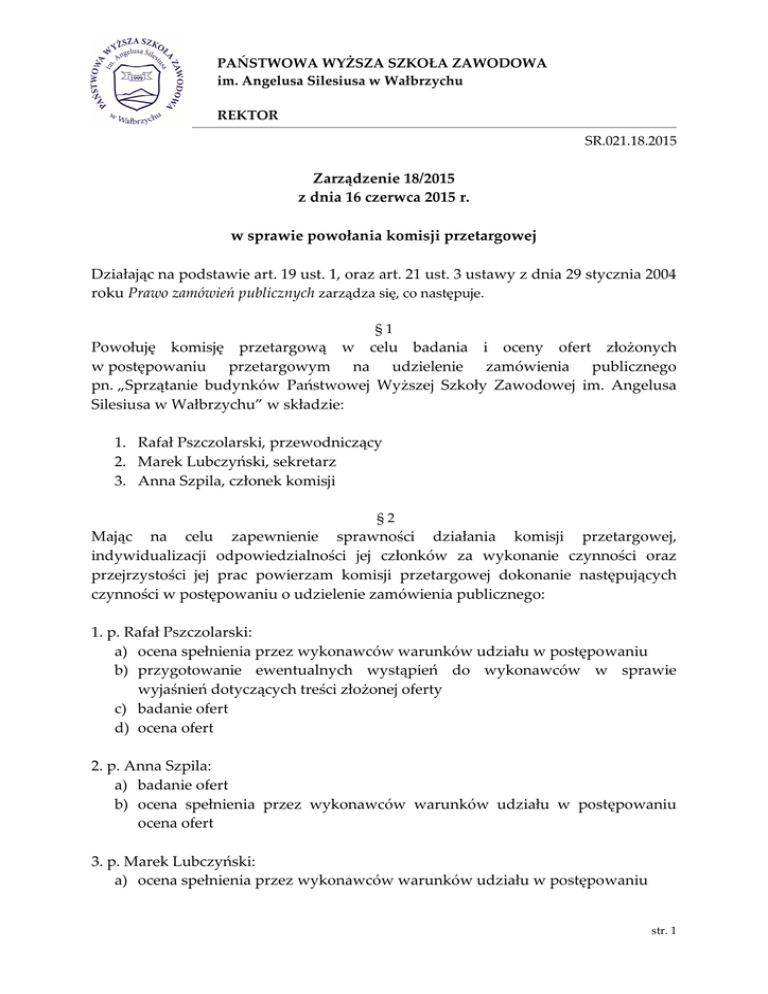 [Wpisz cytat z PAŃSTWOWA WYŻSZA SZKOŁA ZAWODOWA im. Angelusa Silesiusa w Wałbrzychu REKTOR SR.021.18.2015 Zarządzenie 18/2015 z dnia 16 czerwca 2015 r. w sprawie powołania komisji przetargowej Działając na podstawie art. 19 ust. 1, oraz art. 21 ust. 3 ustawy z dnia 29 stycznia 2004 roku Prawo zamówień publicznych zarządza się, co następuje. §1 Powołuję komisję przetargową w celu badania i oceny ofert złożonych w postępowaniu przetargowym na udzielenie zamówienia publicznego pn. „Sprzątanie budynków Państwowej Wyższej Szkoły Zawodowej im. Angelusa Silesiusa w Wałbrzychu” w składzie: 1. Rafał Pszczolarski, przewodniczący 2. Marek Lubczyński, sekretarz 3. Anna Szpila, członek komisji §2 Mając na celu zapewnienie sprawności działania komisji przetargowej, indywidualizacji odpowiedzialności jej członków za wykonanie czynności oraz przejrzystości jej prac powierzam komisji przetargowej dokonanie następujących czynności w postępowaniu o udzielenie zamówienia publicznego: 1. p. Rafał Pszczolarski: a) ocena spełnienia przez wykonawców warunków udziału w postępowaniu b) przygotowanie ewentualnych wystąpień do wykonawców w sprawie wyjaśnień dotyczących treści złożonej oferty c) badanie ofert d) ocena ofert 2. p. Anna Szpila: a) badanie ofert b) ocena spełnienia przez wykonawców warunków udziału w postępowaniu ocena ofert 3. p. Marek Lubczyński: a) ocena spełnienia przez wykonawców warunków udziału w postępowaniu str. 1 b) przygotowanie odpowiedzi na zapytania wykonawców dotyczące treści specyfikacji istotnych warunków zamówienia c) badanie ofert d) ocena ofert e) prowadzenie protokołu postępowania §3 W sprawach nieuregulowanych w zarządzeniu mają zastosowanie przepisy ustawy Prawo zamówień publicznych oraz Regulaminu udzielania zamówień publicznych w PWSZ AS. §4 Zarządzenie wchodzi w życie z dniem podpisania. REKTOR prof. zw. dr hab. Elżbieta Lonc str. 2