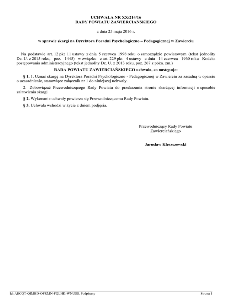 UCHWAŁA NR XX/214/16 RADY POWIATU ZAWIERCIAŃSKIEGO z dnia 25 maja 2016 r. w sprawie skargi na Dyrektora Poradni Psychologiczno – Pedagogicznej w Zawierciu Na podstawie art. 12 pkt 11 ustawy z dnia 5 czerwca 1998 roku o samorządzie powiatowym (tekst jednolity Dz. U. z 2015 roku, poz. 1445) w związku z art. 229 pkt 4 ustawy z dnia 14 czerwca 1960 roku Kodeks postępowania administracyjnego (tekst jednolity Dz. U. z 2013 roku, poz. 267 z późn. zm.) RADA POWIATU ZAWIERCIAŃSKIEGO uchwala, co następuje: § 1. 1. Uznać skargę na Dyrektora Poradni Psychologiczno - Pedagogicznej w Zawierciu za zasadną w oparciu o uzasadnienie, stanowiące załącznik nr 1 do niniejszej uchwały. 2. Zobowiązać Przewodniczącego Rady Powiatu do przekazania stronie skarżącej informacji o sposobie załatwienia skargi. § 2. Wykonanie uchwały powierza się Przewodniczącemu Rady Powiatu. § 3. Uchwała wchodzi w życie z dniem podjęcia. Przewodniczący Rady Powiatu Zawierciańskiego Jarosław Kleszczewski Id: AECQT-QIMBD-OFRMN-FQLHK-WNUSS. Podpisany Strona 1 Załącznik nr 1 do Uchwały Nr XX / 214 / 16 Rady Powiatu Zawierciańskiego z dnia 25 maja 2016 roku. UZASADNIENIE W dniu 7 kwietnia 2016 roku do Przewodniczącego Rady Powiatu Zawierciańskiego wpłynęło pismo z Kuratorium Oświaty w Katowicach, którym przekazano do rozpoznania skargę A.S.A. na bezprawne działania Dyrektora Poradni Psychologiczno – Pedagogicznej w Zawierciu. Skarga dotyczyła bezprawnych działań Dyrektora Poradni Psychologiczno – Pedagogicznej w Zawierciu podejmowanych w stosunku do jednego z pracowników Poradni, polegających na tym – jak wskazuje skarżąca – że w dniu 24.03.2016 roku o godz.11.00 odbyła się pierwsza sprawa w Sądzie Rejonowym w Zawierciu o zadośćuczynienie z tytułu uszkodzenia ciała lub uszczerbku na zdrowiu przeciwko Towarzystwu Ubezpieczeniowemu w skutek wypadku któremu uległa skarżąca w drodze do pracy. Dyrektor została poinformowana przez pracownika o rozprawie w lutym 2016 roku. Dyrektor nie wyraziła zgody na wpisanie wyjścia na rozprawę do księgi wyjść, twierdząc< że pracownik w związku z koniecznością stawiennictwa w Sądzie, powinien mieć w tym dniu urlop, ponieważ jest to jego prywatna sprawa. Dyrektor nie wskazała pracownikowi, co powinien zrobić będąc już w pracy – czy w jaki sposób pracownik powinien usprawiedliwić swoją nieobecność. Wpis dotyczący rozprawy widniał w terminarzu pracy od lutego. W dniu 24.03.2016 roku od godz. 8.00 skarżąca była obecna w pracy. O wyjściu do Sądu pracownik informował pracodawcę ustnie. Pracownik przekazał pracodawcy z wyprzedzeniem informacje o przyczynie i przewidywanym okresie nieobecności w pracy. W Poradni funkcjonuje księga wyjść, nie funkcjonują natomiast odrębnie księga wyjść prywatnych i służbowych, zatem nie wyrażenie zgody na wpisanie wyjścia na rozprawę, o którym pracodawca został poinformowany w uwagi na fakt, iż pracodawca traktował wyżej wskazane wyjście jako prywatne, należy uznać za działanie bezpodstawne. Sąd Rejonowy w Zawierciu zobowiązał pracodawcę do przesłania dokumentacji lekarskiej dotyczącej urlopu dla poratowania zdrowia oraz informacji o sumie wypłaconych świadczeń w okresie urlopu dotyczących skarżącej. Dyrektor Poradni bezpodstawnie przedłożyła do Sądu również inne dokumenty, o których przekazanie Sąd się nie zwracał odnoszące się do prywatnych spraw skarżącej, dotyczące kampanii wyborczej do Rady Miasta Ogrodzieniec, udziału w komisji w wyborach prezydenckich, potwierdzenie wpisu na listę biegłych sądowych oraz prywatne rodzinne zdjęcie ściągnięte z Internetu. Dyrektor Poradni informowała pracowników Poradni o zeznaniach składanych przez skarżącą w toczącej się sprawie w Sądzie Okręgowym w Częstochowie dotyczącej odwołania jej z urlopu dla poratowania zdrowia. Sąd Okręgowy w Częstochowie, oceniając materiał dowodowy zgromadzony w sprawie, w tym zeznania skarżącej, ocenił je jako wiarygodne i prawomocnym Wyrokiem Sądu Okręgowego w Częstochowie IV Wydział Pracy i Ubezpieczeń Społecznych z dnia 11 lutego 2016 roku, o sygnaturze akt: IV Pa 158/15, orzekł, że oświadczenie pozwanej Poradni Psychologiczno – Pedagogicznej w Zawierciu w przedmiocie odwołania powódki A.S.A. z urlopu dla poratowania zdrowia, udzielonego w dniu 12 marca 2015 roku, było bezskuteczne, nakazał pobrać od pozwanej Poradni Psychologiczno – Pedagogicznej w Zawierciu na rzecz Skarbu Państwa kwotę 1732 zł tytułem opłaty od pozwu, od uiszczenia której powódka była zwolniona, zasądził od pozwanej Poradni Psychologiczno – Pedagogicznej w Zawierciu na rzecz powódki A.S.A. kwotę 60 zł tytułem zwrotu kosztów zastępstwa procesowego przed sądem pierwszej instancji oraz kwotę 90 zł tytułem zwrotu kosztów procesu przed sądem drugiej instancji. Należy podkreślić, że do nieporozumień między pracownikiem a pracodawcą, stanowiących istotę skargi, to jest odmowy udzielenia zgody na wpisanie wyjścia na rozprawę, o którym pracodawca został poinformowany ,do księgi wyjść oraz przesłania do sądu dokumentów, o których przekazanie sąd się nie zwracał, odnoszących się do prywatnych spraw skarżącej, nie doszło by, gdyby nie nastąpiło bezprawne odwołanie przez pracodawcę pracownika z urlopu dla poratowania zdrowia. Wypada także wskazać, że w toku postępowania przed Komisja Rewizyjną Dyrektor Poradni Psychologiczno – Pedagogicznej w Zawierciu ujawniała bezpodstawnie dane osobowe skarżącej. Mając na uwadze całokształt powyższych okoliczności, skargę A.S.A. na bezprawne działania Dyrektora Poradni Psychologiczno – Pedagogicznej w Zawierciu należy uznać za zasadną, a działania Dyrektora Poradni Psychologiczno – Pedagogicznej w Zawierciu ocenić jako przekroczenie praw i obowiązków pracodawcy. Id: AECQT-QIMBD-OFRMN-FQLHK-WNUSS. Podpisany Strona 1