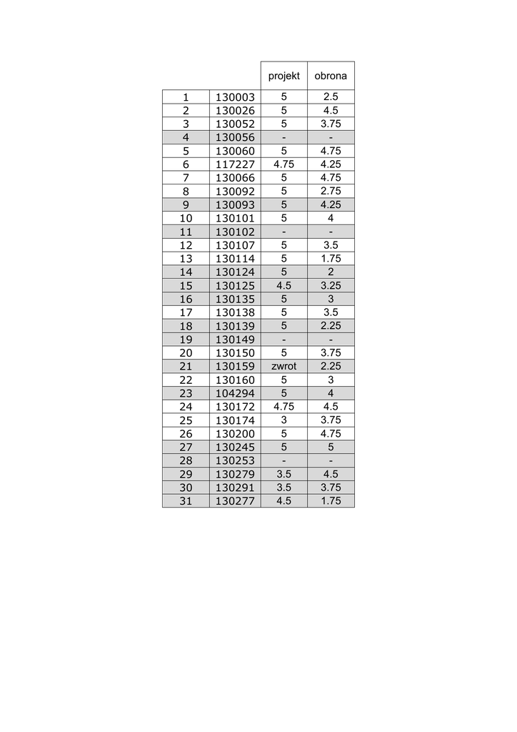 projekt obrona 1 130003 5 2.5 2 130026 5 4.5 3 130052 5 3.75 4