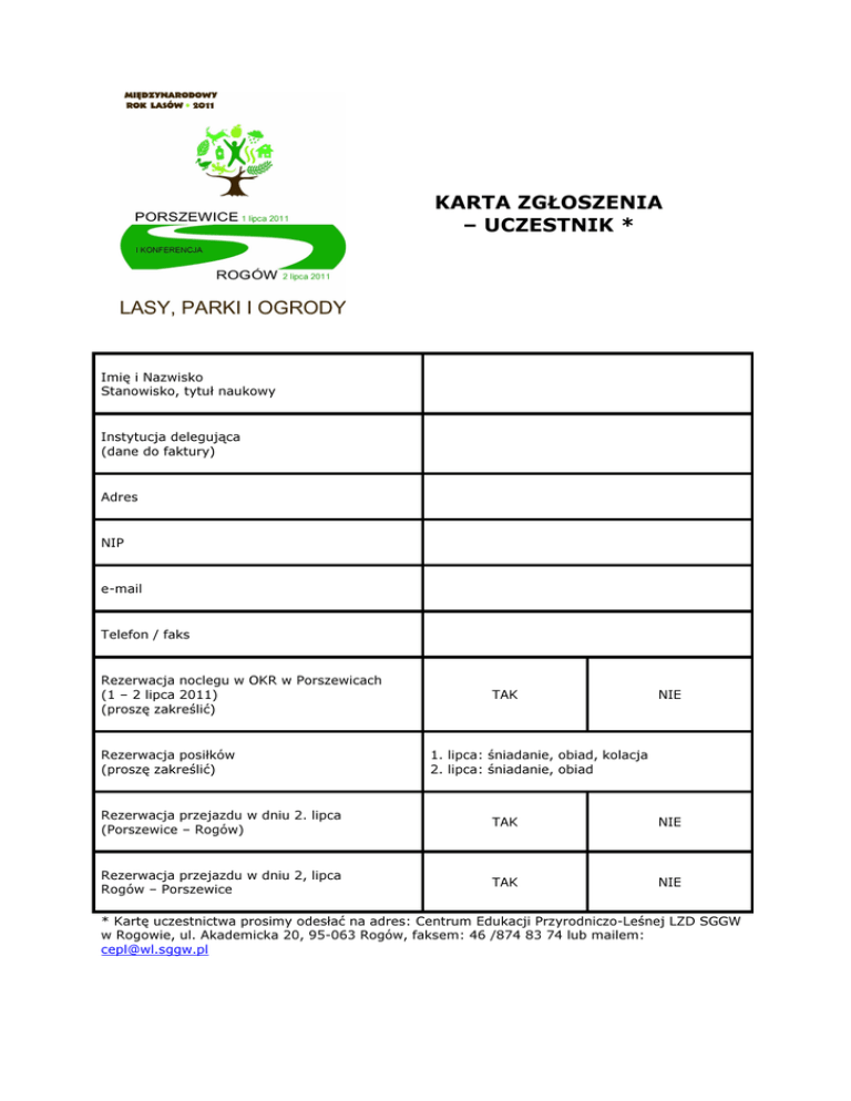 KARTA ZGŁOSZENIA – UCZESTNIK * Imię i Nazwisko Stanowisko, tytuł naukowy Instytucja delegująca (dane do faktury) Adres NIP e-mail Telefon / faks Rezerwacja noclegu w OKR w Porszewicach (1 – 2 lipca 2011) (proszę zakreślić) Rezerwacja posiłków (proszę zakreślić) TAK NIE 1. lipca: śniadanie, obiad, kolacja 2. lipca: śniadanie, obiad Rezerwacja przejazdu w dniu 2. lipca (Porszewice – Rogów) TAK NIE Rezerwacja przejazdu w dniu 2, lipca Rogów – Porszewice TAK NIE * Kartę uczestnictwa prosimy odesłać na adres: Centrum Edukacji Przyrodniczo-Leśnej LZD SGGW w Rogowie, ul. Akademicka 20, 95-063 Rogów, faksem: 46 /874 83 74 lub mailem: [email protected]