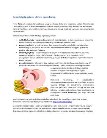 Cennik kolportażu ulotek oraz druku Firma Rekolnet świadczy kompleksowe usługi w zakresie druku oraz kolportażu ulotek. Klienci bardzo często proszą nas o przedstawienie cennika świadczonych przez nas usług. Niestety nie jesteśmy w stanie przygotować uniwersalnej oferty, ponieważ cena obsługi zależy od wymagań stawianych przez zleceniodawcę. Na koszt kolportażu ulotek składają się między innymi: nakład kolportażu - w przypadku większych zleceń jesteśmy w stanie zaoferować atrakcyjne rabaty. Niestety zniżki nie są możliwe przy zamówieniach detalicznych. parametry ulotek - w skali hurtowej duże znaczenie ma format ulotki. Im większy, tym kosztowniejszy jest proces drukowania. Prosimy również zwrócić uwagę na gramaturę papieru jaką wybierają Państwo. obszar dystrybucji - nasza firma posiada zespół doświadczonych kolporterów, a swoim zasięgiem potrafimy objąć całe Trójmiasto. Bardzo prosimy przy kontakcie podać szczegółowo obszar, jaki Państwa interesuje. Każda dodatkowa dzielnica wpływa bowiem na koszty zlecenia. priorytet zlecenia - oferujemy dwa podstawowe tryby: standardowy oraz ekspresowy. W przypadku kolportażu standardowego korzystamy z najwcześniejszego wolnego terminu naszych dystrybutorów. Za dodatkową dopłatą możemy przeprowadzić kolportaż w trybie ekspresowym, mobilizując do pracy zapasowe zasoby ludzkie. Doskonale rozumiemy, że przedsiębiorcy zainteresowani reklamą chcą jak najszybciej otrzymać wycenę. Dlatego też zatrudniamy konsultantów, którzy w godzinach roboczych czekają na wszystkie telefony i wiadomości mailowe. Czas oczekiwania na szczegółowy cennik kolportażu jest więc możliwie najkrótszy. Jeżeli interesuje cię obliczenie kosztów kolportażu ulotek dla twojej firmy, skorzystaj proszę z formularza kontaktowego dostępnego na stronie: http://www.rekolnet.pl Możesz również odwiedzić nasze biuro i porozmawiać o planowanej kampanii reklamowej. Służymy fachowym doradztwem i pomocą w wyborze jak najbardziej efektywnej strategii marketingowej. Chętnie podzielimy się swoim wieloletnim doświadczeniem w branży, aby pomóc osiągnąć ci sukces.