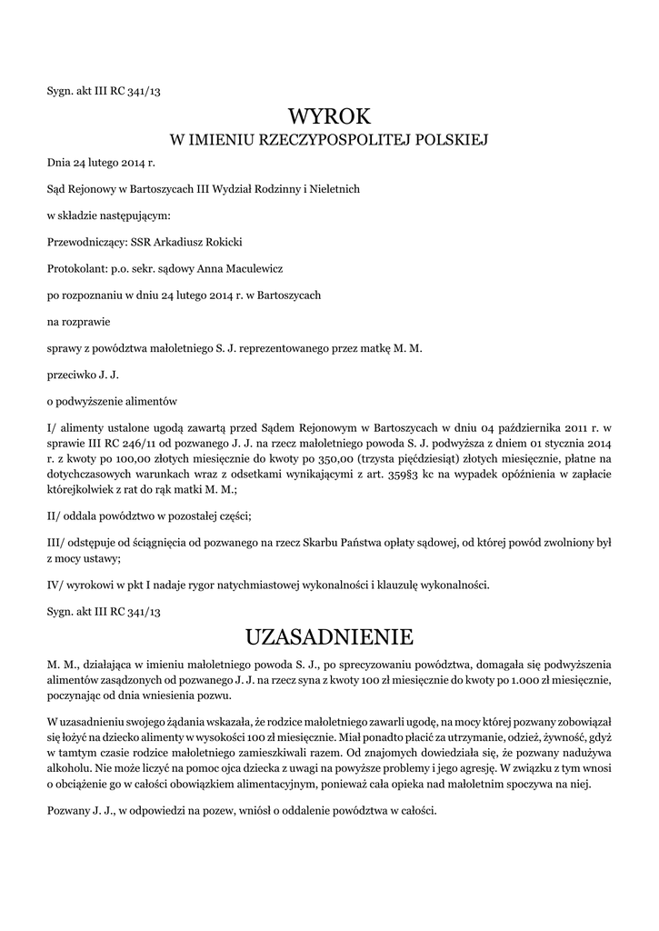 Sygn. akt III RC 341/13 WYROK W IMIENIU RZECZYPOSPOLITEJ POLSKIEJ Dnia 24 lutego 2014 r. Sąd Rejonowy w Bartoszycach III Wydział Rodzinny i Nieletnich w składzie następującym: Przewodniczący: SSR Arkadiusz Rokicki Protokolant: p.o. sekr. sądowy Anna Maculewicz po rozpoznaniu w dniu 24 lutego 2014 r. w Bartoszycach na rozprawie sprawy z powództwa małoletniego S. J. reprezentowanego przez matkę M. M. przeciwko J. J. o podwyższenie alimentów I/ alimenty ustalone ugodą zawartą przed Sądem Rejonowym w Bartoszycach w dniu 04 października 2011 r. w sprawie III RC 246/11 od pozwanego J. J. na rzecz małoletniego powoda S. J. podwyższa z dniem 01 stycznia 2014 r. z kwoty po 100,00 złotych miesięcznie do kwoty po 350,00 (trzysta pięćdziesiąt) złotych miesięcznie, płatne na dotychczasowych warunkach wraz z odsetkami wynikającymi z art. 359§3 kc na wypadek opóźnienia w zapłacie którejkolwiek z rat do rąk matki M. M.; II/ oddala powództwo w pozostałej części; III/ odstępuje od ściągnięcia od pozwanego na rzecz Skarbu Państwa opłaty sądowej, od której powód zwolniony był z mocy ustawy; IV/ wyrokowi w pkt I nadaje rygor natychmiastowej wykonalności i klauzulę wykonalności. Sygn. akt III RC 341/13 UZASADNIENIE M. M., działająca w imieniu małoletniego powoda S. J., po sprecyzowaniu powództwa, domagała się podwyższenia alimentów zasądzonych od pozwanego J. J. na rzecz syna z kwoty 100 zł miesięcznie do kwoty po 1.000 zł miesięcznie, poczynając od dnia wniesienia pozwu. W uzasadnieniu swojego żądania wskazała, że rodzice małoletniego zawarli ugodę, na mocy której pozwany zobowiązał się łożyć na dziecko alimenty w wysokości 100 zł miesięcznie. Miał ponadto płacić za utrzymanie, odzież, żywność, gdyż w tamtym czasie rodzice małoletniego zamieszkiwali razem. Od znajomych dowiedziała się, że pozwany nadużywa alkoholu. Nie może liczyć na pomoc ojca dziecka z uwagi na powyższe problemy i jego agresję. W związku z tym wnosi o obciążenie go w całości obowiązkiem alimentacyjnym, ponieważ cała opieka nad małoletnim spoczywa na niej. Pozwany J. J., w odpowiedzi na pozew, wniósł o oddalenie powództwa w całości. W uzasadnieniu swojego stanowiska wskazał, że terminowo płaci zasądzone alimenty. Ponadto kontynuuje jeszcze naukę, a jego jedynym źródłem utrzymania jest renta rodzinna. Zamieszkuje wraz z chorą matką, a w jego miejscu zamieszkania trudno jest znaleźć pracę zarówno stałą jak i dorywczą. Podał także, że nie nadużywa alkoholu, ani nie jest agresywny. W jego ocenie, to matka dziecka utrudnia mu kontakty. Sąd ustalił, co następuje: Małoletni S. J., urodzony (...) w B., jest synem M. M. i pozwanego J. J.. (dowód: odpis skrócony aktu urodzenia k. 3) Na mocy ugody zawartej przed Sądem Rejonowym w Bartoszycach w dniu 04 października 2011r., w sprawie III RC 246/11, alimenty należne małoletniemu powodowi ustalone zostały na kwotę po 100 zł miesięcznie. (dowód: ugoda z dnia 04 października 2011r. k. 8v. akt III RC 246/11) W czasie ustalania alimentów w dotychczasowej wysokości małoletni powód miał ponad miesiąc. Był zdrowy i rozwijał się prawidłowo. Pozwany był uczniem I klasy szkoły policealnej na kierunku agrobiznes. Zamieszkiwał z matką i częściowo pozostawał na jej utrzymaniu. Dorywczo nie pracował i pobierał rentę rodzinną po zmarłym ojcu w wysokości 630 zł miesięcznie. Matka dziecka w tamtym czasie studiowała na Uniwersytecie (...) na kierunku ochrona środowiska. Były to studia niestacjonarne, za które płaciła 1.700 zł za semestr. Utrzymywała się z alimentów płaconych przez ojca w wysokości 400 zł miesięcznie. (dowód: przesłuchanie informacyjne stron k. 8 – 8v. akt III RC 246/11) Aktualnie małoletni powód ma 2,5 roku. Pozostaje pod opieką (...) w O.. Wizyty w poradni przypadają raz na cztery miesiące. Pomiędzy tymi wizytami dziecko jest rehabilitowane w domu. M. M. jeździ także z synem na basen do O.. (dowód z przesłuchania przedstawicielki ustawowej małoletniego powoda k. 17 – 18) Pozwany J. J. nadal uczy się w R. i kończy technikum. Wcześniej ukończył zaocznie liceum ogólnokształcące. Utrzymuje się z renty rodzinnej w wysokości 770 zł miesięcznie. Jeżeli znajdzie zatrudnienie, to zatrudnia się przy pracach dorywczych na budowach lub w ogrodnictwie. Dwa lata temu zatrudniony był w ramach umowy o dzieło i zarabiał około 2.000 zł miesięcznie. Jest zdrowy i nie ma przeciwwskazań do wykonywania przez niego pracy zarobkowej. Zamieszkuje wraz z matką, która utrzymuje się z renty w wysokości 700 zł miesięcznie. Wspólnie ponoszą opłaty za: energię elektryczną w wysokości 160 zł miesięcznie, wodę – 50 zł miesięcznie, telewizję – 40 zł miesięcznie, Internet z telefonem – 170 zł miesięcznie (w tym 40 zł abonament za telefon matki małoletniego powoda). Pozwany ponosi powyższe koszty w połowie. Nie ma innych osób na utrzymaniu. (dowód: kserokopia decyzji Prezesa KRUS k. 16 – 16v., dowód z przesłuchania pozwanego k. 17v. - 18) Małoletni powód S. J. zamieszkuje wraz z matką M. M., która pracuje jako agent ubezpieczeniowy w (...) S.A. Prowadzi działalność gospodarczą, a jej dochody uzależnione są od ilości zawartych umów ubezpieczenia. W lutym 2014r. uzyskała z tego tytułu przychód w wysokości 4.951 zł, w styczniu 2014r. – 2.367 zł, zaś w grudniu 2013r. – 3.176 zł. Z tych przychodów musi opłacić podatek dochodowy, świadczenia z tytułu ubezpieczenia społecznego, koszty dojazdu do klientów. Nie posiada innych dochodów i nie korzysta z pomocy opieki społecznej. W czasie gdy matka pracuje, małoletni powód pozostaje pod opieką babci bądź opiekunki, z którą M. M. rozlicza się na godziny. Nadal jest studentką (...) w O. na kierunku ochrona środowiska. Aktualnie studiuje na 3 roku, a za studia płaci czesne w wysokości 1.700 zł za seme