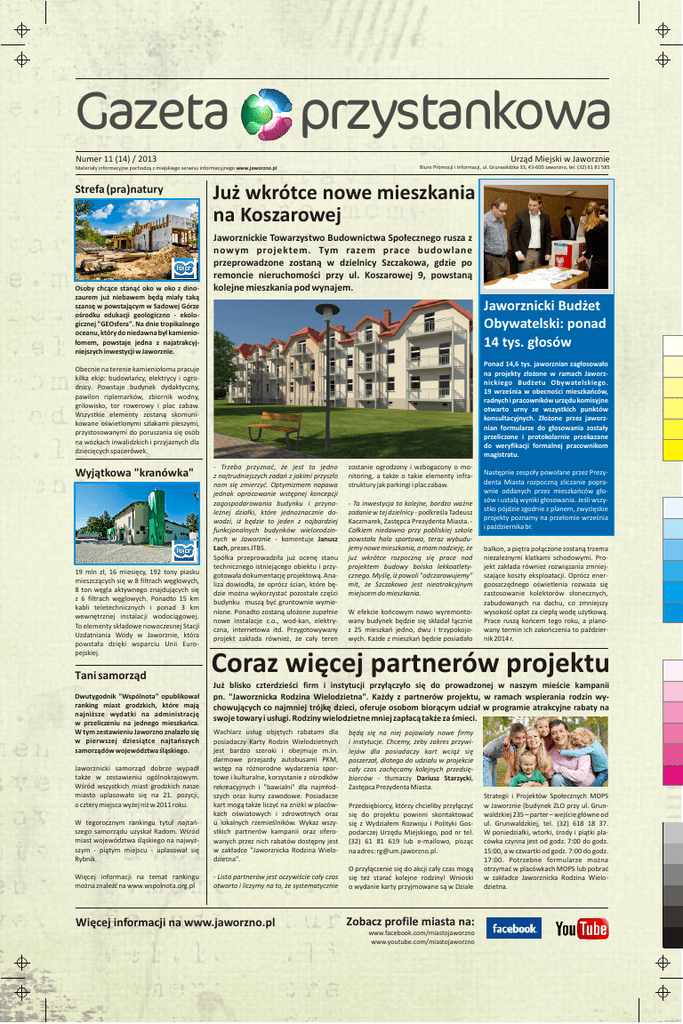 Gazeta przystankowa Urząd Miejski w Jaworznie Numer 11 (14) / 2013 Materiały informacyjne pochodzą z miejskiego serwisu informacyjnego www.jaworzno.pl Strefa (pra)natury Osoby chcące stanąć oko w oko z dinozaurem już niebawem będą miały taką szansę w powstającym w Sadowej Górze ośrodku edukacji geologiczno - ekologicznej "GEOsfera". Na dnie tropikalnego oceanu, który do niedawna był kamieniołomem, powstaje jedna z najatrakcyjniejszych inwestycji w Jaworznie. Biuro Promocji i Informacji, ul. Grunwaldzka 33, 43-600 Jaworzno, tel. (32) 61 81 585 Już wkrótce nowe mieszkania na Koszarowej Jaworznickie Towarzystwo Budownictwa Społecznego rusza z nowym projektem. Tym razem prace budowlane przeprowadzone zostaną w dzielnicy Szczakowa, gdzie po remoncie nieruchomości przy ul. Koszarowej 9, powstaną kolejne mieszkania pod wynajem. Jaworznicki Budżet Obywatelski: ponad 14 tys. głosów Ponad 14,6 tys. jaworznian zagłosowało na projekty złożone w ramach Jaworznickiego Budżetu Obywatelskiego. 19 września w obecności mieszkańców, radnych i pracowników urzędu komisyjne otwarto urny ze wszystkich punktów konsultacyjnych. Złożone przez jaworznian formularze do głosowania zostały przeliczone i protokolarnie przekazane do weryfikacji formalnej pracownikom magistratu. Obecnie na terenie kamieniołomu pracuje kilka ekip: budowlańcy, elektrycy i ogrodnicy. Powstaje budynek dydaktyczny, pawilon riplemarków, zbiornik wodny, grilowisko, tor rowerowy i plac zabaw. Wszystkie elementy zostaną skomunikowane oświetlonymi szlakami pieszymi, przystosowanymi do poruszania się osób na wózkach inwalidzkich i przyjaznych dla dziecięcych spacerówek. Wyjątkowa "kranówka" 19 mln zł, 16 miesięcy, 192 tony piasku mieszczących się w 8 filtrach węglowych, 8 ton węgla aktywnego znajdujących się z 6 filtrach węglowych. Ponadto 15 km kabli teletechnicznych i ponad 3 km wewnętrznej instalacji wodociągowej. To elementy składowe nowoczesnej Stacji Uzdatniania Wody w Jaworznie, która powstała dzięki wsparciu Unii Europejskiej. Tani samorząd Dwutygodnik "Wspólnota" opublikował ranking miast grodzkich, które mają najniższe wydatki na administrację w przeliczeniu na jednego mieszkańca. W tym zestawieniu Jaworzno znalazło się w pierwszej dziesiątce najtańszych samorządów województwa śląskiego. - Trzeba przyznać, że jest to jedno z najtrudniejszych zadań z jakimi przyszło nam się zmierzyć. Optymizmem napawa jednak opracowanie wstępnej koncepcji zagospodarowania budynku i przynależnej działki, które jednoznacznie dowodzi, iż będzie to jeden z najbardziej funkcjonalnych budynków wielorodzinnych w Jaworznie - komentuje Janusz Łach, prezes JTBS. Spółka przeprowadziła już ocenę stanu technicznego istniejącego obiektu i przygotowała dokumentację projektową. Analiza dowiodła, że oprócz ścian, które będzie można wykorzystać pozostałe części budynku muszą być gruntownie wymienione. Ponadto zostaną ułożone zupełnie nowe instalacje c.o., wod-kan, elektryczna, internetowa itd. Przygotowywany projekt zakłada również, że cały teren - Ta inwestycja to kolejne, bardzo ważne zadanie w tej dzielnicy - podkreśla Tadeusz Kaczmarek, Zastępca Prezydenta Miasta. Całkiem niedawno przy pobliskiej szkole powstała hala sportowa, teraz wybudujemy nowe mieszkania, a mam nadzieję, że już wkrótce rozpoczną się prace nad projektem budowy boiska lekkoatletycznego. Myślę, iż powoli "odczarowujemy" mit, że Szczakowa jest nieatrakcyjnym miejscem do mieszkania. W efekcie końcowym nowo wyremontowany budynek będzie się składał łącznie z 25 mieszkań jedno, dwu i trzypokojowych. Każde z mieszkań będzie posiadało Następnie zespoły powołane przez Prezydenta Miasta rozpoczną zliczanie poprawnie oddanych przez mieszkańców głosów i ustalą wyniki głosowania. Jeśli wszystko pójdzie zgodnie z planem, zwycięskie projekty poznamy na przełomie września i października br. balkon, a piętra połączone zostaną trzema niezależnymi klatkami schodowymi. Projekt zakłada również rozwiązania zmniejszające koszty eksploatacji. Oprócz energooszczędnego oświetlenia rozważa się zastosowanie kolektorów słonecznych, zabudowanych na dachu, co zmniejszy wysokość opłat za ciepłą wodę użytkową. Prace ruszą końcem tego roku, a planowany termin ich zakończenia to październik 2014 r. Coraz więcej partnerów projektu Już blisko czterdzieści firm i instytucji przyłączyło się do prowadzonej w naszym mieście kampanii pn. "Jaworznicka Rodzina Wielodzietna". Każdy z partnerów projektu, w ramach wspierania rodzin wychowujących co najmniej trójkę dzieci, oferuje osobom biorącym udział w programie atrakcyjne rabaty na swoje towary i usługi. Rodziny wielodzietne mniej zapłacą także za śmieci. W tegorocznym rankingu tytuł najtańszego samorządu uzyskał Radom. Wśród miast województwa śląskiego na najwyższym - piątym miejscu - uplasował się Rybnik. Wachlarz usług objętych rabatami dla posiadaczy Karty Rodzin Wielodzietnych jest bardzo szeroki i obejmuje m.in. darmowe przejazdy autobusami PKM, wstęp na różnorodne wydarzenia sportowe i kulturalne, korzystanie z ośrodków rekreacyjnych i "bawialni" dla najmłodszych oraz kursy zawodowe. Posiadacze kart mogą także liczyć na zniżki w placówkach oświatowych i zdrowotnych oraz u lokalnych rzemieślników. Wykaz wszystkich partnerów kampanii oraz oferowanych przez nich rabatów dostępny jest w zakładce "Jaworznicka Rodzina Wielodzietna". Więcej informacji na temat rankingu można znaleźć na www.wspolnota.org.pl - Lista partnerów jest oczywiście cały czas otwarta i liczymy na to, że systematycznie Jaworznicki samorząd dobrze wypadł także w zestawieniu ogólnokrajowym. Wśród wszystkich miast grodzkich nasze miasto uplasowało się na 21. pozycji, o cztery miejsca wyżej niż w 2011 roku. zostanie ogrodzony i wzbogacony o monitoring, 