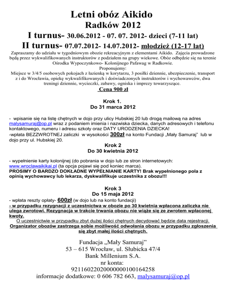 Letni obóz Aikido Radków 2012 I turnus- 30.06.2012 - 07. 07. 2012- dzieci (7-11 lat) II turnus- 07.07.2012- 14.07.2012- młodzież (12-17 lat) Zapraszamy do udziału w tygodniowym obozie rekreacyjnym z elementami Aikido. Zajęcia prowadzone będą przez wykwalifikowanych instruktorów z podziałem na grupy wiekowe. Obóz odbędzie się na terenie Ośrodka Wypoczynkowo- Kolonijnego Pafawag w Radkowie. Proponujemy: Miejsce w 3/4/5 osobowych pokojach z łazienką w korytarzu, 3 posiłki dziennie, ubezpieczenie, transport z i do Wrocławia, opiekę wykwalifikowanych i doświadczonych instruktorów i wychowawców, dwa treningi dziennie, wycieczki, zabawy, ogniska i imprezy towarzyszące. Cena 900 zł Krok 1. Do 31 marca 2012 - wpisanie się na listę chętnych w dojo przy ulicy Hubskiej 20 lub drogą mailową na adres [email protected] wraz z podaniem imienia i nazwiska dziecka, danych adresowych i telefonu kontaktowego, numeru i adresu szkoły oraz DATY URODZENIA DZIECKA! -wpłata BEZZWROTNEJ zaliczki w wysokości 300zł na konto Fundacji „Mały Samuraj” lub w dojo przy ul. Hubskiej 20. Krok 2 Do 30 kwietnia 2012 - wypełnienie karty kolonijnej (do pobrania w dojo lub ze stron internetowych: www.wroclawaikikai.pl (ta opcja pojawi się pod koniec marca). PROSIMY O BARDZO DOKŁADNE WYPEŁNIANIE KARTY! Brak wypełnionego pola z opinią wychowawcy lub lekarza, dyskwalifikuje uczestnika z obozu!!! Krok 3 Do 15 maja 2012 - wpłata reszty opłaty- 600zł (w dojo lub na konto fundacji) - w przypadku rezygnacji z uczestnictwa w obozie po 30 kwietnia wpłacona zaliczka nie ulega zwrotowi. Rezygnacja w trakcie trwania obozu nie wiąże się ze zwrotem wpłaconej kwoty. O uczestnictwie w przypadku zbyt dużej ilości chętnych decydować będzie data rejestracji. Organizator obozów zastrzega sobie możliwość odwołania obozu w przypadku zgłoszenia się zbyt małej ilości chętnych. Fundacja „Mały Samuraj” 53 – 615 Wrocław, ul. Słubicka 47/4 Bank Millenium S.A. nr konta: 92116022020000000100164258 informacje dodatkowe: 0 606 782 663, [email protected]