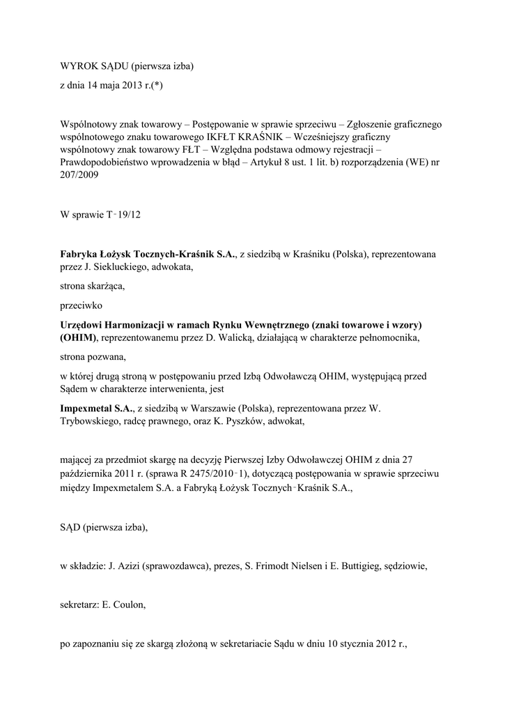 WYROK SĄDU (pierwsza izba) z dnia 14 maja 2013 r.(*) Wspólnotowy znak towarowy – Postępowanie w sprawie sprzeciwu – Zgłoszenie graficznego wspólnotowego znaku towarowego IKFŁT KRAŚNIK – Wcześniejszy graficzny wspólnotowy znak towarowy FŁT – Względna podstawa odmowy rejestracji – Prawdopodobieństwo wprowadzenia w błąd – Artykuł 8 ust. 1 lit. b) rozporządzenia (WE) nr 207/2009 W sprawie T‑19/12 Fabryka Łożysk Tocznych-Kraśnik S.A., z siedzibą w Kraśniku (Polska), reprezentowana przez J. Siekluckiego, adwokata, strona skarżąca, przeciwko Urzędowi Harmonizacji w ramach Rynku Wewnętrznego (znaki towarowe i wzory) (OHIM), reprezentowanemu przez D. Walicką, działającą w charakterze pełnomocnika, strona pozwana, w której drugą stroną w postępowaniu przed Izbą Odwoławczą OHIM, występującą przed Sądem w charakterze interwenienta, jest Impexmetal S.A., z siedzibą w Warszawie (Polska), reprezentowana przez W. Trybowskiego, radcę prawnego, oraz K. Pyszków, adwokat, mającej za przedmiot skargę na decyzję Pierwszej Izby Odwoławczej OHIM z dnia 27 października 2011 r. (sprawa R 2475/2010‑1), dotyczącą postępowania w sprawie sprzeciwu między Impexmetalem S.A. a Fabryką Łożysk Tocznych‑Kraśnik S.A., SĄD (pierwsza izba), w składzie: J. Azizi (sprawozdawca), prezes, S. Frimodt Nielsen i E. Buttigieg, sędziowie, sekretarz: E. Coulon, po zapoznaniu się ze skargą złożoną w sekretariacie Sądu w dniu 10 stycznia 2012 r., po zapoznaniu się z odpowiedzią na skargę złożoną przez OHIM w sekretariacie Sądu w dniu 11 maja 2012 r., po zapoznaniu się z odpowiedzią interwenienta na skargę złożoną w sekretariacie Sądu w dniu 4 maja 2012 r., uwzględniając decyzję z dnia 23 czerwca 2012 r. odmawiające wydania zgody na złożenie repliki, uwzględniwszy, że w terminie miesiąca od dnia powiadomienia stron o zakończeniu procedury pisemnej nie wpłynął żaden wniosek o wyznaczenie rozprawy, i postanowiwszy, na podstawie sprawozdania sędziego sprawozdawcy i w zastosowaniu art. 135a regulaminu postępowania przed Sądem, orzec w przedmiocie skargi bez przeprowadzenia ustnego etapu postępowania, wydaje następujący Wyrok Okoliczności powstania sporu 1 W dniu 26 września 2007 r. skarżąca, Fabryka Łożysk Tocznych‑Kraśnik S.A., dokonała w Urzędzie Harmonizacji w ramach Rynku Wewnętrznego (znaki towarowe i wzory) (OHIM) zgłoszenia wspólnotowego znaku towarowego na podstawie rozporządzenia Rady (WE) nr 40/94 z dnia 20 grudnia 1993 r. w sprawie wspólnotowego znaku towarowego (Dz.U. 1994, L 11, s. 1), ze zmianami [zastąpionego rozporządzeniem Rady (WE) nr 207/2009 z dnia 26 lutego 2009 r. w sprawie wspólnotowego znaku towarowego (Dz.U. L 78, s. 1)]. 2 Znakiem towarowym, dla którego wystąpiono o rejestrację, jest następujące oznaczenie graficzne: 3 Towary, dla których wystąpiono o rejestrację, należą do klasy 7 Porozumienia nicejskiego dotyczącego międzynarodowej klasyfikacji towarów i usług dla celów rejestracji znaków z dnia 15 czerwca 1957 r., ze zmianami, i odpowiadają następującemu opisowi: „maszyny i obrabiarki; łożyska toczne i ich elementy (kulki, wałeczki łożyskowe); łożyska baryłkowe i łożyska wielkogabarytowe”. 4 Zgłoszenie wspólnotowego znaku towarowego zostało opublikowane w Biuletynie Wspólnotowych Znaków Towarowych nr 16/2008 z dnia 21 kwietnia 2008 r. 5 W dniu 27 czerwca 2008 r. interwenient, Impexmetal S.A., wniósł, działając na podstawie art. 42 ust. 1 rozporządzenia nr 40/94 (obecnie art. 41 ust. 1 rozporządzenia nr 207/2009), sprzeciw wobec rejestracji zgłoszonego znaku towarowego, podnosząc w odniesieniu do wszystkich towarów wskazanych w pkt 3 powyżej prawdopodobieństwo wprowadzenia w błąd w rozumieniu art. 8 ust. 1 lit. b) rozporządzenia nr 40/94 [obecnie art. 8 ust. 1 lit. b) rozporządzenia nr 207/2009]. 6 Sprzeciw został oparty między innymi na następującym wcześniejszym graficznym wspólnotowym znaku towarowym, zarejestrowanym w dniu 14 lutego 2005 r. pod nr. 3415437: oznaczającym określone towary z klasy 7, odpowiadające następującemu opisowi: „łożyska toczne (jak łożyska kulkowe, wałeczkowe, baryłkowe i igiełkowe)”. 7 Decyzją z dnia 19 października 2010 r. Wydział Sprzeciwów uwzględnił sprzeciw, stwierdzając, że w przypadku kolidujących ze sobą znaków towarowych istnieje prawdopodobieństwo wprowadzenia w błąd. 8 W dniu 15 grudnia 2010 r. skarżąca – działając na podstawie art. 58–64 rozporządzenia nr 207/2009 – wniosła do OHIM odwołanie od decyzji Wydziału Sprzeciwów. 9 Decyzją z dnia 27 października 2011 r. (zwaną dalej „zaskarżoną decyzją”) Pierwsza Izba Odwoławcza oddaliła odwołanie i potwierdziła istnienie w przypadku kolidujących ze sobą znaków towarowych prawdopodobieństwa wprowadzenia w błąd w rozumieniu art. 8 ust. 1 lit. b) rozporządzenia nr 207/2009. 10 Co się tyczy porównania towarów, Izba Odwoławcza stwierdziła, że wykaz towarów oznaczonych wcześniejszym znakiem towarowym zawiera łożyska toczne, przy czym to ogólne pojęcie obejmuje między innymi pozostałe towary wskazane w tym wykazie, a mianowicie łożyska kulkowe, łożyska wałeczkowe, łożyska igiełkowe i łożyska baryłkowe, jak również łożyska baryłkowe oznaczone zgłoszonym znakiem towarowym. W konsekwencji wymienione powyżej towary są identyczne z towarami odpowiadającymi opisowi: „łożyska toczne i ich elementy (kulki, wałeczki łożyskowe); łożyska baryłkowe i łożyska wielkogabarytowe”, objętymi zgłoszeniem znaku towarowego. Ponadto w zakresie, w jakim wyrażenie „ich elementy” odnosi się do części składowych, istnieje co najmniej – z uwagi na stosunek komplementarności między tymi towarami a poszczególnymi rodzajami łożysk – wysoki poziom podobieństwa. Wreszcie w ocenie Izby Odwoławczej w towarach odpowiadających opisowi: „maszyny 