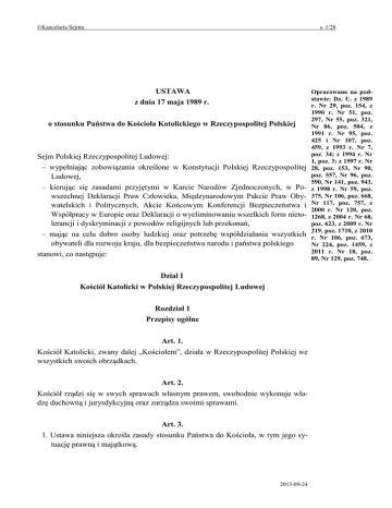 ©Kancelaria Sejmu s. 1/28 USTAWA z dnia 17 maja 1989 r. o stosunku Państwa do Kościoła Katolickiego w Rzeczypospolitej Polskiej Sejm Polskiej Rzeczypospolitej Ludowej: – wypełniając zobowiązania określone w Konstytucji Polskiej Rzeczypospolitej Ludowej, – kierując się zasadami przyjętymi w Karcie Narodów Zjednoczonych, w Powszechnej Deklaracji Praw Człowieka, Międzynarodowym Pakcie Praw Obywatelskich i Politycznych, Akcie Końcowym Konferencji Bezpieczeństwa i Współpracy w Europie oraz Deklaracji o wyeliminowaniu wszelkich form nietolerancji i dyskryminacji z powodów religijnych lub przekonań, – mając na celu dobro osoby ludzkiej oraz potrzebę współdziałania wszystkich obywateli dla rozwoju kraju, dla bezpieczeństwa narodu i państwa polskiego stanowi, co następuje: Dział I Kościół Katolicki w Polskiej Rzeczypospolitej Ludowej Rozdział 1 Przepisy ogólne Art. 1. Kościół Katolicki, zwany dalej „Kościołem”, działa w Rzeczypospolitej Polskiej we wszystkich swoich obrządkach. Art. 2. Kościół rządzi się w swych sprawach własnym prawem, swobodnie wykonuje władzę duchowną i jurysdykcyjną oraz zarządza swoimi sprawami. Art. 3. 1. Ustawa niniejsza określa zasady stosunku Państwa do Kościoła, w tym jego sytuację prawną i majątkową. 2013-09-24 Opracowano na podstawie: Dz. U. z 1989 r. Nr 29, poz. 154, z 1990 r. Nr 51, poz. 297, Nr 55, poz. 321, Nr 86, poz. 504, z 1991 r. Nr 95, poz. 425 i Nr 107, poz. 459, z 1993 r. Nr 7, poz. 34; z 1994 r. Nr 1, poz. 3; z 1997 r. Nr 28, poz. 153, Nr 90, poz. 557, Nr 96, poz. 590, Nr 141, poz. 943, z 1998 r. Nr 59, poz. 375, Nr 106, poz. 668, Nr 117, poz. 757, z 2000 r. Nr 120, poz. 1268, z 2004 r. Nr 68, poz. 623, z 2009 r. Nr 219, poz. 1710, z 2010 r. Nr 106, poz. 673, Nr 224, poz. 1459, z 2011 r. Nr 18, poz. 89, Nr 129, poz. 748. ©Kancelaria Sejmu s. 2/28 2. W sprawach odnoszących się do Kościoła, nie uregulowanych niniejszą ustawą, stosuje się powszechnie obowiązujące przepisy prawa, o ile nie są sprzeczne z wynikającymi z niej zasadami. Art. 4. 1. Komisja Wspólna przedstawicieli Rządu Polskiej Rzeczypospolitej Ludowej i Konferencji Episkopatu Polski, składająca się z ich upoważnionych przedstawicieli, w uzgodnionej liczbie na zasadzie parytetu, zwana dalej „Komisją Wspólną”, rozpatruje problemy związane z rozwojem stosunku między Państwem i Kościołem oraz sprawy interpretacji niniejszej ustawy i jej wykonywania. 2. Przepis ust. 1 nie narusza właściwości organów państwowych ani organów Kościoła, jak również kompetencji Stolicy Apostolskiej. Rozdział 2 Osoby prawne Kościoła i ich organy Art. 5. 1. W skład struktury organizacyjnej Kościoła wchodzą osoby prawne wymienione w art. 6–10. 2. Ilekroć w ustawie jest mowa o władzy kościelnej, rozumie się przez to organ właściwej kościelnej osoby prawnej. Art. 6. 1. Osobą prawną Kościoła o zasięgu ogólnopolskim jest Konferencja Episkopatu Polski. 2. Organami Konferencji Episkopatu Polski są: 1) Prezydium Konferencji Episkopatu Polski, 2) Rada Główna Konferencji Episkopatu Polski, 3) Sekretariat Konferencji Episkopatu Polski. 3. W sprawach majątkowych Konferencję Episkopatu Polski reprezentuje jej Prezydium. Do składania oświadczeń woli jest uprawniony każdy z jego członków. Art. 7. 1. Osobami prawnymi są następujące terytorialne jednostki organizacyjne Kościoła: 1) metropolie, 2) archidiecezje, 3) diecezje, 4) administratury apostolskie, 5) parafie. 2. Osobami prawnymi są również: 1) kościoły rektoralne (rektoraty), 2) Caritas Polska, 2013-09-24 ©Kancelaria Sejmu s. 3/28 3) Caritas diecezji, 4) Papieskie Dzieła Misyjne. 3. Organami osób prawnych wymienionych w ust. 1 i 2 są: 1) dla metropolii gnieźnieńskiej – metropolita gnieźnieński, Prymas Polski, dla innych metropolii – metropolita, 2) dla archidiecezji – arcybiskup archidiecezjalny lub administrator archidiecezji, 3) dla diecezji – biskup diecezjalny lub administrator diecezji, 4) dla administratury apostolskiej – administrator apostolski, 5) dla parafii – proboszcz lub administrator parafii, 6) dla kościoła rektoralnego – rektor, 7) dla Caritas Polskiej – dyrektor, 8) dla Caritas diecezji – dyrektor, 9) dla Papieskich Dzieł Misyjnych – dyrektor krajowy. 4. Ilekroć w ustawie używa się określenia „biskup diecezjalny”, rozumie się przez to organy osób prawnych wymienione w ust. 3 pkt 2–4. Art. 8. 1. Osobami prawnymi są następujące personalne jednostki organizacyjne Kościoła: 1) Ordynariat Polowy, 2) kapituły, 3) parafie personalne, 4) Konferencja Wyższych Przełożonych Zakonnych Męskich, 5) Konferencja Wyższych Przełożonych Zakonnych Żeńskich, 6) instytuty życia konsekrowanego (instytuty zakonne i instytuty świeckie) oraz stowarzyszenia życia apostolskiego; te instytuty i stowarzyszenia zwane są dalej „zakonami”, 7) prowincje zakonów, 8) opactwa, klasztory niezależne, domy zakonne, 9) wyższe i niższe seminaria duchowne diecezjalne, 10) wyższe i niższe seminaria duchowne zakonne, jeżeli, w myśl przepisów danego zakonu, mają charakter samoistny. 2. Organami osób prawnych wymienionych w ust. 1 są: 1) dla Ordynariatu Polowego – ordynariusz polowy, 2) dla kapituły – prepozyt albo dziekan, 3) dla parafii personalnej – proboszcz lub administrator parafii, 4) dla Konferencji Wyższych Przełożonych Zakonnych – przewodniczący (przewodnicząca) Konsulty Wyższych Przełożonych Zakonnych, 5) dla zakonów – wyższy przełożony (przełożona), 6) dla prowincji zakonnej – przełożony (przełożona) prowincji, 7) dla opactwa – opat (przełożona), 8) dla klasztoru niezależnego i domu zakonnego – przełożony (przełożona), 2013-09-24 ©Kancelaria Sejmu s. 4/28 9) dla wyższego seminarium duchownego – rektor, 10) dla niższego seminarium duchownego – dyrektor. 3. Organy osób prawnych zakonnych mogą używać innych nazw, stosownie do 