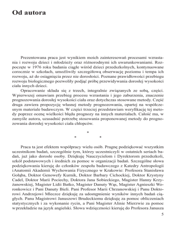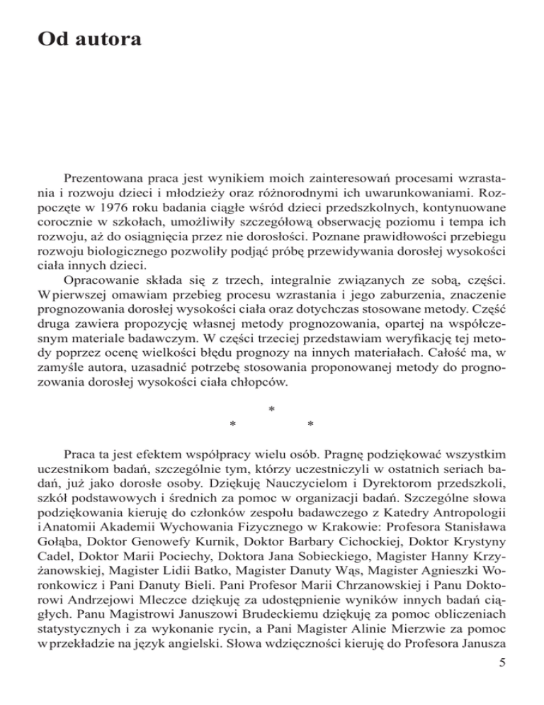 Od autora Prezentowana praca jest wynikiem moich zainteresowań procesami wzrastania i rozwoju dzieci i młodzieży oraz różnorodnymi ich uwarunkowaniami. Rozpoczęte w 1976 roku badania ciągłe wśród dzieci przedszkolnych, kontynuowane corocznie w szkołach, umożliwiły szczegółową obserwację poziomu i tempa ich rozwoju, aż do osiągnięcia przez nie dorosłości. Poznane prawidłowości przebiegu rozwoju biologicznego pozwoliły podjąć próbę przewidywania dorosłej wysokości ciała innych dzieci. Opracowanie składa się z trzech, integralnie związanych ze sobą, części. W pierwszej omawiam przebieg procesu wzrastania i jego zaburzenia, znaczenie prognozowania dorosłej wysokości ciała oraz dotychczas stosowane metody. Część druga zawiera propozycję własnej metody prognozowania, opartej na współczesnym materiale badawczym. W części trzeciej przedstawiam weryfikację tej metody poprzez ocenę wielkości błędu prognozy na innych materiałach. Całość ma, w zamyśle autora, uzasadnić potrzebę stosowania proponowanej metody do prognozowania dorosłej wysokości ciała chłopców. * * * Praca ta jest efektem współpracy wielu osób. Pragnę podziękować wszystkim uczestnikom badań, szczególnie tym, którzy uczestniczyli w ostatnich seriach badań, już jako dorosłe osoby. Dziękuję Nauczycielom i Dyrektorom przedszkoli, szkół podstawowych i średnich za pomoc w organizacji badań. Szczególne słowa podziękowania kieruję do członków zespołu badawczego z Katedry Antropologii i Anatomii Akademii Wychowania Fizycznego w Krakowie: Profesora Stanisława Gołąba, Doktor Genowefy Kurnik, Doktor Barbary Cichockiej, Doktor Krystyny Cadel, Doktor Marii Pociechy, Doktora Jana Sobieckiego, Magister Hanny Krzyżanowskiej, Magister Lidii Batko, Magister Danuty Wąs, Magister Agnieszki Woronkowicz i Pani Danuty Bieli. Pani Profesor Marii Chrzanowskiej i Panu Doktorowi Andrzejowi Mleczce dziękuję za udostępnienie wyników innych badań ciągłych. Panu Magistrowi Januszowi Brudeckiemu dziękuję za pomoc obliczeniach statystycznych i za wykonanie rycin, a Pani Magister Alinie Mierzwie za pomoc w przekładzie na język angielski. Słowa wdzięczności kieruję do Profesora Janusza 5 Zdebskiego i Profesora Jerzego Cempli, których optymizm pozwolił mi pokonać trudne chwile. Pani Prof. dr hab. Teresie Łasce-Mierzejewskiej i Panu Prof. dr hab. Stanisławowi Gołąbowi dziękuję za kompetentne recenzje. Mojej żonie Elżbiecie dziękuję za wsparcie i wyrozumiałość przy pisaniu tej pracy. Ryszard Żarów Kraków, październik 2001 6