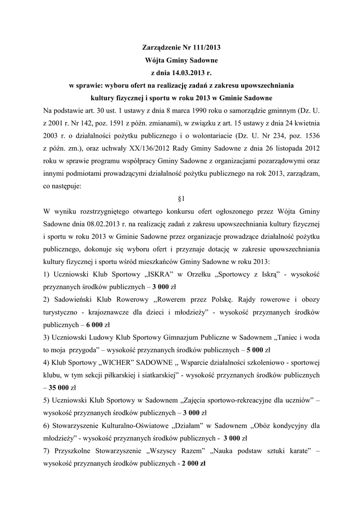Zarządzenie Nr 111/2013 Wójta Gminy Sadowne z dnia 14.03.2013 r. w sprawie: wyboru ofert na realizację zadań z zakresu upowszechniania kultury fizycznej i sportu w roku 2013 w Gminie Sadowne Na podstawie art. 30 ust. 1 ustawy z dnia 8 marca 1990 roku o samorządzie gminnym (Dz. U. z 2001 r. Nr 142, poz. 1591 z późn. zmianami), w związku z art. 15 ustawy z dnia 24 kwietnia 2003 r. o działalności poŜytku publicznego i o wolontariacie (Dz. U. Nr 234, poz. 1536 z późn. zm.), oraz uchwały XX/136/2012 Rady Gminy Sadowne z dnia 26 listopada 2012 roku w sprawie programu współpracy Gminy Sadowne z organizacjami pozarządowymi oraz innymi podmiotami prowadzącymi działalność poŜytku publicznego na rok 2013, zarządzam, co następuje: §1 W wyniku rozstrzygniętego otwartego konkursu ofert ogłoszonego przez Wójta Gminy Sadowne dnia 08.02.2013 r. na realizację zadań z zakresu upowszechniania kultury fizycznej i sportu w roku 2013 w Gminie Sadowne przez organizacje prowadzące działalność poŜytku publicznego, dokonuje się wyboru ofert i przyznaje dotację w zakresie upowszechniania kultury fizycznej i sportu wśród mieszkańców Gminy Sadowne w roku 2013: 1) Uczniowski Klub Sportowy „ISKRA” w Orzełku „Sportowcy z Iskrą” - wysokość przyznanych środków publicznych – 3 000 zł 2) Sadowieński Klub Rowerowy ,,Rowerem przez Polskę. Rajdy rowerowe i obozy turystyczno - krajoznawcze dla dzieci i młodzieŜy” - wysokość przyznanych środków publicznych – 6 000 zł 3) Uczniowski Ludowy Klub Sportowy Gimnazjum Publiczne w Sadownem „Taniec i woda to moja przygoda” – wysokość przyznanych środków publicznych – 5 000 zł 4) Klub Sportowy „WICHER” SADOWNE ,, Wsparcie działalności szkoleniowo - sportowej klubu, w tym sekcji piłkarskiej i siatkarskiej” - wysokość przyznanych środków publicznych – 35 000 zł 5) Uczniowski Klub Sportowy w Sadownem „Zajęcia sportowo-rekreacyjne dla uczniów” – wysokość przyznanych środków publicznych – 3 000 zł 6) Stowarzyszenie Kulturalno-Oświatowe „Działam” w Sadownem ,,Obóz kondycyjny dla młodzieŜy” - wysokość przyznanych środków publicznych - 3 000 zł 7) Przyszkolne Stowarzyszenie „Wszyscy Razem” „Nauka podstaw sztuki karate” – wysokość przyznanych środków publicznych - 2 000 zł 8) Uczniowski Ludowy Klub Sportowy Grabiny „śyję aktywnie” – wysokość przyznanych środków publicznych – 3 000 zł §2 Zarządzenie wchodzi w Ŝycie z dniem podpisania. Wójt Gminy Sadowne Zdzisław Tracz