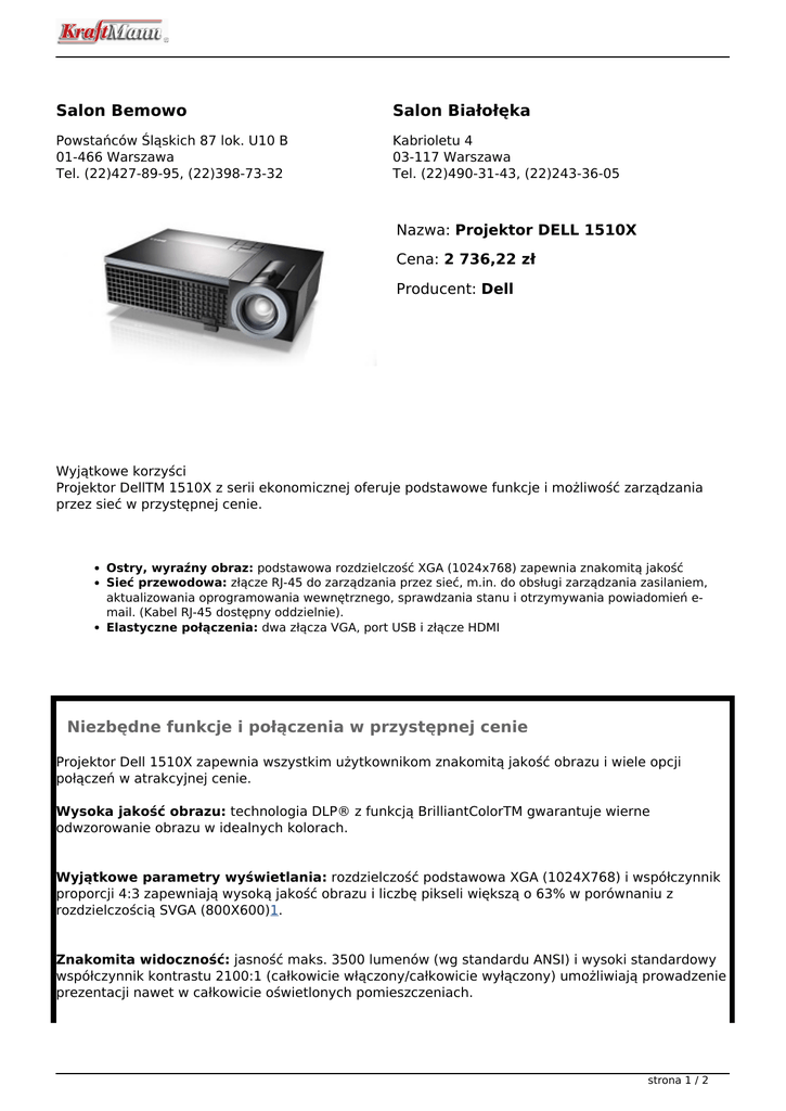 Salon Bemowo Salon Białołęka Powstańców Śląskich 87 lok. U10 B 01-466 Warszawa Tel. (22)427-89-95, (22)398-73-32 Kabrioletu 4 03-117 Warszawa Tel. (22)490-31-43, (22)243-36-05 Nazwa: Projektor DELL 1510X Cena: 2 736,22 zł Producent: Dell Wyjątkowe korzyści Projektor DellTM 1510X z serii ekonomicznej oferuje podstawowe funkcje i możliwość zarządzania przez sieć w przystępnej cenie. Ostry, wyraźny obraz: podstawowa rozdzielczość XGA (1024x768) zapewnia znakomitą jakość Sieć przewodowa: złącze RJ-45 do zarządzania przez sieć, m.in. do obsługi zarządzania zasilaniem, aktualizowania oprogramowania wewnętrznego, sprawdzania stanu i otrzymywania powiadomień email. (Kabel RJ-45 dostępny oddzielnie). Elastyczne połączenia: dwa złącza VGA, port USB i złącze HDMI Niezbędne funkcje i połączenia w przystępnej cenie Projektor Dell 1510X zapewnia wszystkim użytkownikom znakomitą jakość obrazu i wiele opcji połączeń w atrakcyjnej cenie. Wysoka jakość obrazu: technologia DLP® z funkcją BrilliantColorTM gwarantuje wierne odwzorowanie obrazu w idealnych kolorach. Wyjątkowe parametry wyświetlania: rozdzielczość podstawowa XGA (1024X768) i współczynnik proporcji 4:3 zapewniają wysoką jakość obrazu i liczbę pikseli większą o 63% w porównaniu z rozdzielczością SVGA (800X600)1. Znakomita widoczność: jasność maks. 3500 lumenów (wg standardu ANSI) i wysoki standardowy współczynnik kontrastu 2100:1 (całkowicie włączony/całkowicie wyłączony) umożliwiają prowadzenie prezentacji nawet w całkowicie oświetlonych pomieszczeniach. strona 1 / 2 Elastyczne połączenia: dwa złącza VGA umożliwiają szybkie przełączanie się między prezentacjami komputerowymi, natomiast porty USB i HDMI pozwalają szybko podłączać różne urządzenia, np. odtwarzacze DVD. Łatwe zarządzanie i sterowanie Dzięki wbudowanej obsłudze sieci przewodowej oraz elastycznym funkcjom konfiguracji i konserwacji projektor Dell 1510X zapewnia pełną kontrolę użytkownikom i administratorom. Zdalne zarządzanie: przy użyciu złącza RJ-45 administratorzy mogą zdalnie sterować zasilaniem (włączać lub wyłączać urządzenie), przeprowadzać czynności konserwacyjne, aktualizować oprogramowanie wewnętrzne i konfigurować alerty e-mail2. Elastyczne opcje dźwięku: gniazdo mikrofonu pozwala prelegentom dodawać ścieżkę dźwiękową z komentarzami, natomiast funkcja obsługi napisów za pośrednictwem wejść kompozytowego lub SVideo pozwala uczestnikom z wadami słuchu odczytywać tekst ścieżek dźwiękowych wybranych materiałów wideo i programów telewizyjnych. Uniwersalna konfiguracja: opcje montażu na biurku i pod sufitem oraz funkcje projekcji przedniej i tylnej zapewniają maksymalną swobodę konfiguracji projektora. Wygodne sterowanie: w pełni funkcjonalny pilot zdalnego sterowania umożliwia szybkie wyłączanie projektora, regulowanie parametrów obrazu, zmianę trybu wideo, a nawet ukrywanie prezentacji (za pomocą funkcji pustego ekranu). Niski całkowity koszt użytkowania Projektor Dell 1510X ma przemyślaną konstrukcję, a dostępne opcje pomocy technicznej jeszcze bardziej obniżają całkowity koszt użytkowania. Energooszczędna konstrukcja: zgodność z klasą 1 normy EuP oznacza, że projektor Dell 1510X w trybie gotowości zużywa mniej niż 1 W energii. Długa żywotność lampy: dodatkowa oszczędność kosztów dzięki żywotności lampy na poziomie 3000 godzin3 (tryb zwykły) i 4000 godzin3 (tryb ekonomiczny) Wbudowane zabezpieczenia: ochrona hasłem i gniazdo linki zabezpieczającej (linka jest dostępna oddzielnie) zapewniają spokój podczas korzystania z projektora 1510X w miejscach publicznych. Niezawodny serwis i pomoc techniczna: szybki powrót do pracy dzięki standardowej 2-letniej usłudze wymiany w następnym dniu roboczym lub usłudze CompleteCare. Dodatkowe bezpieczeństwo dzięki opcjonalnemu wydłużeniu okresu usługi wymiany w następnym dniu roboczym4 do 5 lat lub rozszerzeniu opcjonalnej usługi CompleteCareTM w zakresie ochrony przed przypadkowymi uszkodzeniami5 do 3 lat (wymiana urządzenia bez dodatkowych opłat w przypadku awarii nieobjętej gwarancją na system). strona 2 / 2 Powered by TCPDF (www.tcpdf.org)