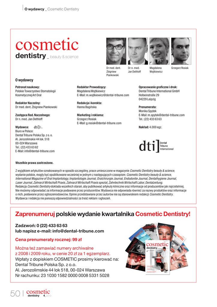 I O wydawcy _ Cosmetic Dentistry cosmetic dentistry _ beauty & science Dr med. dent. Zbigniew Piankowski Dr n. med. Jan Dethloff Magdalena Wojtkiewicz Grzegorz Rosiak O wydawcy Patronat naukowy: Polskie Towarzystwo Stomatologii Kosmetycznej Art Oral Redaktor Prowadzàcy: Magdalena Wojtkiewicz E-Mail: [email protected] Redaktor Naczelny: Dr med. dent. Zbigniew Piankowski Redakcja i korekta: Hanna Bagiƒska Zast´pca Red. Naczelnego: Dr n. med. Jan Dethloff Marketing i reklama: Grzegorz Rosiak E-Mail: [email protected] Wydawca: Biuro w Polsce: Dental Tribune Polska Sp. z o. o. Al. Jerozolimskie 44 lok. 518 00-024 Warszawa Tel.: (22) 433 63 62 E-Mail: [email protected] Opracowanie graficzne i druk: Dental Tribune International GmbH Holbeinstraße 29 04229 Leipzig Prenumerata: Monika Spytek E-Mail: [email protected] Tel.: (22) 433 63 63 Nak∏ad: 4.000 egz. Wszelkie prawa zastrze˝one. Z wyjàtkiem artyku∏ów oznakowanych w sposób szczególny, prace umieszczone w magazynie Cosmetic Dentistry beauty & science, wydanie polskie, mog∏y byç opublikowane wczeÊniej w jednym z nast´pujàcych czasopism: Cosmetic Dentistry beauty & science, International Magazine of Oral Implantology, Implantologie Journal, Oralchirurgie Journal, Endodontie Journal, Dentalhygiene Journal, Laser Journal, Zahnarzt Wirtschaft Praxis, Zahnarzt Wirtschaft Praxis spezial, Zahntechnik Wirtschaft Labor, Dentalzeitung. Redakcja Cosmetic Dentistry dok∏ada wszelkich staraƒ, aby publikowaç artyku∏y kliniczne oraz informacje od producentów jak najrzetelniej. Nie mo˝emy odpowiadaç za informacje podawane przez producentów. Wydawca nie odpowiada równie˝ za nazwy produktów oraz informacje o nich, podawane przez og∏oszeniodawców. Opinie przedstawiane przez autorów nie sà stanowiskiem redakcji Cosmetic Dentistry. Wydawca i redakcja nie ponoszà odpowiedzialnoÊci za treÊç reklam i og∏oszeƒ. Zaprenumeruj polskie wydanie kwartalnika Cosmetic Dentistry! etic cdeontisstm ry Vol.6 Nr Zadzwoƒ: 0 (22) 433 63 63 lub napisz e-mail: [email protected] 4 • grudzieƒ • 2009 PLN _ beaut 2009 4 y & scienc e polskie wydanie N ISS 418 3-5 173 ISSN 1733-5418 Cena: 29 PLN Vol. 7 Nr 4 • grudzieƒ • 2010 PLN .6 Vol _b Nr 1• ea c• rze ma &s 09 20 uty cie nc e | Komunikacja z pacjentem Akceptacja planu leczenia 29 | Praktyka Licówki ceramiczne bez szlifowania a: Cen | Temat specjalny Obrazowanie w stomatologii estetycznej e lski po 4_ 2010 2010 wydanie polskie ie an wyd dentistry _ beauty & science 4 09 50 I cosmetic tywy _Perspek w praktyce CAD/CAM y jaln e ec ow sp elan at rc em po _T wki nik Licó tyka te techyjnych ro ie _P czen trukc ¸à ns gia wa reko olo zt ch wód sy zy _P le pr Sty Mo˝na te˝ zamawiaç numery archiwalne z 2008 i 2009 roku, w cenie 20 z∏ za 1 egzemplarz. Wp∏aty z dopiskiem COSMETIC prosimy kierowaç na: Dental Tribune Polska Sp. z o.o. Al. Jerozolimskie 44 lok 518, 00-024 Warszawa Nr rachunku: 23 1030 1582 0000 0008 5331 5028 20 cosmetic dentistry a _Praktyk natur´? ej dowaç i anatomiczn Jak naÊla stratyfikacj Technika 1 specjalny echu _Temat anie uÊmi Projektow c eti smy cdoentistr Cena prenumeraty rocznej: 99 z∏ Cena: 29 8 ISSN 1733-541