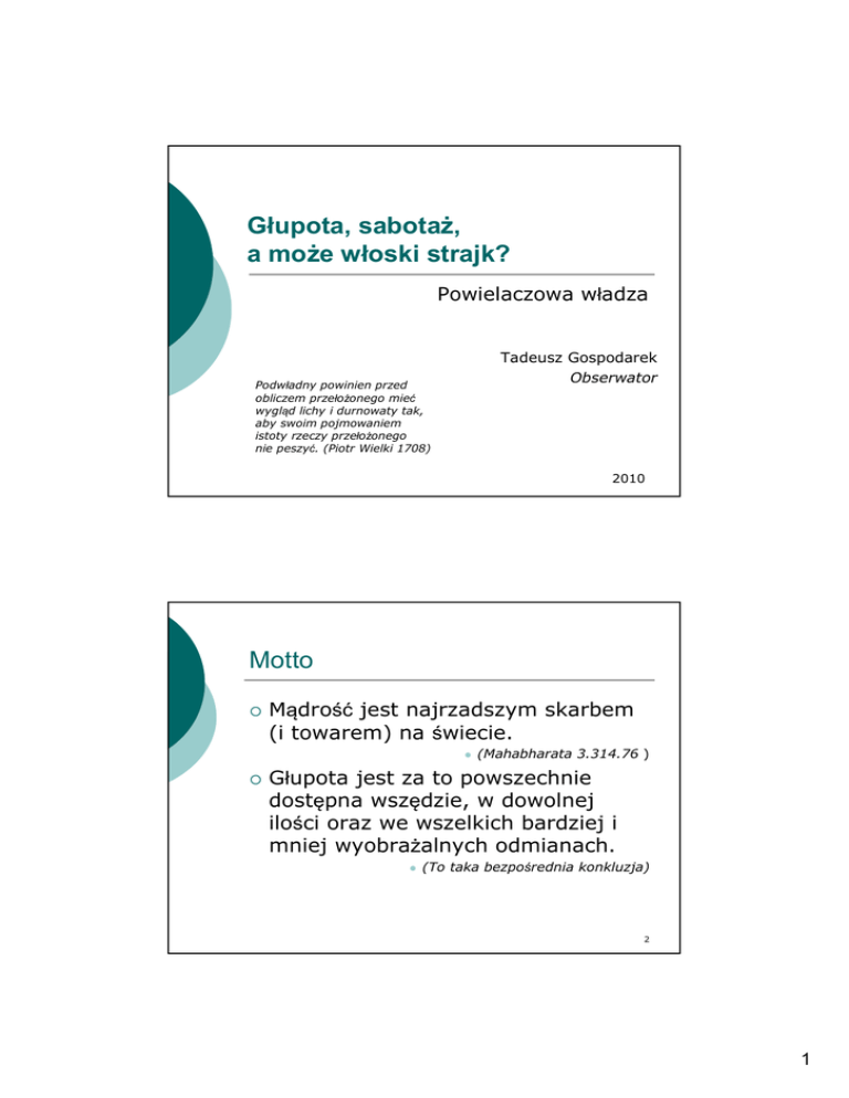 Głupota, sabotaż, a może włoski strajk? Powielaczowa władza Tadeusz Gospodarek Obserwator Podwładny powinien przed obliczem przełożonego mieć wygląd lichy i durnowaty tak, aby swoim pojmowaniem istoty rzeczy przełożonego nie peszyć. (Piotr Wielki 1708) 2010 Motto Mądrość jest najrzadszym skarbem (i towarem) na świecie. (Mahabharata 3.314.76 ) Głupota jest za to powszechnie dostępna wszędzie, w dowolnej ilości oraz we wszelkich bardziej i mniej wyobrażalnych odmianach. (To taka bezpośrednia konkluzja) 2 1 Głupota relacyjna Głupota ma szczególną reprezentację w biurokratycznych formalizmach, procedurach oraz kulawym prawodawstwie gdzie prawo powielaczowe – czytaj (wytyczne, zalecenia, instrukcje) wypierają logikę biznesową oraz wypaczają sens aktów zasadniczych. Dla tej radosnej twórczości tworzy się relacje w strukturach biurokratycznych, prowadzące do stanu głupoty relacyjnej. 3 Głupotę trzeba pielęgnować Aby nieść posłannictwo dziejowe w imię relacyjnej głupoty, konieczny jest rozwój kadr, systemów, procedur… Te zasoby biurokracji żeby miały co robić szukają zajęcia, tworząc nadinterpretacje, nadinstrukcje, zalecenia, wytyczne oraz wytyczne do wytycznych. Używając pokrętnego języka wznoszą katedrę pseudowiedzy oraz aktów stanowiących „prawo powielaczowe” 4 2 Dlaczego powielaczowe? Bo są to niezwykłe wydawnictwa klasyfikowane onegdaj jako „Самиздат” (czyli na powielaczu edytowane). Autor to tajemniczy anonim, kryjący się za określeniem – władza wdrażająca, komitet monitorujący, zespół pełnomocny ds. czegoś tam. Nie ma autora – za to jest zbiorowy sukces, zbiorowa odpowiedzialność i zbiorowe rozmycie. Władza powielaczowa ma ogromne potrzeby twórcze, co przekłada się na tony stron, kilometry archiwów i godziny bicia piany na zebraniach i nasiadówkach. A jakież z tego wychodzą dzieła i problemy? 5 I co z tego wynika? Średnio raz na 2 tygodnie powstaje jakiś kolejny knot proceduralny, formularz lub edykt, zmieniający wersję poprzednią. Jest kolejny sukces – jest zatem potrzeba rozbudowania systemu i dodania procedur, formularzy i sprawozdań. Głupota osiąga szczyt piramidy i wydaje się, że już większego knota wypichcić się nie da. Ale nie… 6 3 Jest jeszcze kontrola. Typowa kontrola systemu ISO, czyli spisany na wołowej skórze system donoszenia jednego na drugiego, zgodnie z ustaloną procedurą. Nie jest ważny sens kontroli i procedur – ważny jest system i zapis, czy Kowalski doniósł na Wiśniewskiego. No i co z tego, że to nie ma sensu? Jest za to kij i marchewka oraz gwarancja, że nic się nie zmieni ani na lepsze ani na gorsze – za to system przetrwa wieki. Zupełnie jak kiedyś na PKP. A było tak… 7 Bileciki do kontroli. Wchodzi konduktor do przedziału i nakazuje – bileciki do kontroli. Za 15 minut kierownik pociągu sprawdza, czy konduktor sprawdził, i ponownie gromko głosi – bileciki do kontroli. Na następnej stacji węzłowej wsiada cywil w ortalionie z czarną odznaką „kontrola pociągów” i znowu – bileciki do kontroli. Na końcu ten kontroler składa raport w dyrekcji, że konduktor nie zauważył, a kierownik był nawalony… I tak to sobie działało. A po co? Odp. ??? 8 4 Władza powielaczowa I tak powstała władza wdrażająca powielaczowe prawo, uzurpująca sobie interpretacje, arbitraż, kontrolę i egzekucję. Władza, która wymusza, która karze, która ma własne, niezależne procedury. Władza niebezpieczna, ponieważ zarządza ogromnym majątkiem i kapitałem. Władza marnotrawna, stanowiąca idealną ilustrację praw Parkinsona. Władza pasożytnicza, ponieważ systemowo ogranicza możliwości jej likwidacji i mocno się ukorzenia w strukturach państwa. 9 A oto idealny przykład Władza wdrażająca Regionalny Program Operacyjny na lata 2007-2013…, program strukturalny wsparcia UE w ramach funduszu EFRR Mamy 16 Urzędów, mamy 16 Oberdyrektorów, mamy ze 100 Dyrektorów i z 1000 kierowników. Mamy 16 dużych biur, systemów informacyjnych, systemów archiwów, kontroli, itd… Przerabia ta struktura tony papieru, marnuje tysiące dniówek, przynosząc wymierne koszty. Zatruwa życie tysiącom księgowych, urzędników, przedsiębiorców, blokując przepływy środków finansowych oraz źle sterując ich wykorzystaniem. 10 5 A wszystko to za sprawą. A nie, nie – nie Unii Europejskiej ale wąskiej grupy interesariuszy władzy politycznej, dla których jest to idealny biznes i możliwość okopania chwiejnych pozycji, agencjami, strukturami biurokratycznymi, a przy tym przejęcia zarządzania ogromnym kapitałem i zasobami. To oni wspierają władzę powielaczową. To dla siebie szykują miękkie lądowanie za czas jakiś w miłych strukturach władzy powielaczowej. 11 Jakie mamy tego rezultaty? Niewydolność systemu decyzyjnego. Frustracja pracowników operacyjnych. Frustracja beneficjentów. Brak możliwości płynnej absorpcji funduszy. Klincz formalno-prawny. Deficyt budżetowy. 12 6 Case 1 (ocena formalna wniosku) Co do naszego wniosku to już teraz jest ok., tzn. nie jest ok. bo koleżanki z RPO na nowo wykryły „nieprawidłowości” w oświadczeniach dotyczących Vatu i zabezpieczenia finansowego i ochrony środowiska!!!! Np.: w oświadczeniu o ochronie środowiska źle (podobno) wypełniony był kwadracik (tak tak!) tzn. nie drugi kwadracik trzeba było zaznaczyć „x” pt.: że „dyrektywa nr 2” tylko kwadracik trzeci pt.: „żadna powyższa dyrektywa” !! Ja pier…. Ale sami już wiedzą że przegięli więc zgodzili się nieoficjalnie, że nieoficjalnie mogę wszystko dostarczyć co zrobiłem. Nie opisuję już wstrząsających szczegółów „zmian” w pozostałych oświadczeniach bo by mnie szlag trafił przy klawiaturze. Trochę nawet im współczułem bo oni sami nie wiedzą jak jest dobrze, miotają się, a taki sukinkot jak ja tylko ich napierdziela. Ale ale – jest zła wiadomo