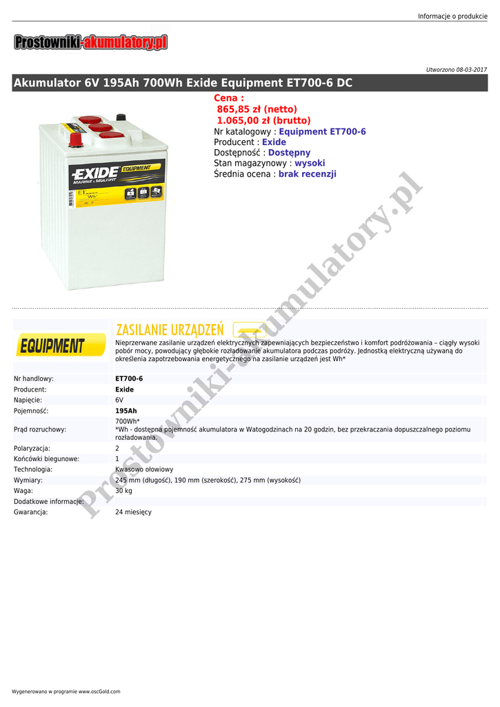 Informacje o produkcie Utworzono 08-03-2017 Akumulator 6V 195Ah 700Wh Exide Equipment ET700-6 DC Cena : 865,85 zł (netto) 1.065,00 zł (brutto) um ul at or y. p l Nr katalogowy : Equipment ET700-6 Producent : Exide Dostępność : Dostępny Stan magazynowy : wysoki Średnia ocena : brak recenzji -a k Nieprzerwane zasilanie urządzeń elektrycznych zapewniających bezpieczeństwo i komfort podróżowania – ciągły wysoki pobór mocy, powodujący głębokie rozładowanie akumulatora podczas podróży. Jednostką elektryczną używaną do określenia zapotrzebowania energetycznego na zasilanie urządzeń jest Wh* ET700-6 Producent: Exide Napięcie: 6V Pojemność: 195Ah Prąd rozruchowy: 700Wh* *Wh - dostępna pojemność akumulatora w Watogodzinach na 20 godzin, bez przekraczania dopuszczalnego poziomu rozładowania. Waga: Kwasowo ołowiowy 245 mm (długość), 190 mm (szerokość), 275 mm (wysokość) 30 kg Dodatkowe informacje: Gwarancja: ni 1 Pr os Wymiary: w 2 Końcówki biegunowe: Technologia: to Polaryzacja: ki Nr handlowy: 24 miesięcy Wygenerowano w programie www.oscGold.com Akumulatory z gamy Exide Equipment Pr os to w ni ki -a k um ul at or y. p l Akumulatory Exide Equipment przeznaczone są do zastosowania na łodziach z zestawem akumulatorów dedykowanym do zasilania urządzeń nawigacyjnych, awaryjnych, zabezpieczających i zapewniających wygodę podróżowania (przypadki C i D). Taki pobór mocy powoduje, że podczas użytkowania akumulatory ulegają częściowemu lub głębokiemu rozładowaniu, dlatego specjalna konstrukcja Exide EQUIPMENT przy zastosowaniu odpowiedniej procedury ładowania daje najlepsze parametry i dobry czas eksploatacji. Akumulatory gamy EQUIPMENT o pojemności Wh* od 290Wh do 2400Wh, są najlepszą opcją zasilania urządzeń elektrycznych, począwszy od małej elektroniki, a skończywszy na zasilaniu awaryjnym. Przeciętny czas dostawy: 24 godziny