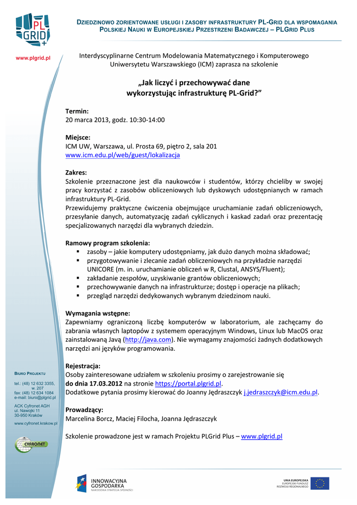 Interdyscyplinarne Centrum Modelowania Matematycznego i Komputerowego Uniwersytetu Warszawskiego (ICM) zaprasza na szkolenie „Jak liczyć i przechowywać dane wykorzystując infrastrukturę PL-Grid?” Termin: 20 marca 2013, godz. 10:30-14:00 Miejsce: ICM UW, Warszawa, ul. Prosta 69, piętro 2, sala 201 www.icm.edu.pl/web/guest/lokalizacja Zakres: Szkolenie przeznaczone jest dla naukowców i studentów, którzy chcieliby w swojej pracy korzystać z zasobów obliczeniowych lub dyskowych udostępnianych w ramach infrastruktury PL-Grid. Przewidujemy praktyczne ćwiczenia obejmujące uruchamianie zadań obliczeniowych, przesyłanie danych, automatyzację zadań cyklicznych i kaskad zadań oraz prezentację specjalizowanych narzędzi dla wybranych dziedzin. Ramowy program szkolenia: zasoby – jakie komputery udostępniamy, jak dużo danych można składować; przygotowywanie i zlecanie zadań obliczeniowych na przykładzie narzędzi UNICORE (m. in. uruchamianie obliczeń w R, Clustal, ANSYS/Fluent); zakładanie zespołów, uzyskiwanie grantów obliczeniowych; przechowywanie danych na infrastrukturze; dostęp i operacje na plikach; przegląd narzędzi dedykowanych wybranym dziedzinom nauki. Wymagania wstępne: Zapewniamy ograniczoną liczbę komputerów w laboratorium, ale zachęcamy do zabrania własnych laptopów z systemem operacyjnym Windows, Linux lub MacOS oraz zainstalowaną Javą (http://java.com). Nie wymagamy znajomości żadnych dodatkowych narzędzi ani języków programowania. Rejestracja: Osoby zainteresowane udziałem w szkoleniu prosimy o zarejestrowanie się do dnia 17.03.2012 na stronie https://portal.plgrid.pl. Dodatkowe pytania prosimy kierować do Joanny Jędraszczyk [email protected]. Prowadzący: Marcelina Borcz, Maciej Filocha, Joanna Jędraszczyk Szkolenie prowadzone jest w ramach Projektu PLGrid Plus – www.plgrid.pl