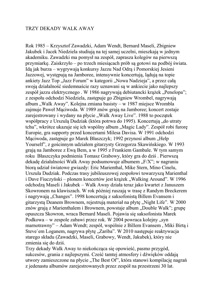 TRZY DEKADY WALK AWAY Rok 1985 – Krzysztof Zawadzki, Adam Wendt, Bernard Maseli, Zbigniew Jakubek i Jacek Niedziela studiują na tej samej uczelni, mieszkają w jednym akademiku. Zawadzki ma pomysł na zespół, zaprasza kolegów na pierwszą przymiarkę. Zaiskrzyło – po trzech miesiącach prób są gotowi na podbój świata. Idą jak burza – wygrywają konkursy Jazzu Nad Odrą i Pomorskiej Jesieni Jazzowej, występują na Jamboree, intensywnie koncertują, lądują na topie ankiety Jazz Top „Jazz Forum” w kategorii „Nowa Nadzieja”, a przez całą swoją działalność siedemnaście razy uznawani są w ankiecie jako najlepszy zespół jazzu elektrycznego . W 1986 nagrywają debiutancki krążek „Penelopa”; z zespołu odchodzi Niedziela, zastępuje go Zbigniew Wrombel, nagrywają album „Walk Away”. Kolejna zmiana basisty – w 1987 miejsce Wrombla zajmuje Paweł Mąciwoda. W 1989 znów grają na Jamboree; koncert zostaje zarejestrowany i wydany na płycie „Walk Away Live”. 1988 to początek współpracy z Urszulą Dudziak (która potrwa do 1995). Koncertują „do utraty tchu”, wkrótce ukazuje się ich wspólny album „Magic Lady”. Zespół robi furorę Europie, gra supporty przed koncertami Milesa Davisa. W 1991 odchodzi Mąciwoda, zastępuje go Marek Błaszczyk; 1992 przynosi album „Help Yourself”, z gościnnym udziałem gitarzysty Grzegorza Skawińskiego. W 1993 grają na Jamboree z Ewą Bem, a w 1995 z Frankiem Gambale. W tym samym roku Błaszczyka podmienia Tomasz Grabowy, który gra do dziś . Pierwszą dekadę działalności Walk Away podsumowuje albumem „F/X”; w nagraniu biorą udział światowe gwiazdy: Eric Marienthal, Mike Stern, Mino Cinelu, Urszula Dudziak. Podczas trasy jubileuszowej zespołowi towarzyszą Marienthal i Dave Fiuczyński – plonem koncertów jest krążek „Walking Around”. W 1996 odchodzą Maseli i Jakubek – Walk Away działa teraz jako kwartet z Januszem Skowronem na klawiszach. W rok później ruszają w trasę z Randym Breckerem i nagrywają „Changes”. 1998 koncertują z saksofonistą Billem Evansem i gitarzystą Deanem Brownem, rejestrują materiał na płytę „Night Life”. W 2000 znów grają z Marienthalem i Brownem, powstaje album „Double Walk”; grupę opuszcza Skowron, wraca Bernard Maseli. Pojawia się saksofonista Marek Podkowa – w zespole zabawi przez rok. W 2004 powraca kolejny „syn marnotrawny” – Adam Wendt; zespół, wspólnie z Billem Evansem , Miki Birtą i Steve`em Loganem, nagrywa płytę „Zariba”. W 2010 następuje reaktywacja starego składu (Zawadzki, Maseli, Grabowy, Wendt, Jakubek), który nie zmienia się do dziś. Trzy dekady Walk Away to niekończąca się opowieść, pasmo przygód, sukcesów, grania z najlepszymi. Cześć tamtej atmosfery i dźwięków oddają utwory zamieszczone na płycie „The Best Of”, która stanowi kompilację nagrań z jedenastu albumów zarejestrowanych przez zespół na przestrzeni 30 lat. Bogdan Chmura