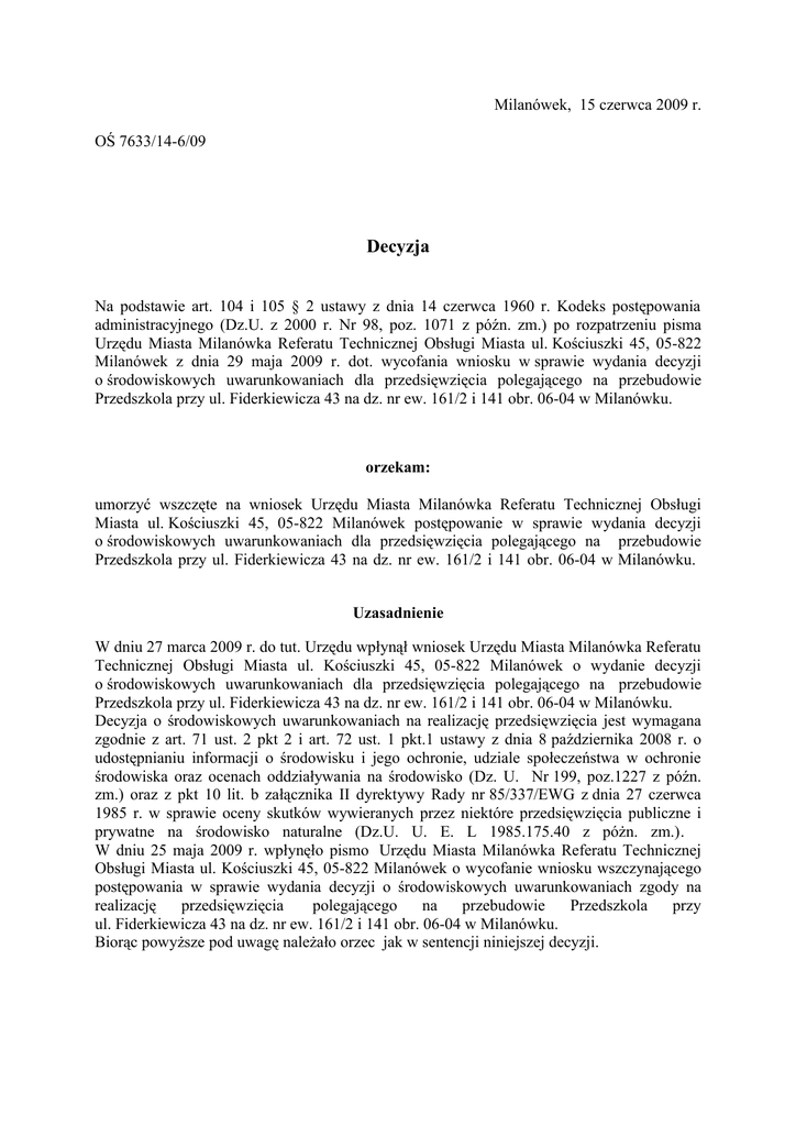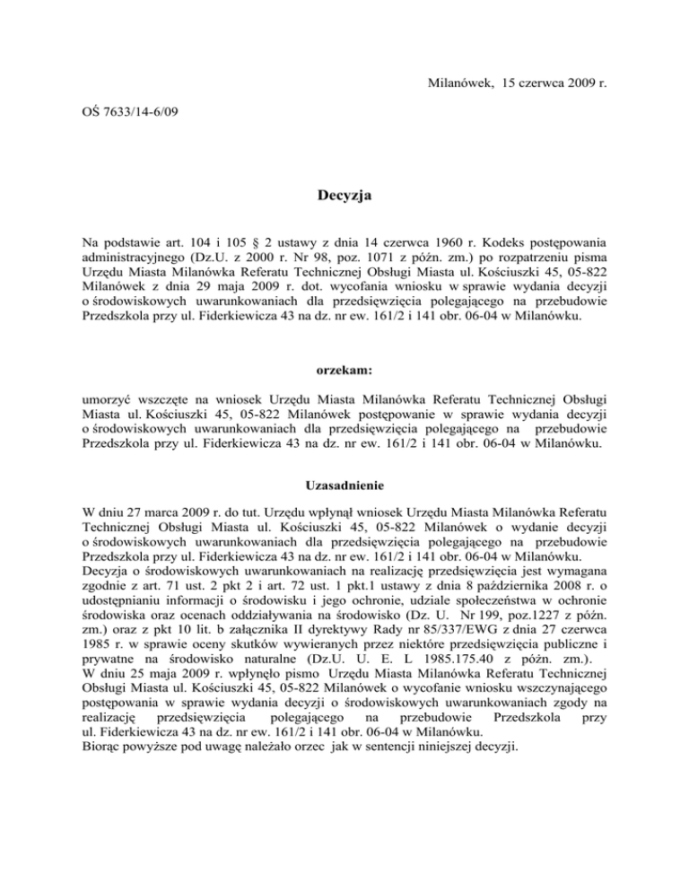 Milanówek, 15 czerwca 2009 r. OŚ 7633/14-6/09 Decyzja Na podstawie art. 104 i 105 § 2 ustawy z dnia 14 czerwca 1960 r. Kodeks postępowania administracyjnego (Dz.U. z 2000 r. Nr 98, poz. 1071 z późn. zm.) po rozpatrzeniu pisma Urzędu Miasta Milanówka Referatu Technicznej Obsługi Miasta ul. Kościuszki 45, 05-822 Milanówek z dnia 29 maja 2009 r. dot. wycofania wniosku w sprawie wydania decyzji o środowiskowych uwarunkowaniach dla przedsięwzięcia polegającego na przebudowie Przedszkola przy ul. Fiderkiewicza 43 na dz. nr ew. 161/2 i 141 obr. 06-04 w Milanówku. orzekam: umorzyć wszczęte na wniosek Urzędu Miasta Milanówka Referatu Technicznej Obsługi Miasta ul. Kościuszki 45, 05-822 Milanówek postępowanie w sprawie wydania decyzji o środowiskowych uwarunkowaniach dla przedsięwzięcia polegającego na przebudowie Przedszkola przy ul. Fiderkiewicza 43 na dz. nr ew. 161/2 i 141 obr. 06-04 w Milanówku. Uzasadnienie W dniu 27 marca 2009 r. do tut. Urzędu wpłynął wniosek Urzędu Miasta Milanówka Referatu Technicznej Obsługi Miasta ul. Kościuszki 45, 05-822 Milanówek o wydanie decyzji o środowiskowych uwarunkowaniach dla przedsięwzięcia polegającego na przebudowie Przedszkola przy ul. Fiderkiewicza 43 na dz. nr ew. 161/2 i 141 obr. 06-04 w Milanówku. Decyzja o środowiskowych uwarunkowaniach na realizację przedsięwzięcia jest wymagana zgodnie z art. 71 ust. 2 pkt 2 i art. 72 ust. 1 pkt.1 ustawy z dnia 8 października 2008 r. o udostępnianiu informacji o środowisku i jego ochronie, udziale społeczeństwa w ochronie środowiska oraz ocenach oddziaływania na środowisko (Dz. U. Nr 199, poz.1227 z późn. zm.) oraz z pkt 10 lit. b załącznika II dyrektywy Rady nr 85/337/EWG z dnia 27 czerwca 1985 r. w sprawie oceny skutków wywieranych przez niektóre przedsięwzięcia publiczne i prywatne na środowisko naturalne (Dz.U. U. E. L 1985.175.40 z póżn. zm.). W dniu 25 maja 2009 r. wpłynęło pismo Urzędu Miasta Milanówka Referatu Technicznej Obsługi Miasta ul. Kościuszki 45, 05-822 Milanówek o wycofanie wniosku wszczynającego postępowania w sprawie wydania decyzji o środowiskowych uwarunkowaniach zgody na realizację przedsięwzięcia polegającego na przebudowie Przedszkola przy ul. Fiderkiewicza 43 na dz. nr ew. 161/2 i 141 obr. 06-04 w Milanówku. Biorąc powyższe pod uwagę należało orzec jak w sentencji niniejszej decyzji. Pouczenie Od niniejszej decyzji służy stronie prawo wniesienia odwołania do Samorządowego Kolegium Odwoławczego w Warszawie za pośrednictwem Burmistrza Miasta Milanówka w terminie 14-tu dni od daty jej otrzymania. Otrzymują: 1. 2. 3. 4. Urząd Miasta Milanówka, Referat Technicznej Obsługi Miasta, ul. Kościuszki 45, 05-822 Milanówek, Państwowy Powiatowy Inspektor Sanitarny, ul. Daleka 11, 05-825 Grodzisk Mazowiecki, Starostwo Powiatu Grodziskiego ul. Kościuszki 30, 05-825 Grodzisk Mazowiecki, a/a Przygotował: Joanna Wysocka-Sawczuk