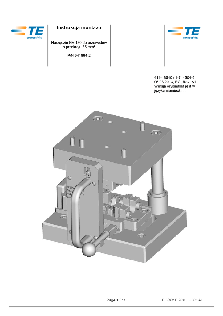 Instrukcja montażu Narzędzie HV 180 do przewodów o przekroju 35 mm² P/N 541864-2 411-18540 / 1-744504-6 06.03.2013, RG, Rev. A1 Wersja oryginalna jest w języku niemieckim. Page 1 / 11 ECOC: EGC0 ; LOC: AI 541864-2 411-18540 Rev.A Wersja polskojęzyczna Spis treści ........................................................................................................................3 Producent: TE Connectivity Tyco Electronics AMP GmbH Dział Zaawansowanych Technologii Ampérestraße 12-14 64625 Bensheim Strona2 / 11 ECOC: EGC0 ; LOC: AI 541864-2 411-18540 Rev.A Spis treści 1 Instrukcja montażu............................................................................................4 1.1 1.2 2 Stosowanie instrukcji montażu............................................................................................ 4 Wskazówki bezpieczeństwa zawarte w instrukcji obsługi................................................... 4 Podstawowe wskazówki bezpieczeństwa.........................................................5 2.1 3 Kompetencje ....................................................................................................................... 5 Bezpieczeństwo................................................................................................5 3.1 4 Zastosowanie urządzenia zgodnie z jego przeznaczeniem................................................ 5 Dostawa............................................................................................................5 4.1 5 Opakowanie ........................................................................................................................ 5 Demontaż i montaż narzędzia ..........................................................................6 6 Obsługa/przebieg pracy urządzenia ................................................................7 6.1 6.2 Ustawienie wysokości prasy do zaciskania .................................................................7 Narzędzie ...........................................................................................................7 7 Bieżąca konserwacja ........................................................................................9 7.1 7.2 7.3 8 Plan czynności konserwacyjnych i smarowania ................................................................. 9 Smarowanie sworzni ustalających narzędzi ....................................................................... 9 Wymiana matryc .............................................................................................................. 10 Przechowywanie.............................................................................................11 Strona3 / 11 ECOC: EGC0 ; LOC: AI 541864-2 411-18540 Rev.A 1 Instrukcja montażu 1.1 Stosowanie instrukcji montażu Instrukcja montażu musi być stale do dyspozycji przy urządzeniu. Każda osoba, której zlecono przeprowadzenie prac przy urządzeniu, musi zapoznać się z treścią instrukcji i zrozumieć ją. Podczas użytkowania maszyny lub wykonywania prac w jej pobliżu należy przestrzegać niniejszej instrukcji montażu. Koncern TE Connectivity nie ponosi żadnej odpowiedzialności za szkody powstałe w wyniku nieprzestrzegania wskazówek umieszczonych na narzędziu lub zawartych w instrukcji. Użytkownik urządzenia zobowiązany jest do uzupełnienia instrukcji o zalecenia wynikające z obowiązujących w jego kraju przepisów dotyczących zapobiegania wypadkom oraz ochrony środowiska. Prawnie wiążąca jest instrukcja w oryginalnej wersji niemieckojęzycznej. Instrukcję montażu należy zachować do późniejszego użytkowania. 1.2 Wskazówki bezpieczeństwa zawarte w instrukcji obsługi W poszczególnych rozdziałach i akapitach znajdują się następujące wskazówki bezpieczeństwa informujące o różnych poziomach zagrożenia: NIEBEZPIECZEŃSTWO! Oznacza niebezpieczeństwo związane z napięciem elektrycznym, dotknięcie elementów na pewno grozi ciężkimi obrażeniami a nawet śmiercią. NIEBEZPIECZEŃSTWO! Oznacza bezpośrednio grożące niebezpieczeństwo, które z pewnością doprowadzi do ciężkich obrażeń, a nawet śmierci, jeśli nie zostanie zażegnane. OSTRZEŻENIE! Oznacza potencjalne niebezpieczeństwo grożące ciężkimi obrażeniami, a nawet śmiercią, jeśli nie zostanie zażegnane. UWAGA! Wskazuje na potencjalnie niebezpieczną sytuację która może prowadzić umiarkowanych lub lekkich obrażeń lub szkód urządzenia, jeśli nie zostanie zażegnana. do WSKAZÓWKA! Nieprzestrzeganie tej informacji może prowadzić do pogorszenia się pracy urządzenia. Strona4 / 11 ECOC: EGC0 ; LOC: AI 541864-2 2 411-18540 Rev.A Podstawowe wskazówki bezpieczeństwa Narzędzie zostało skonstruowane zgodnie z aktualnym stanem wiedzy technicznej i w oparciu o powszechnie uznane zasady i przepisy bezpieczeństwa pracy. W trakcie np. instalowania urządzenia, jego uruchomienia, regulacji, użytkowania, przy zmianie warunków lub sposobów użytkowania, w trakcie przeglądów i prac konserwacyjnych należy przestrzegać opisanych w instrukcji montażu procedur wyłączania urządzenia. Informacje dotyczące zgodności z dyrektywą RoHS Informacje dotyczące występowania i lokalizacji niektórych substancji podlegających dyrektywie RoHS (Restriction on Hazardous Substances) można znaleźć na następującej stronie internetowej: http://www.te.com/customersupport/rohssupportcenter/ Na stronie należy wybrać opcję "Find Compliance Status..." i podać numery odpowiednich części. 2.1 Kompetencje Narzędzie może być obsługiwane wyłącznie przez przeszkolony i autoryzowany personel. Użytkownik narzędzia ustala kompetencje wymagane u personelu upoważnionego do obsługiwania, przezbrojenia, przeprowadzania przeglądów i prac konserwacyjnych i zobowiązany jest do ich przestrzegania. W szczególności zobowiązany jest do ustalenia kompetencji personelu odpowiedzialnego za wykonywanie prac przy instalacjach